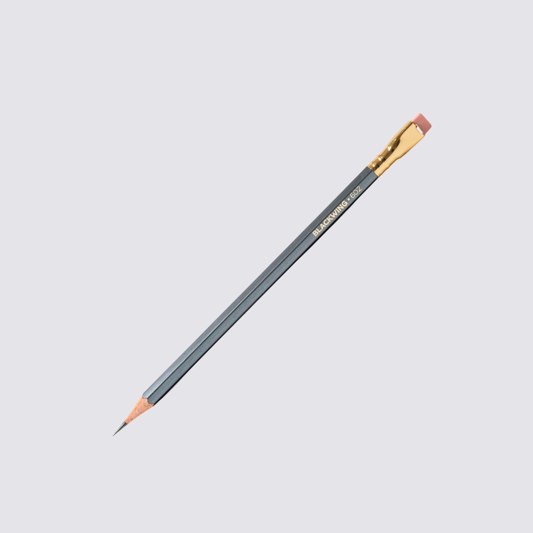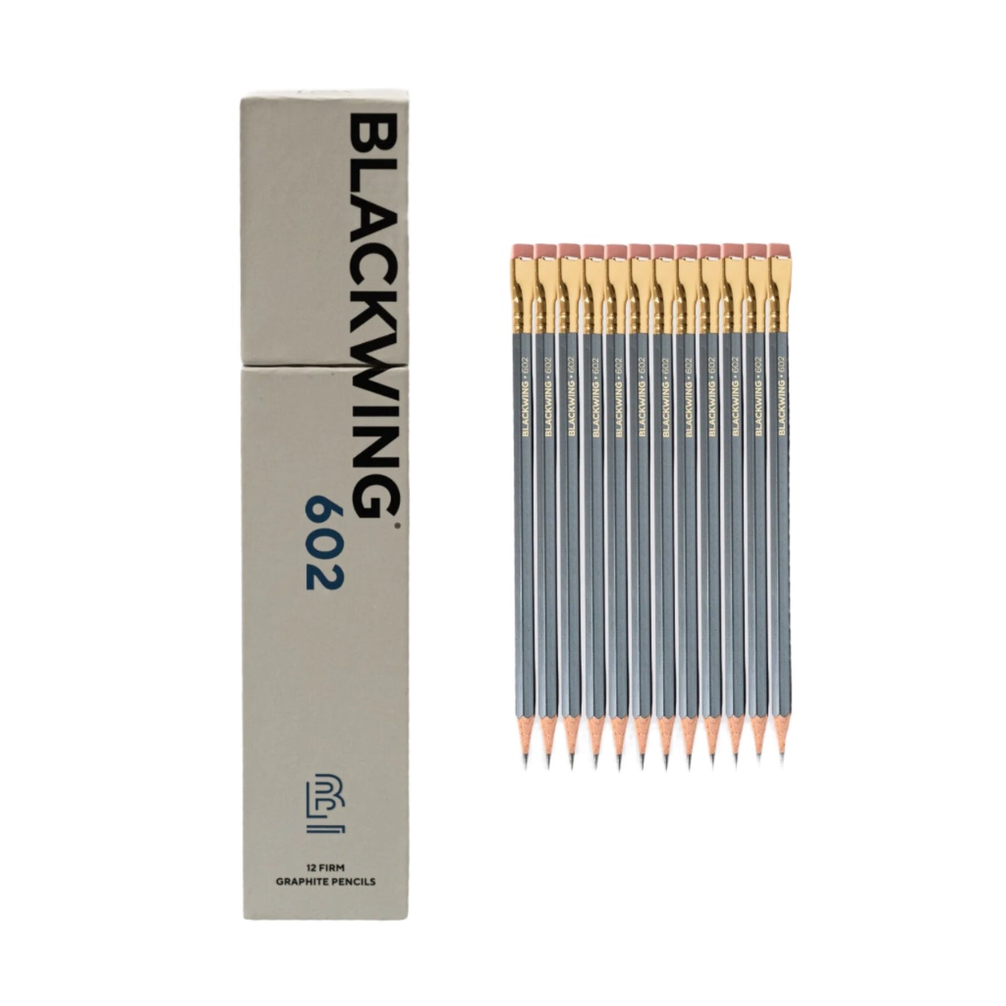 Blackwing pencils feature a gunmetal grey finish and iconic square Blackwing ferrule with a pink eraser. Blackwing 602 pencils come in a 12-pack gift box that doubles as a pencil cup.