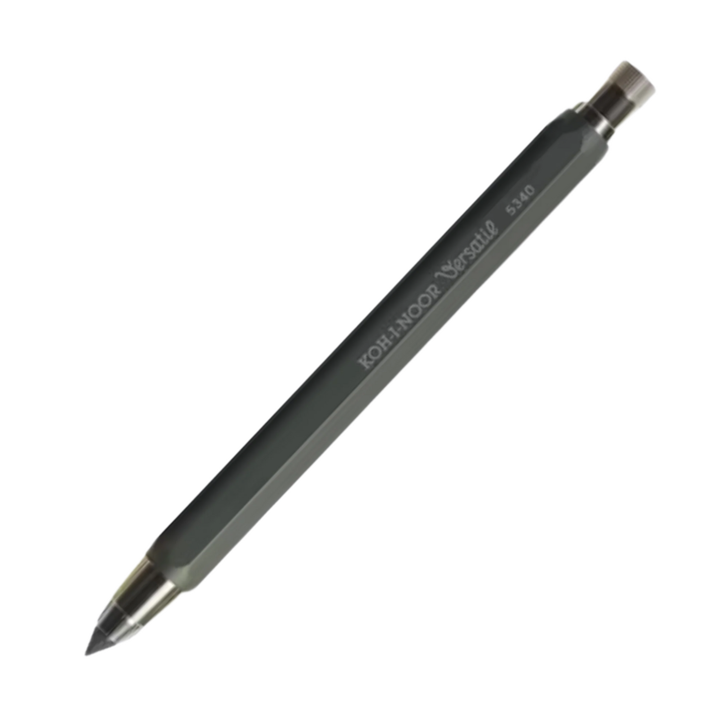 This chunky mechanical clutch pencil holds 5.6mm lead. Made from metal with a super weighty feel, simply unscrew the cylinder at the end to reveal a sharpener. Nifty!