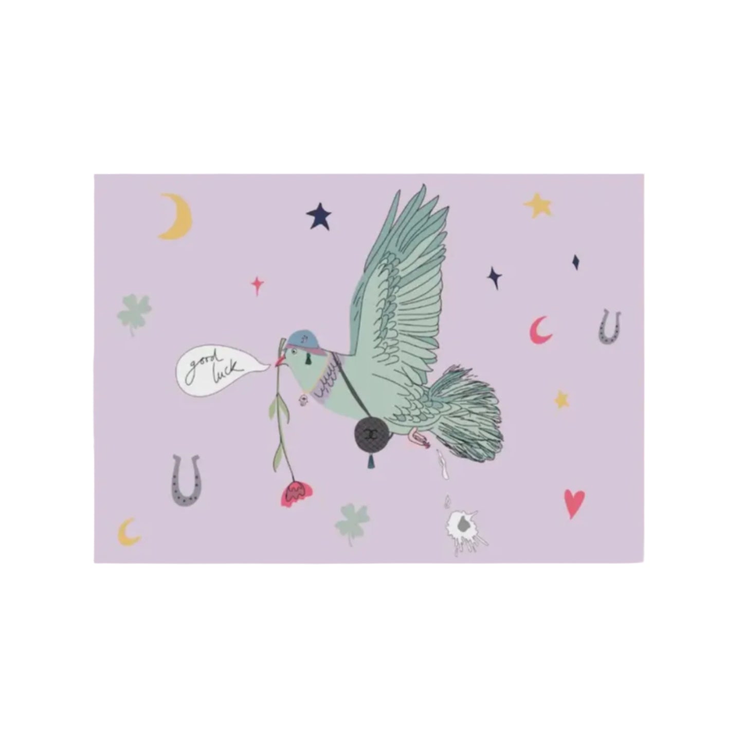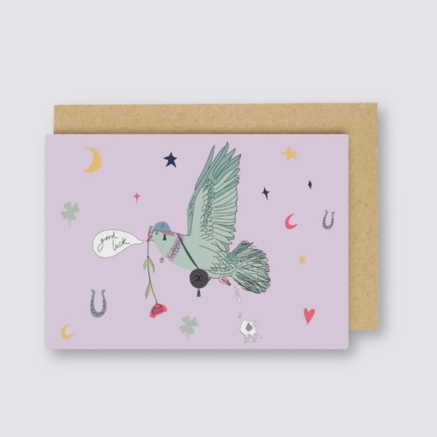 Wish them all the best with this lovely and funny good luck card! A funky pigeon is bringing all the luck in this illustrated greetings card.
