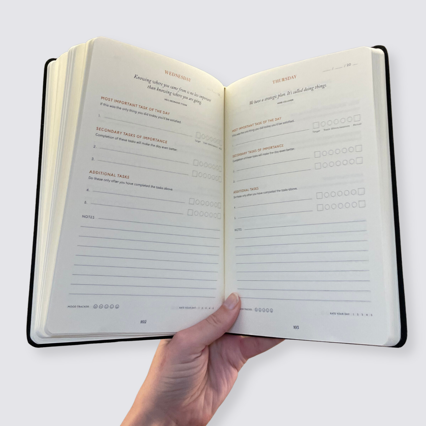 - Daily self-growth prompts and mood tracker to balance productivity and mindful living