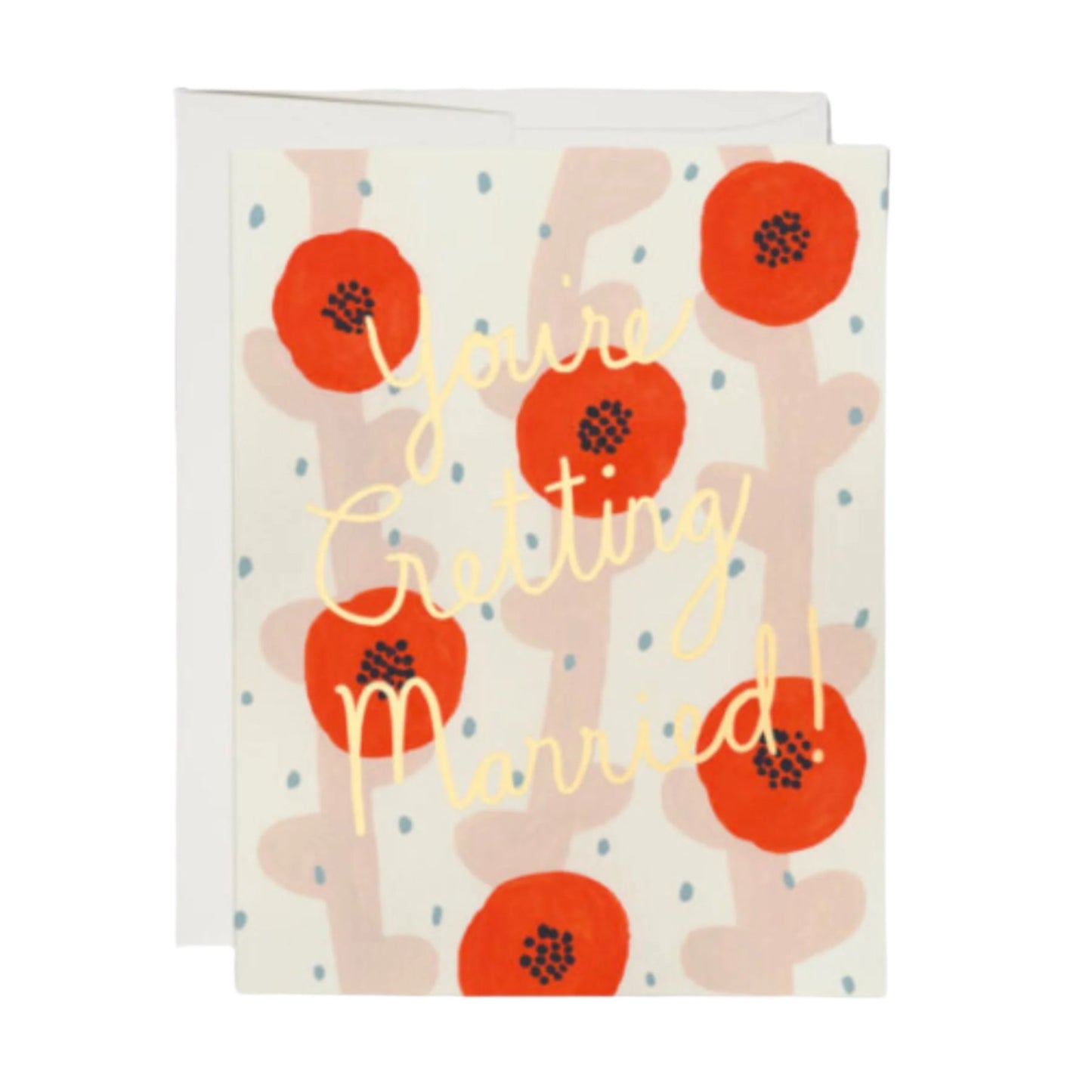 A joyful burst of poppies to say you're getting married! This celebratory card is all about playful romance. Bold red and pink abstract blooms pop against a clean backdrop, while gold foil lettering adds that just-right shimmer. Illustrated by the ever-charming Kate Pugsley, it's a love letter to love itself. Printed on recycled paper in Los Angeles by Red Cap Cards.