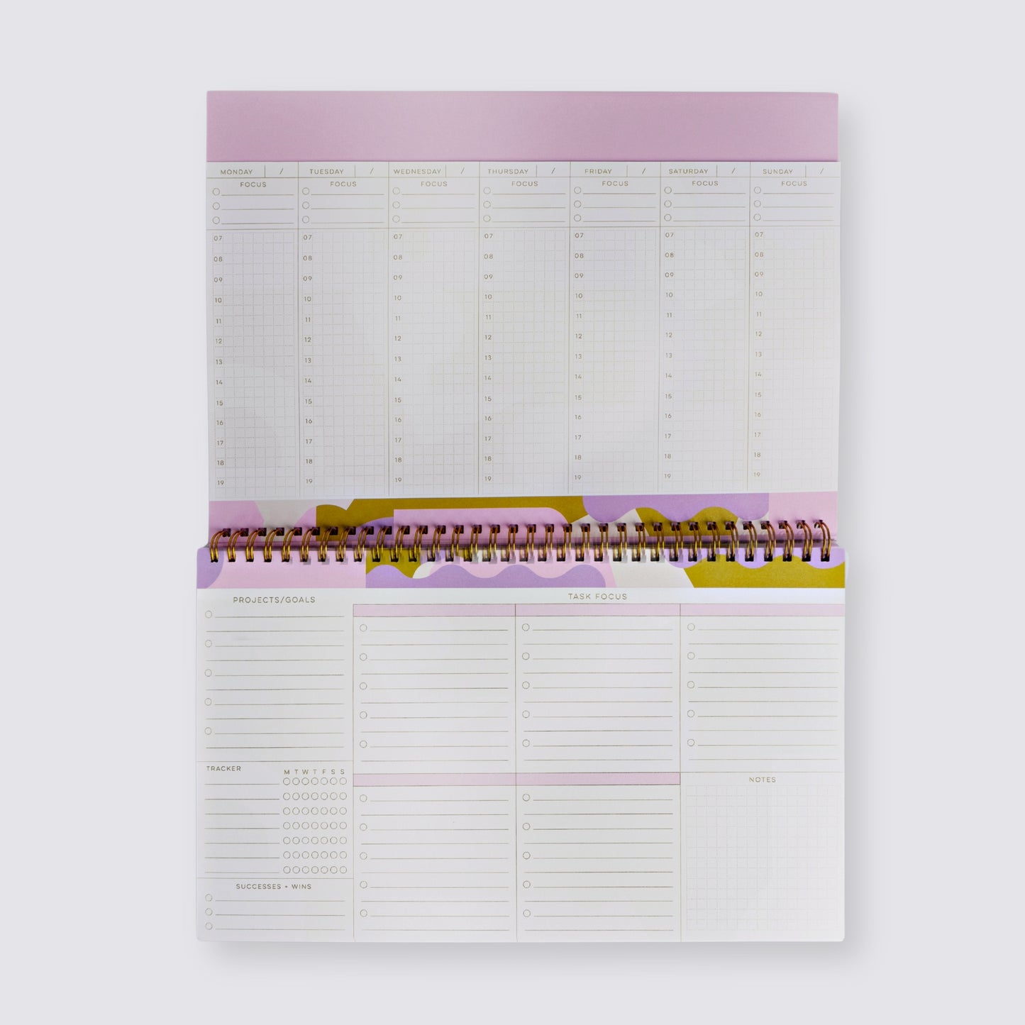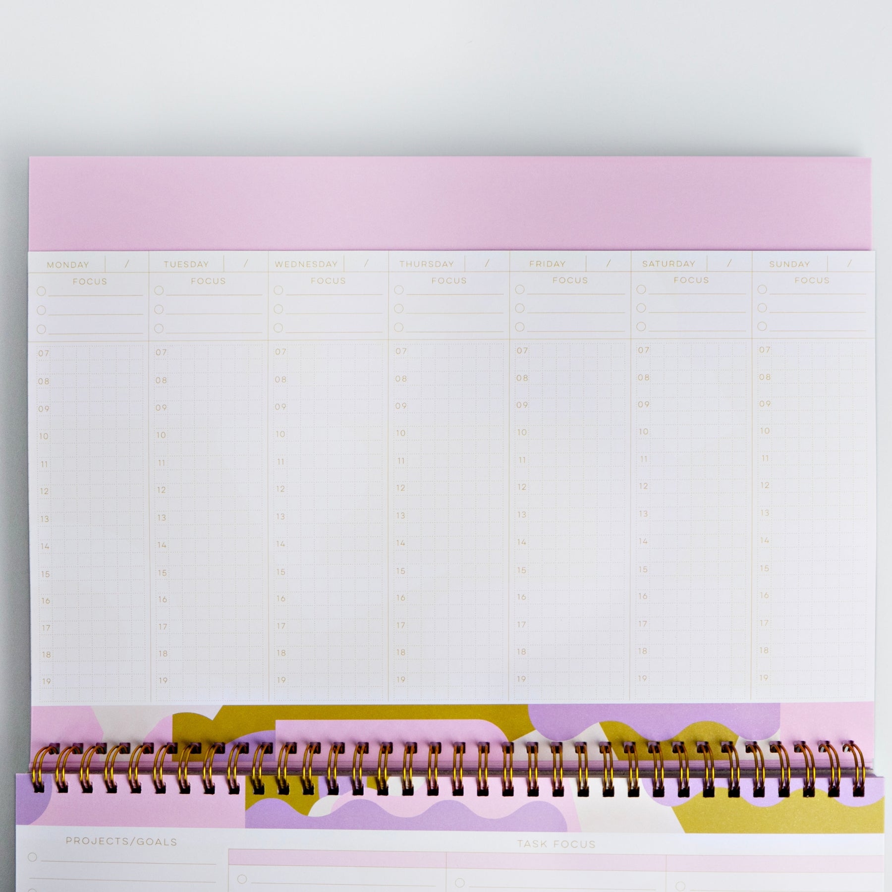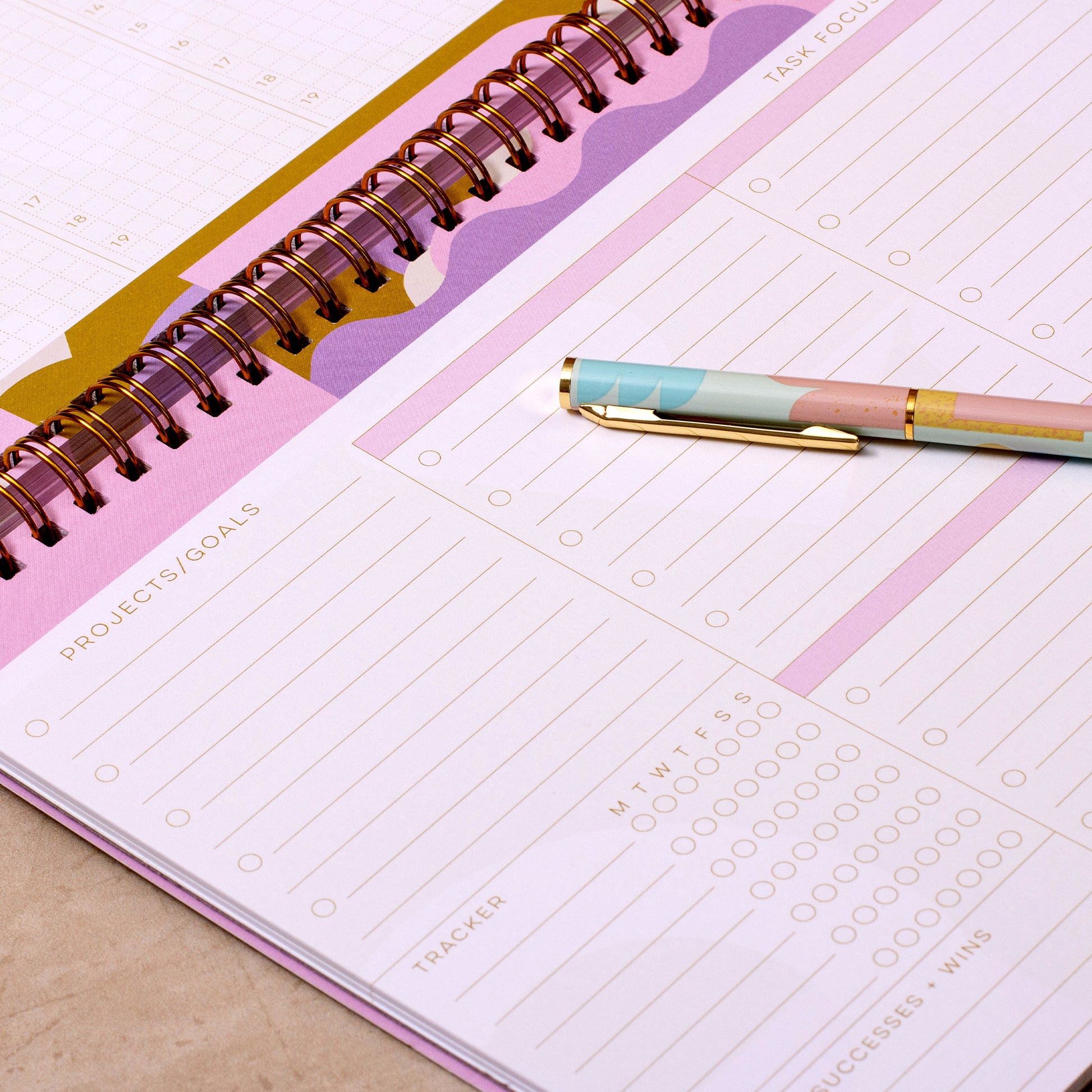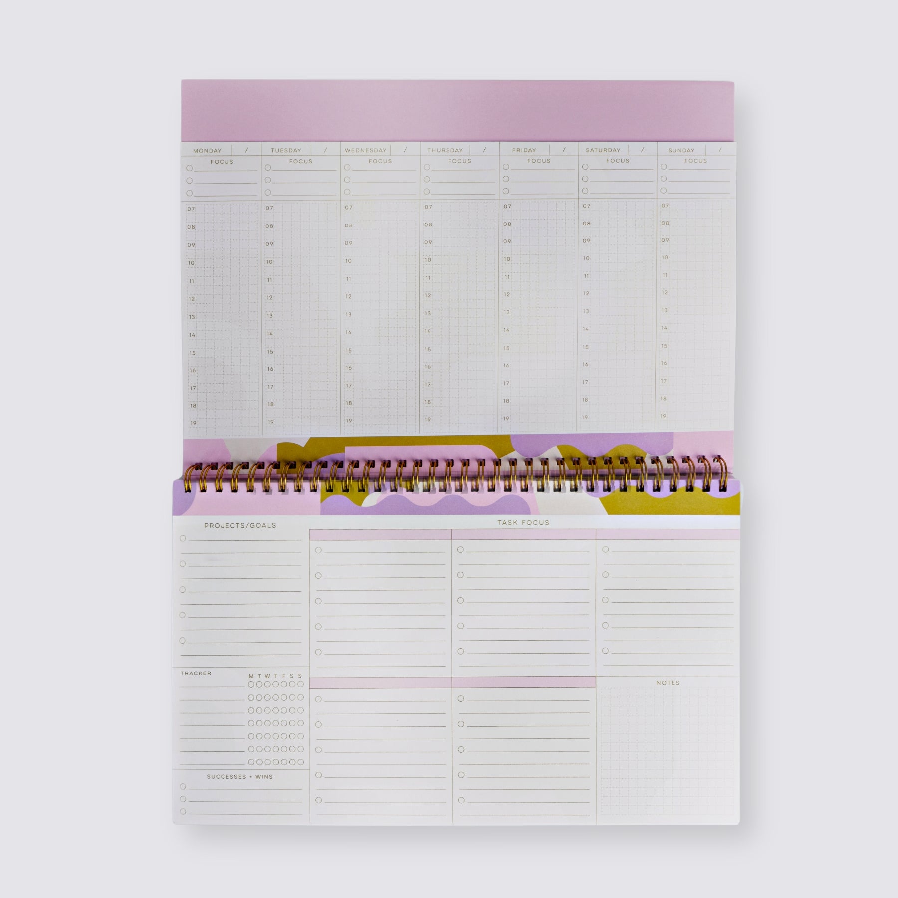 Designed to streamline your tasks and priorities, this desk planner offers 53 weeks of spreads to help you clear your mind and plan efficiently. Each spread features a weekly schedule with a focus highlight, alongside an organizer page meticulously designed to break down your tasks and priorities. With additional features like a tracker, space for weekly wins, and room for notes, this organiser is your ultimate all-around tool for staying on top of your game.