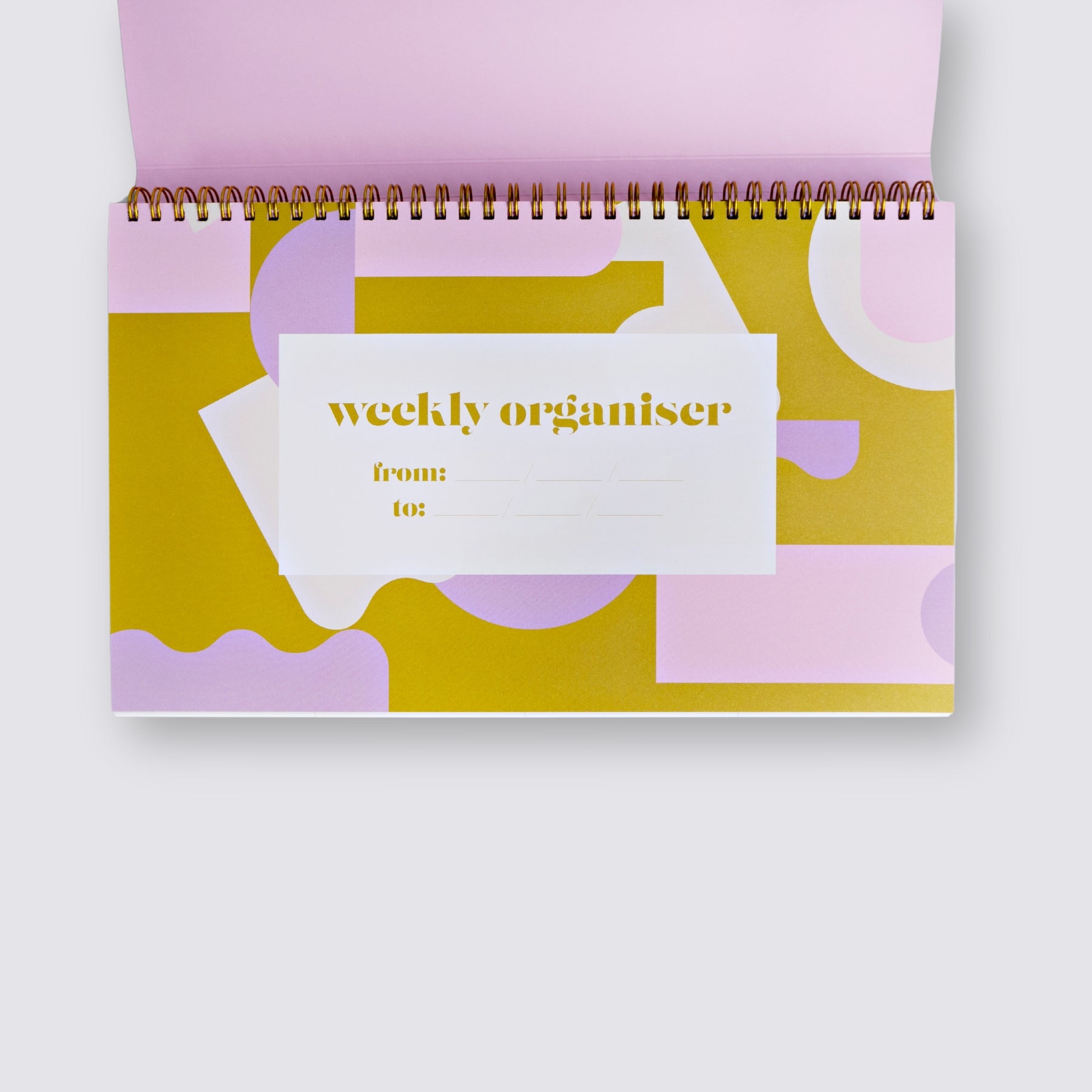 Get organised efficiently with this luxurious Undated Weekly Desktop Organiser. Featuring a striking Bauhaus inspired print on the cover, this desk planner is a stylish addition to your work space. Crafted from premium 300gsm card, the cover boasts durability and elegance, while the contrast inside cover.