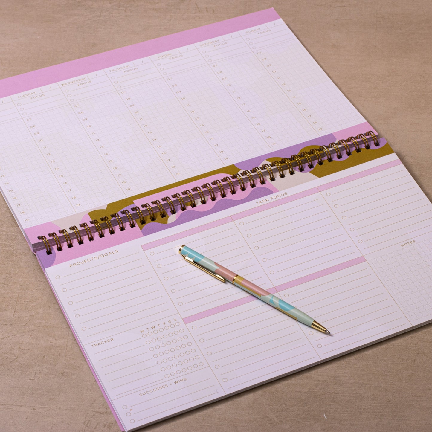 Constructed with brass wiro binding and 115gsm pages, this weekly planner ensures durability and practicality. It offers ample space for detailed planning while remaining sleek and portable. Made with care in the UK.