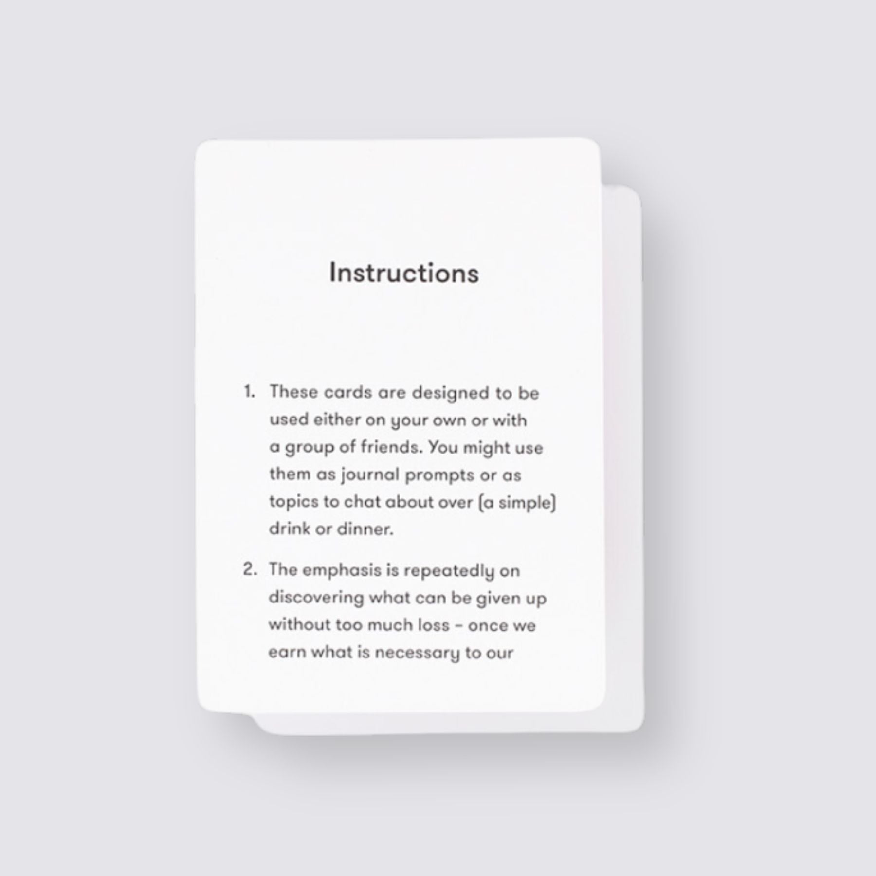 These 52 question cards give us confidence to assess what we might give up on and where our true focus should lie. They ask us to look at our careers, our relationships, our family lives, and our ambitions more broadly. In a few easy steps, the cards help us prioritise and sift – and, with gentle humour, guide us to the simpler lives we long for and deserve.