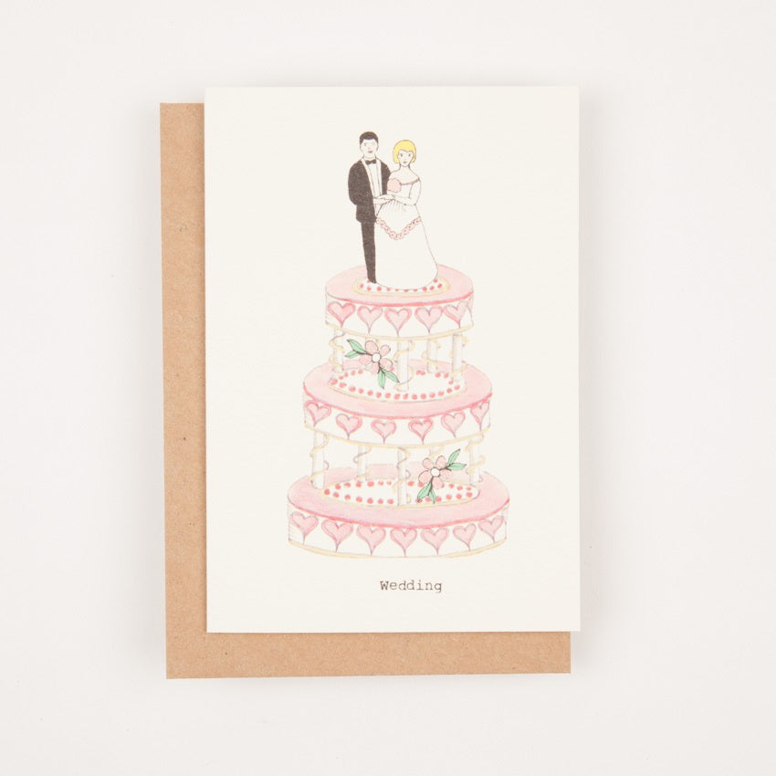 A beautifully textured wedding card featuring the couple on an extravagant cake from illustrator Rosie Wonders.
