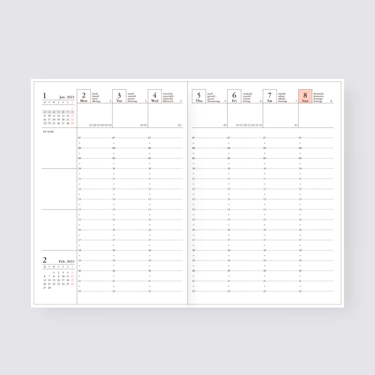 This diary has a double-page spread for each week. A vertical 16 hour schedule runs from 7am to 10pm so you can neatly and clearly set out your appointments and meetings, making the most of your time. Monthly overview spreads allow you to get ahead of your bigger picture planning before you delve into each week's tasks.