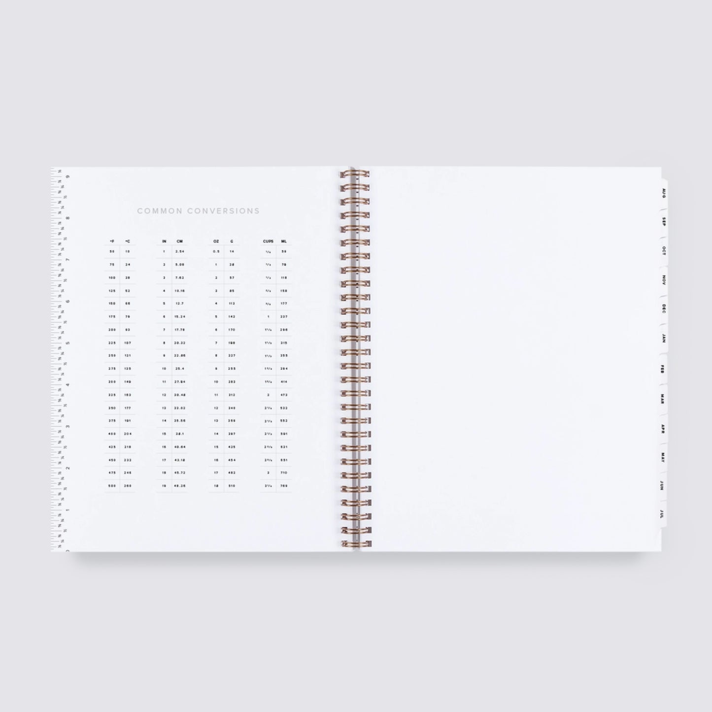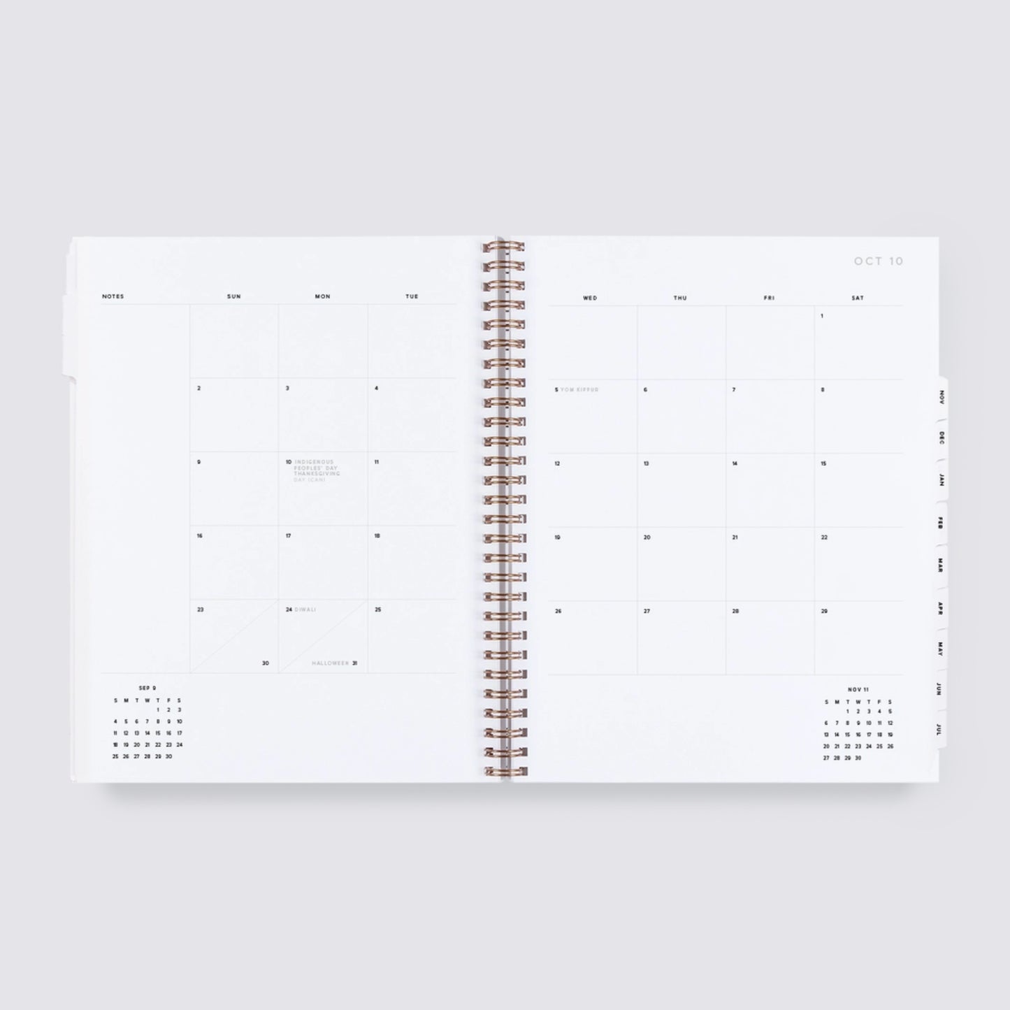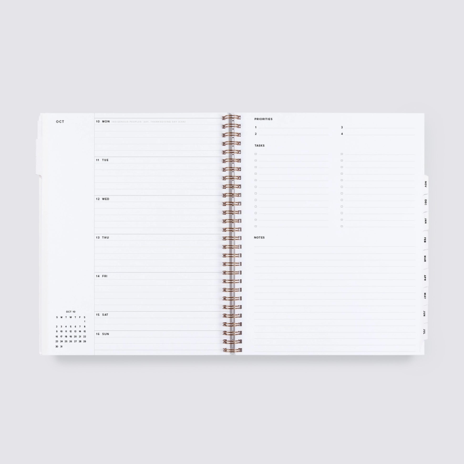 This luxurious planner features a water-resistant book cloth cover, brass wire-o binding and a subtly foil-stamped cover.