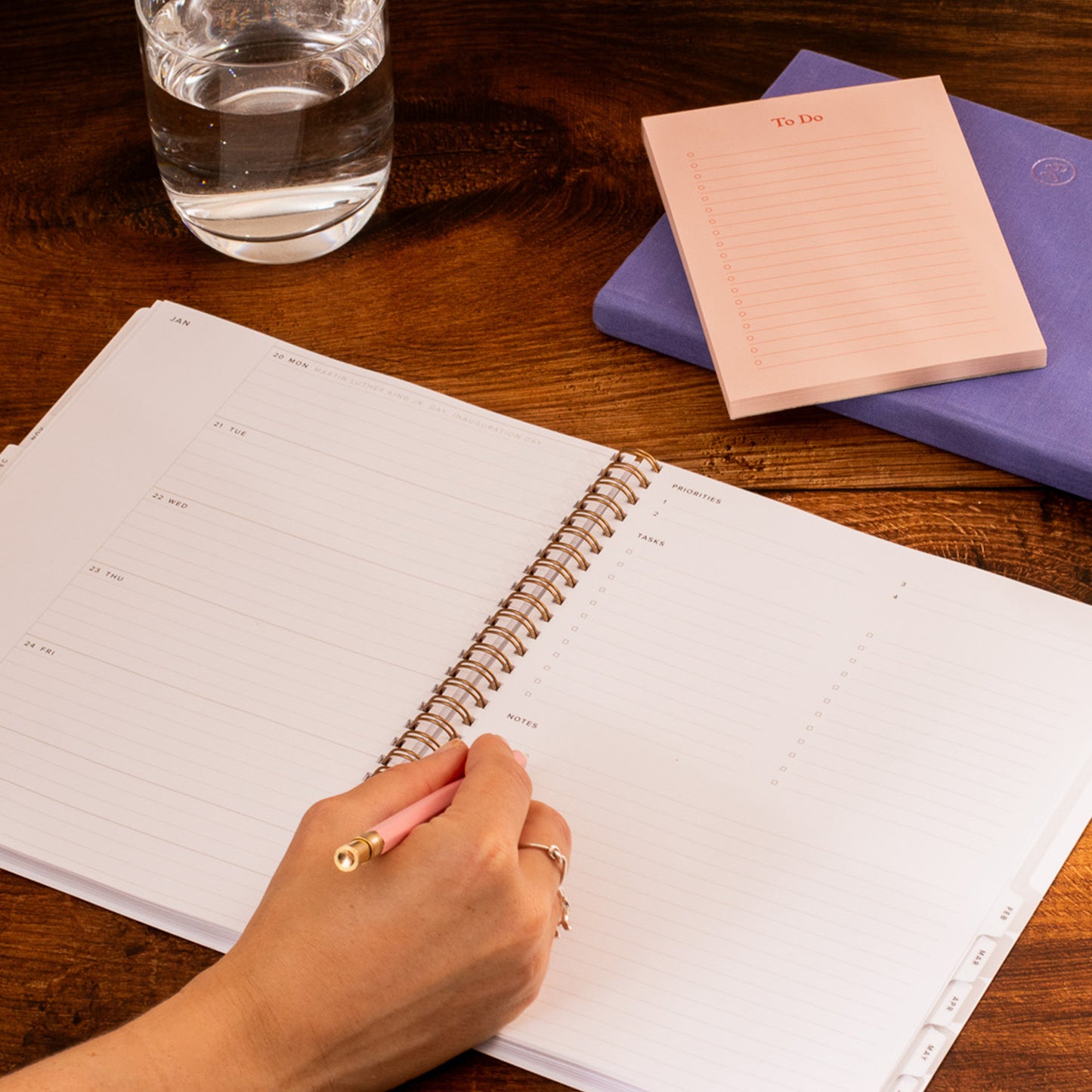 Each double page spread includes a weekly view on the left and a full page on the right for highlighting your priorities, making notes and composing a task list. It even has tickable check boxes for satisfying completion. Laminated monthly tabs allow for easy navigation throughout the year.