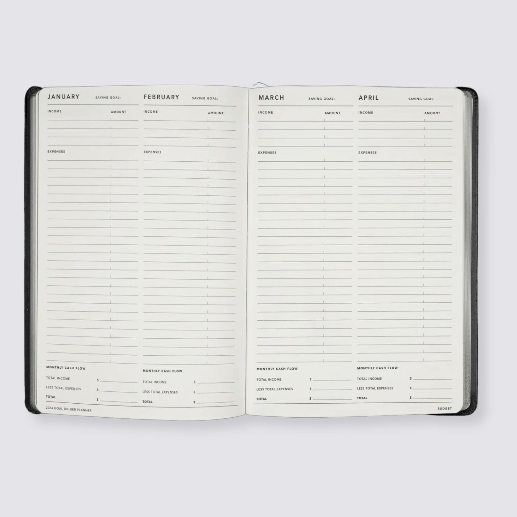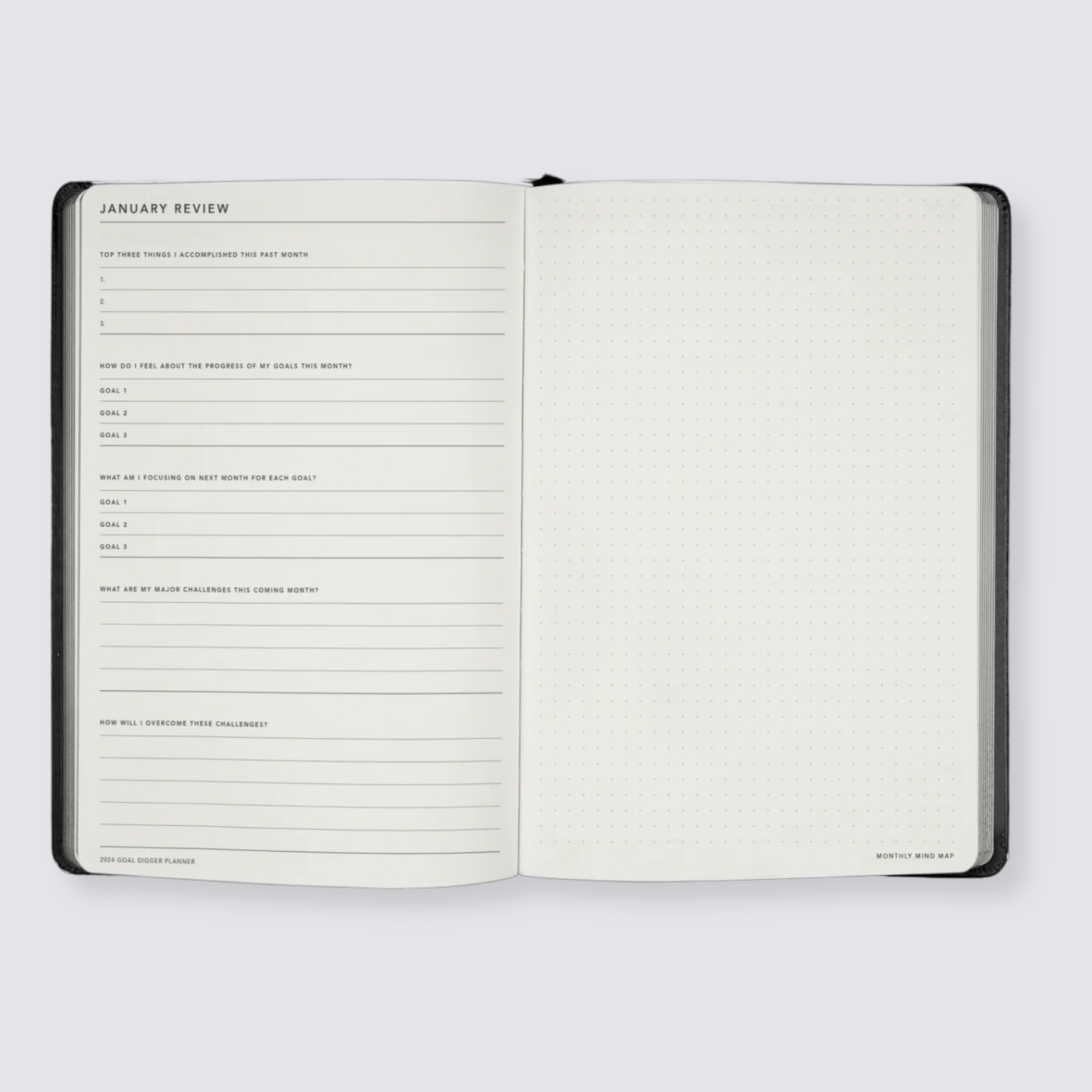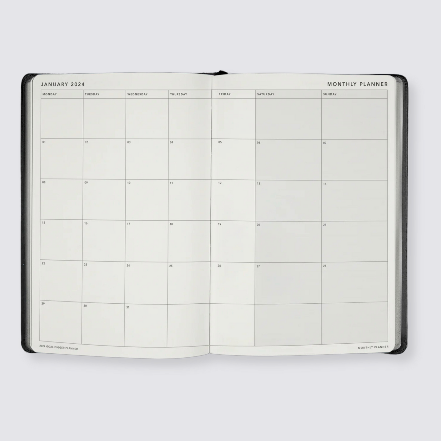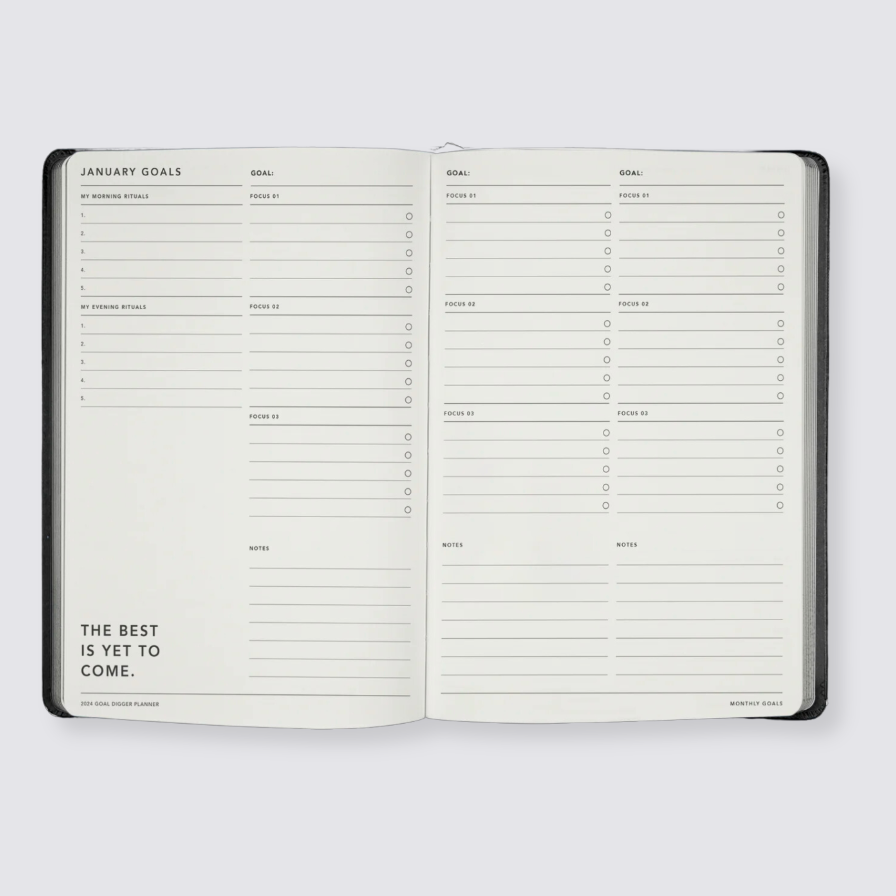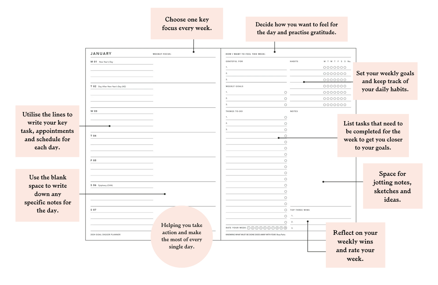 This incredible Goal Digger diary is the ultimate tool for success. It will guide you through setting ambitious goals for 2024, and keep you on track throughout the year to make sure you reach your full potential, achieve great things and have no regrets in 2024.
