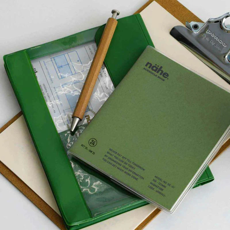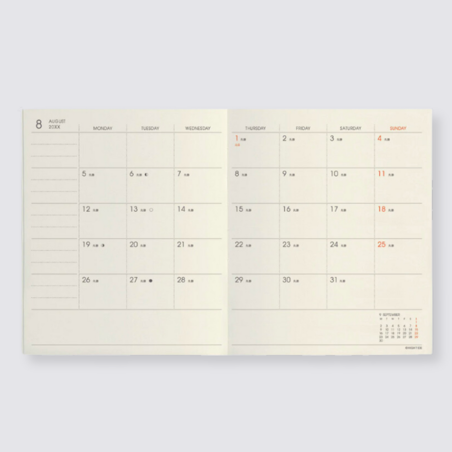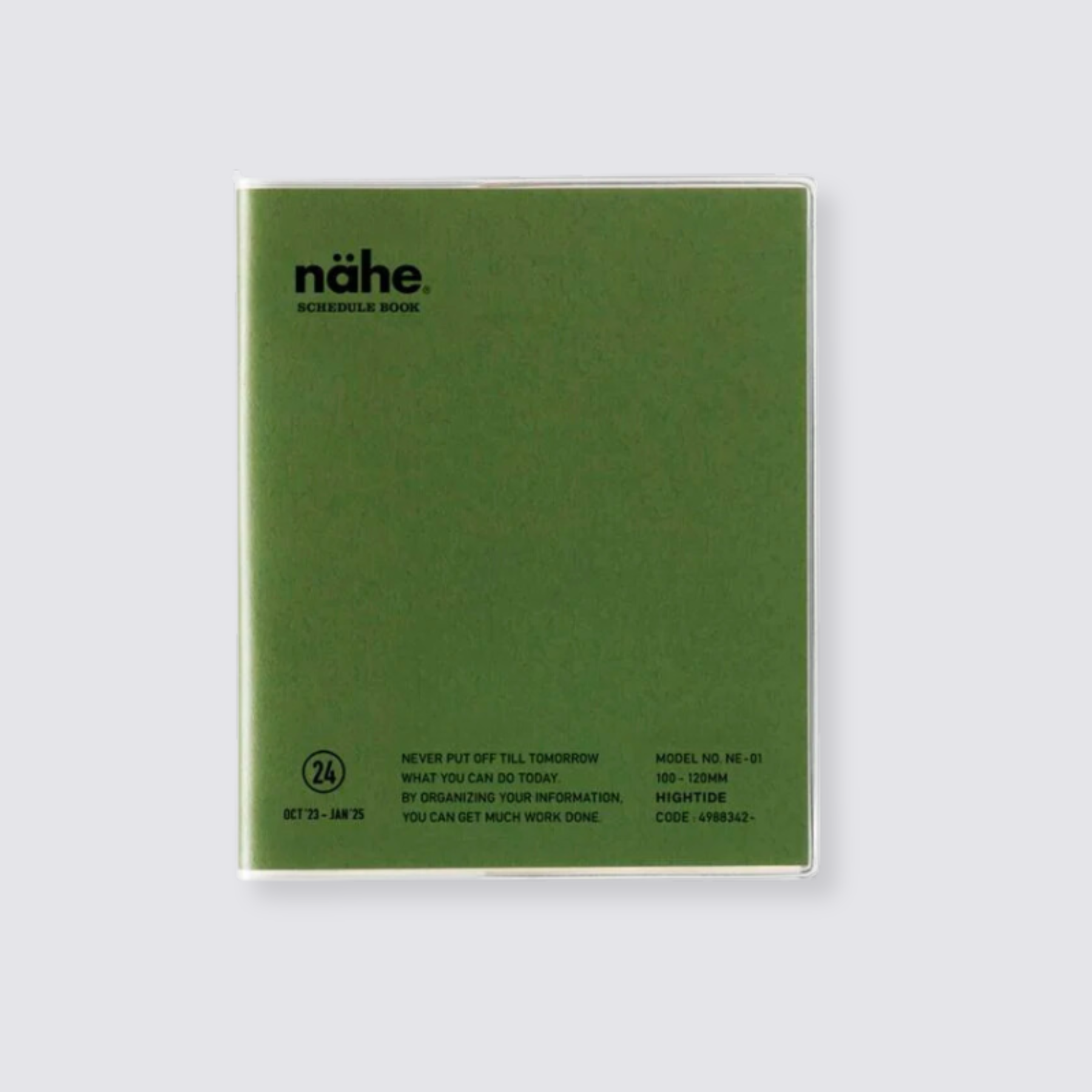 The Nahe Square diary in khaki for 2024 has a retro-inspired, minimal monthly format. The tiny, pocket-sized diary features monthly spreads, including space for memos and weekly tasks, as well as blank space for other to-do's or ideas. It also includes separate ruled pages dedicated to notes.