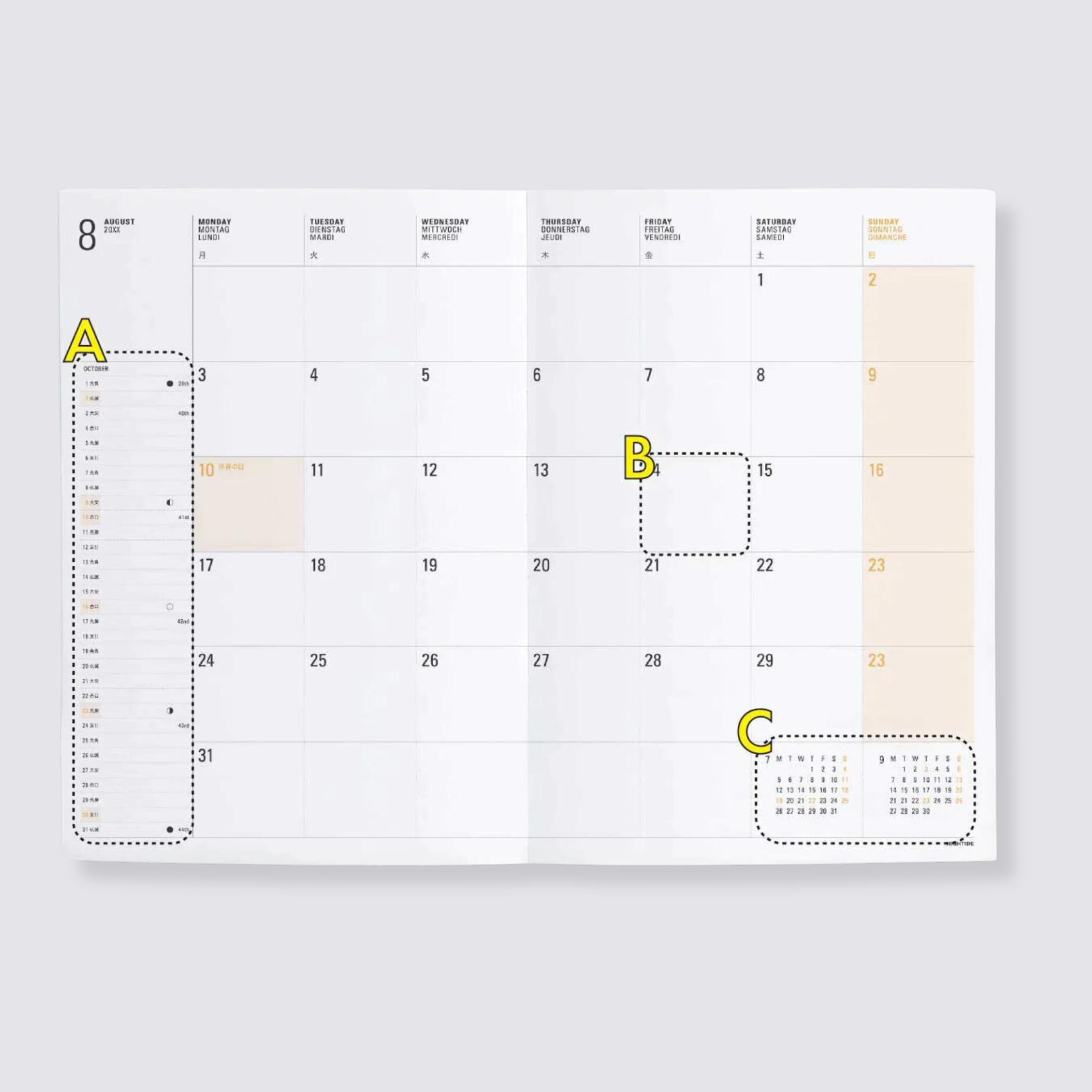 Nahe Vertical Weekly is a diary book by Hightide that well-known in simple graphic design and formats. This diary book provides both monthly and weekly schedules as well as sufficient spaces for notes. Each month is featured with monthly schedule followed by weekly schedule.