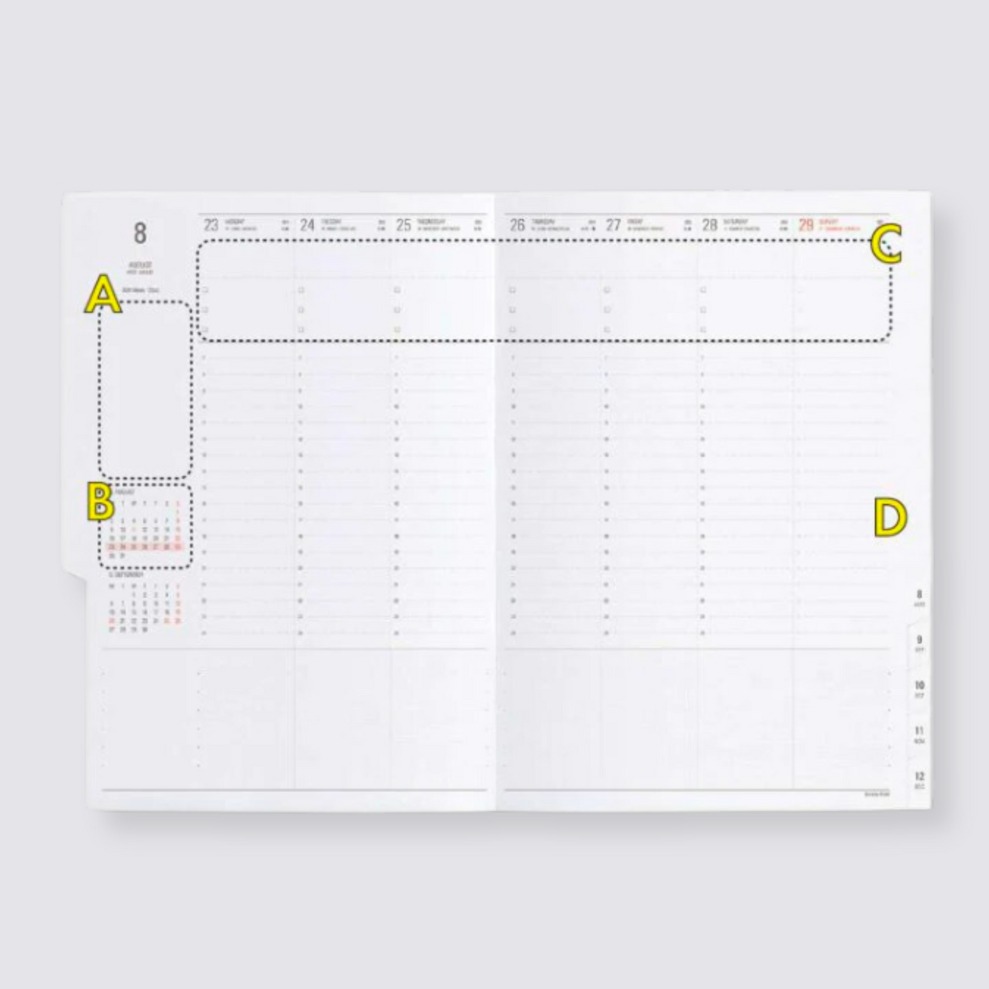 The layout provides a high degree of freedom and there are empty space at the top and bottom part which are useful. With its simple structure and spaces, you could use it as you like in your own style such as to-do lists, important notes, or thought of the day.