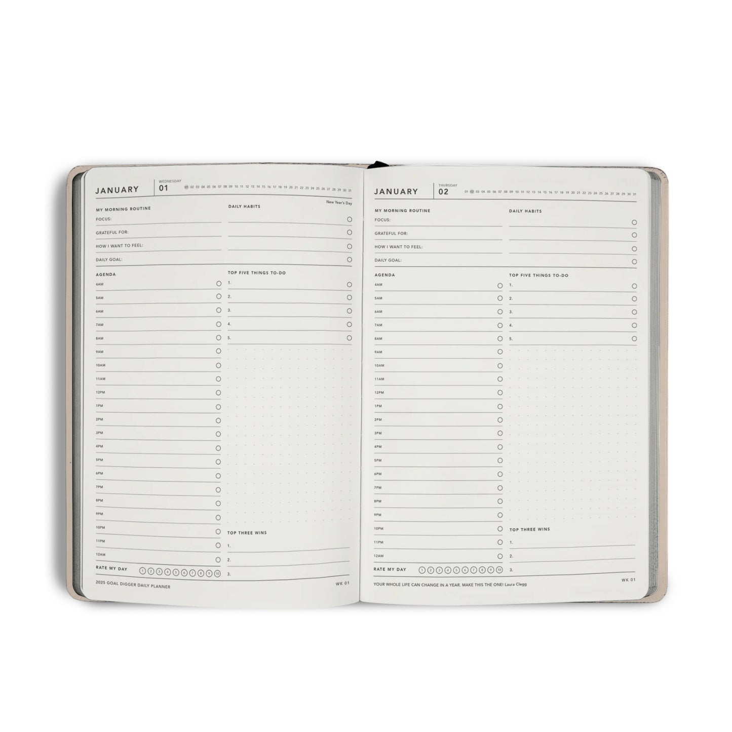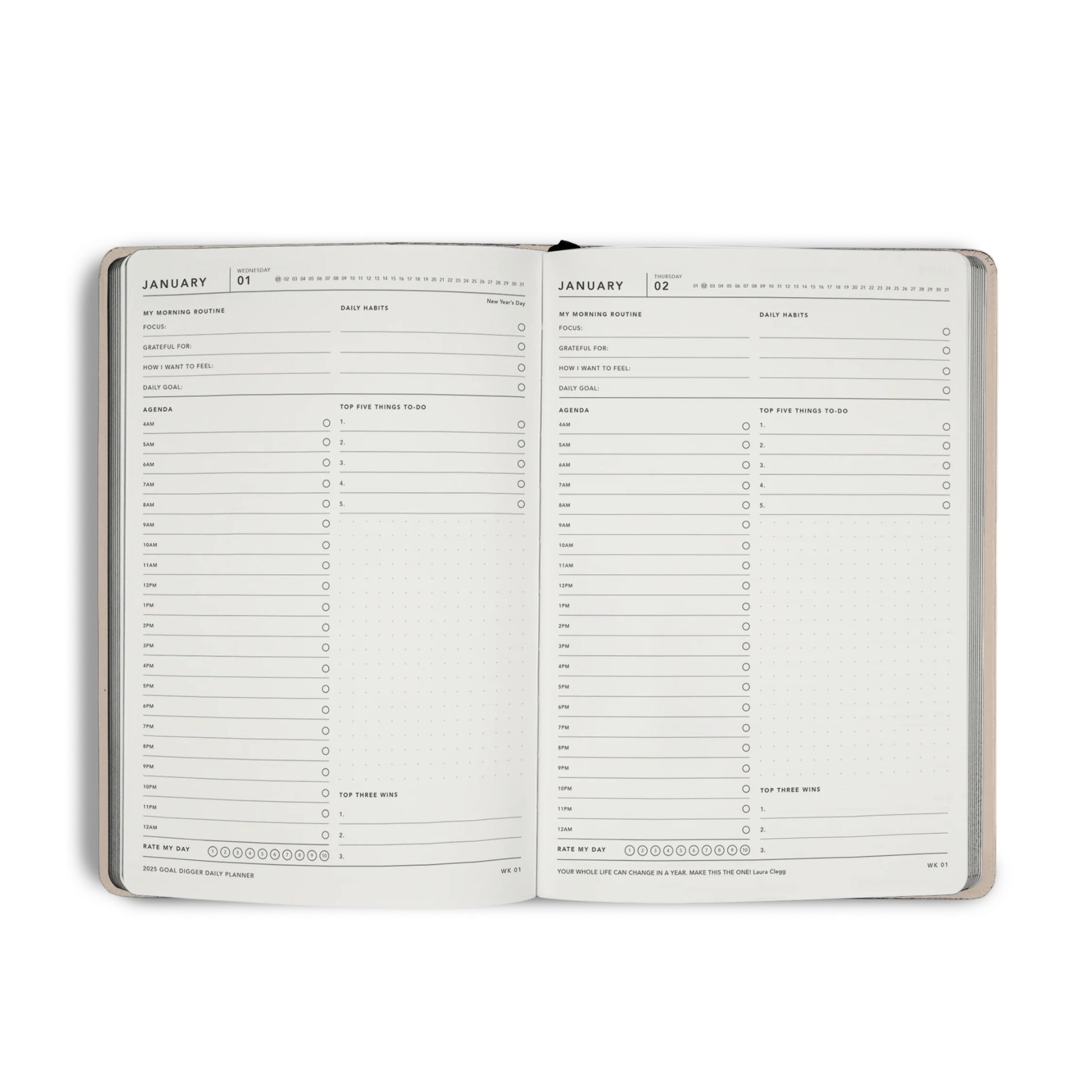 The Daily Goal Digger planner is packed full of smart features designed to help you be the best that you can be. The day-to-page format allows you to break down what you need to do, monitor it, and achieve it.