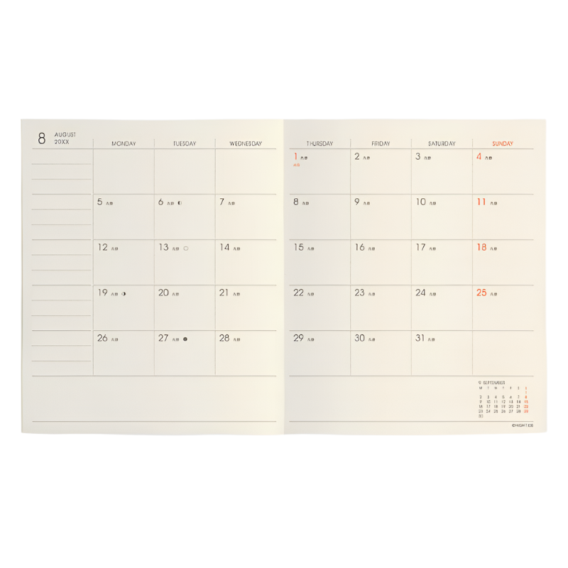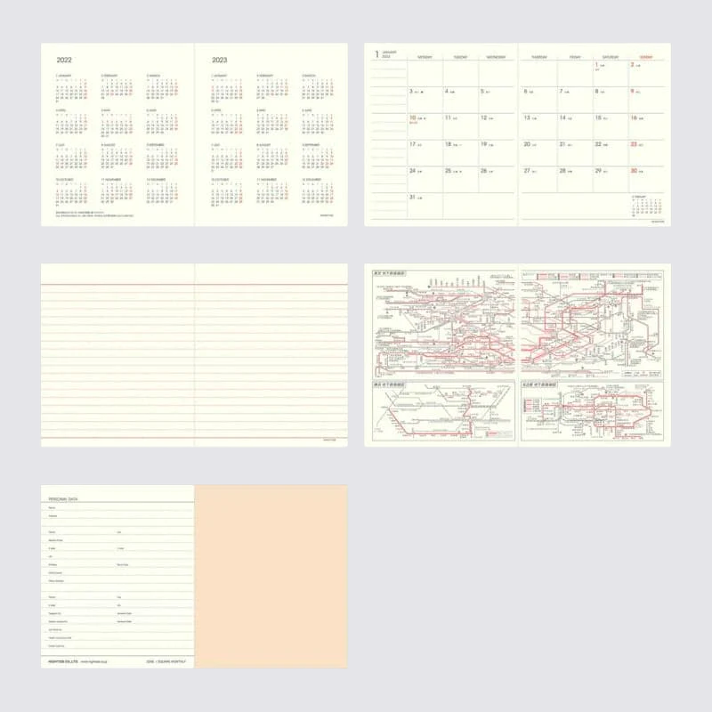 The Nahe Square diary for 2025 Diary has a retro-inspired, minimal monthly format. The tiny, pocket-sized journal features monthly spreads, including space for memos and weekly tasks, as well as blank space for other to-do's or ideas. It also includes separate ruled pages dedicated to notes.