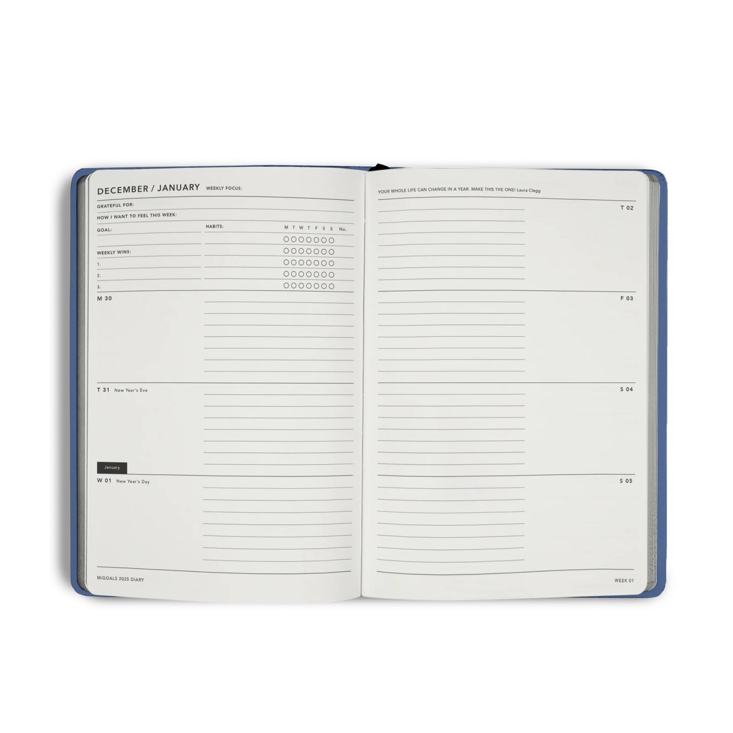 The 2025 Weekly Spread planner is formatted into a double-page spread for each week. The week always starts with setting your focus and goal, writing what you’re grateful for, and how you want to feel.