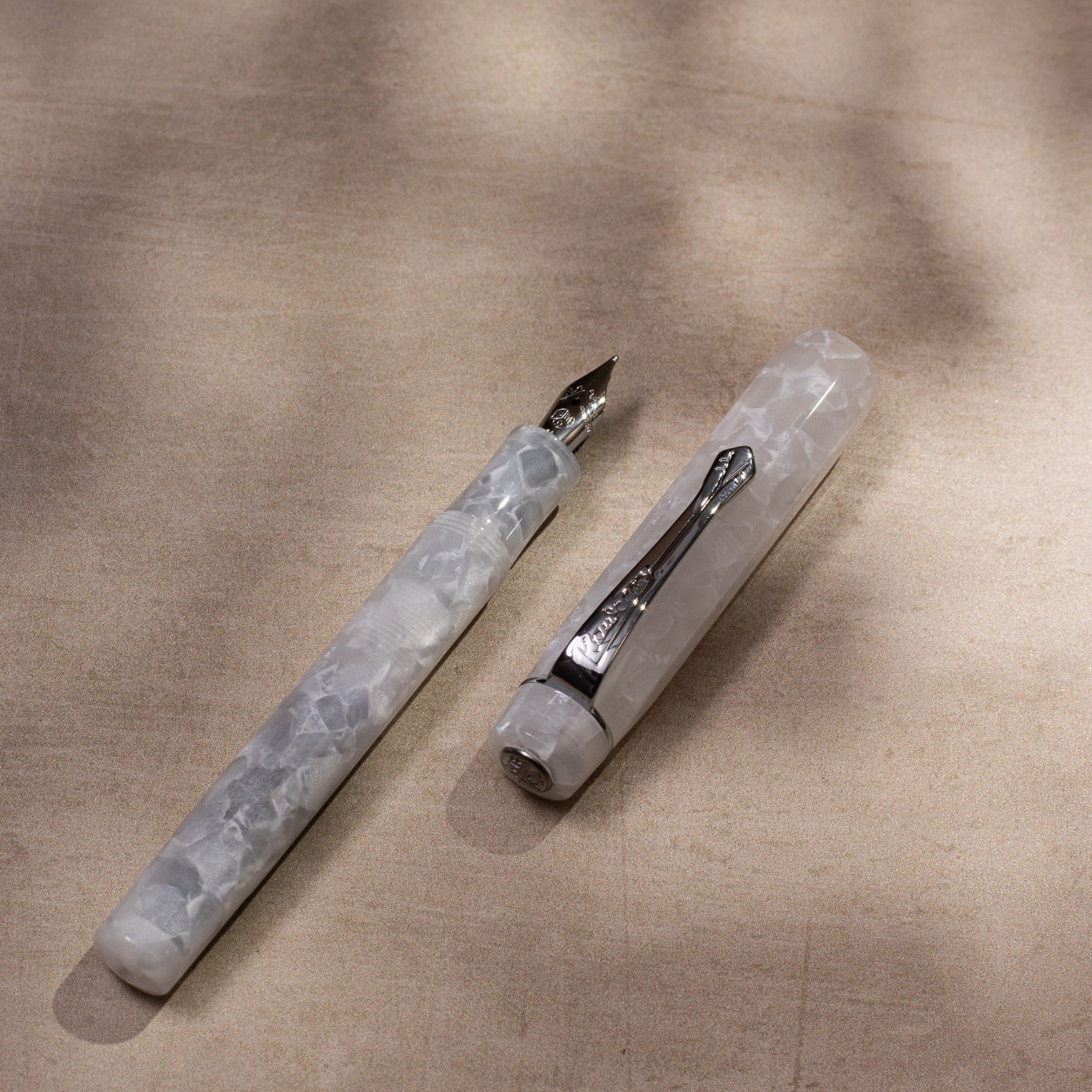 The unique and cracked texture of the high-quality acrylic housing gives the writing instrument a very thrilling look. The different translucency of the structured material creates an especially characteristic depth. The light is caught and reflected in multiple directions in a fascinating way. The silver-plated elements complement the icy appearance of the fountain pen.