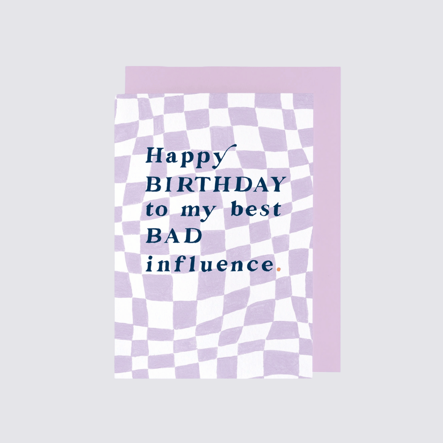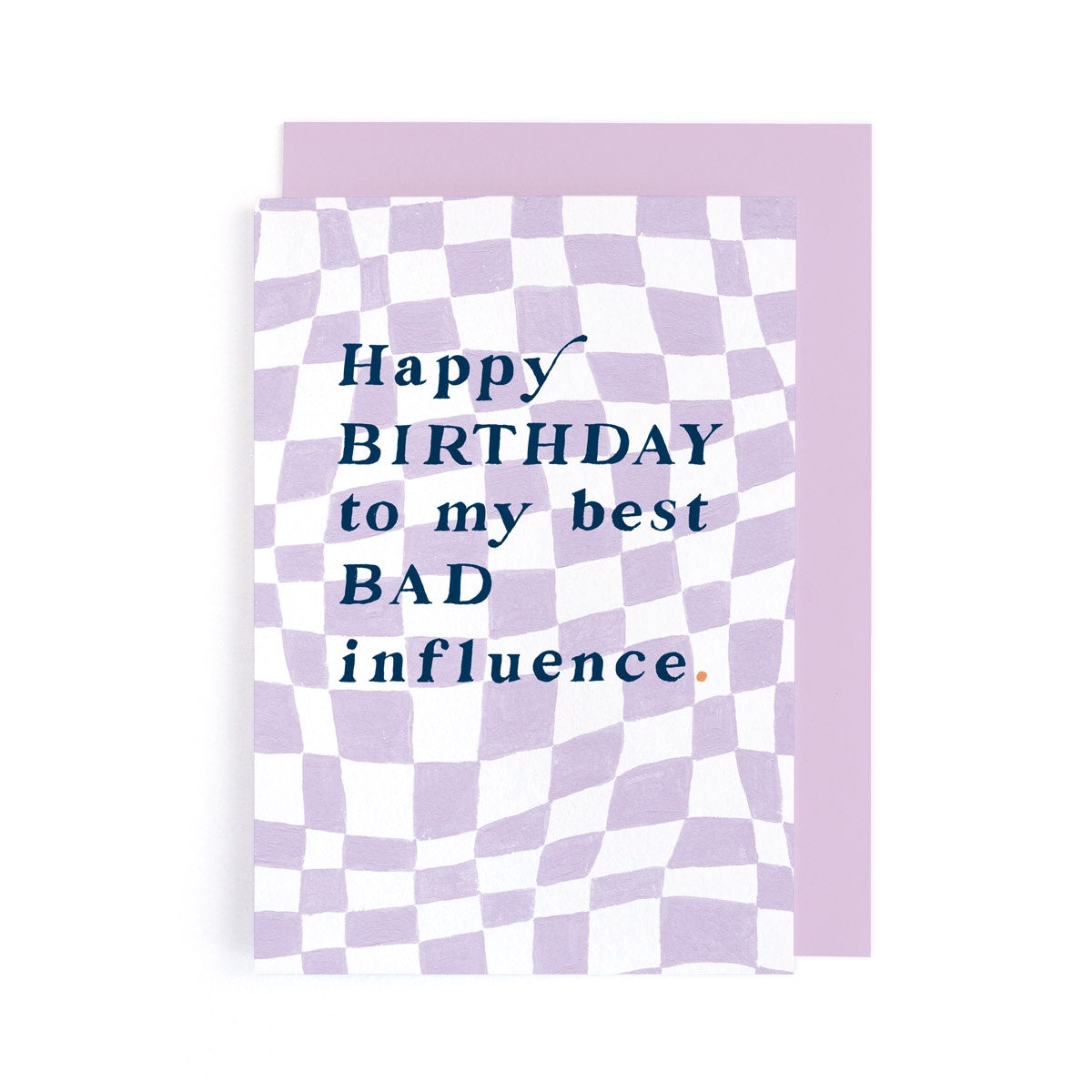 A luxury arch-shaped birthday card from Sister Paper Co., creators of playfully illustrated paper goods. Send greetings with wholesome and heartwarming illustrations. Celebrate your sidekick’s best traits with this jokey card. Featuring the text ‘Happy birthday to my best bad influence’ with a stylish checkerboard pattern.
