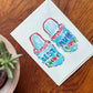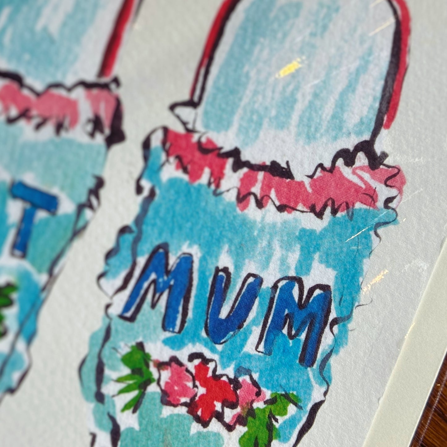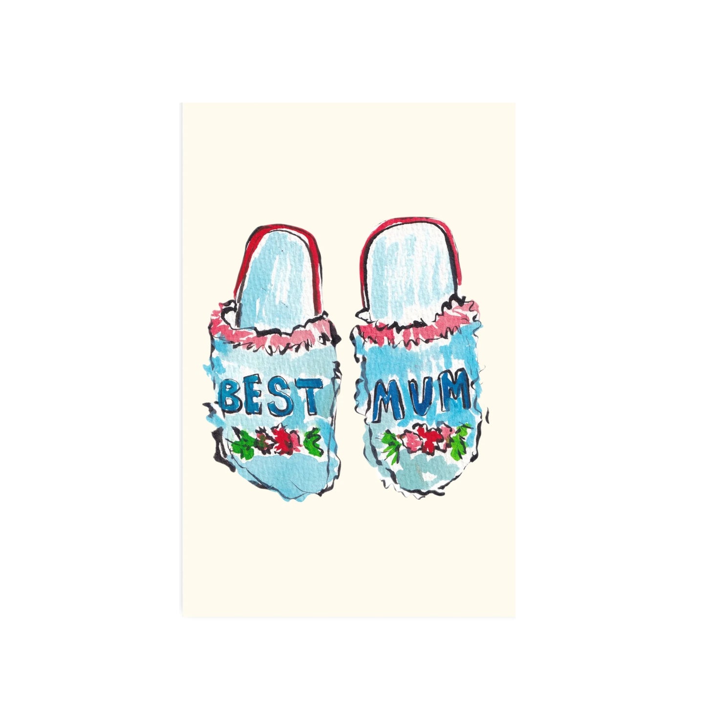 A handpainted watercolour card design featuring two funky illustrative slipped with the worlds 'best mum' on each slipper. Printed on high-quality watercolour textured paper. The perfect greetings card to present to your mum this Mother's Day or a birthday - anytime you want to write a little note of appreciation to your mumma! The inside is blank for you to fill with all of your kind words.