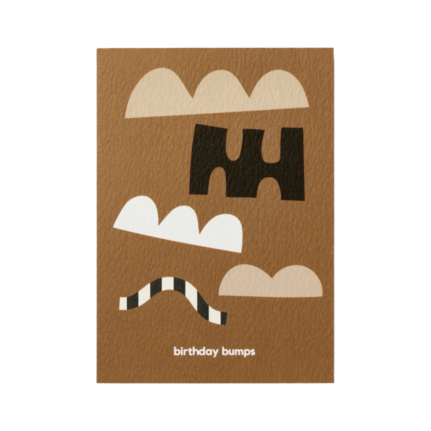 A playful birthday card featuring bumps of all shapes and sizes. In muted browns, sand , black and white, this is a lovely card.