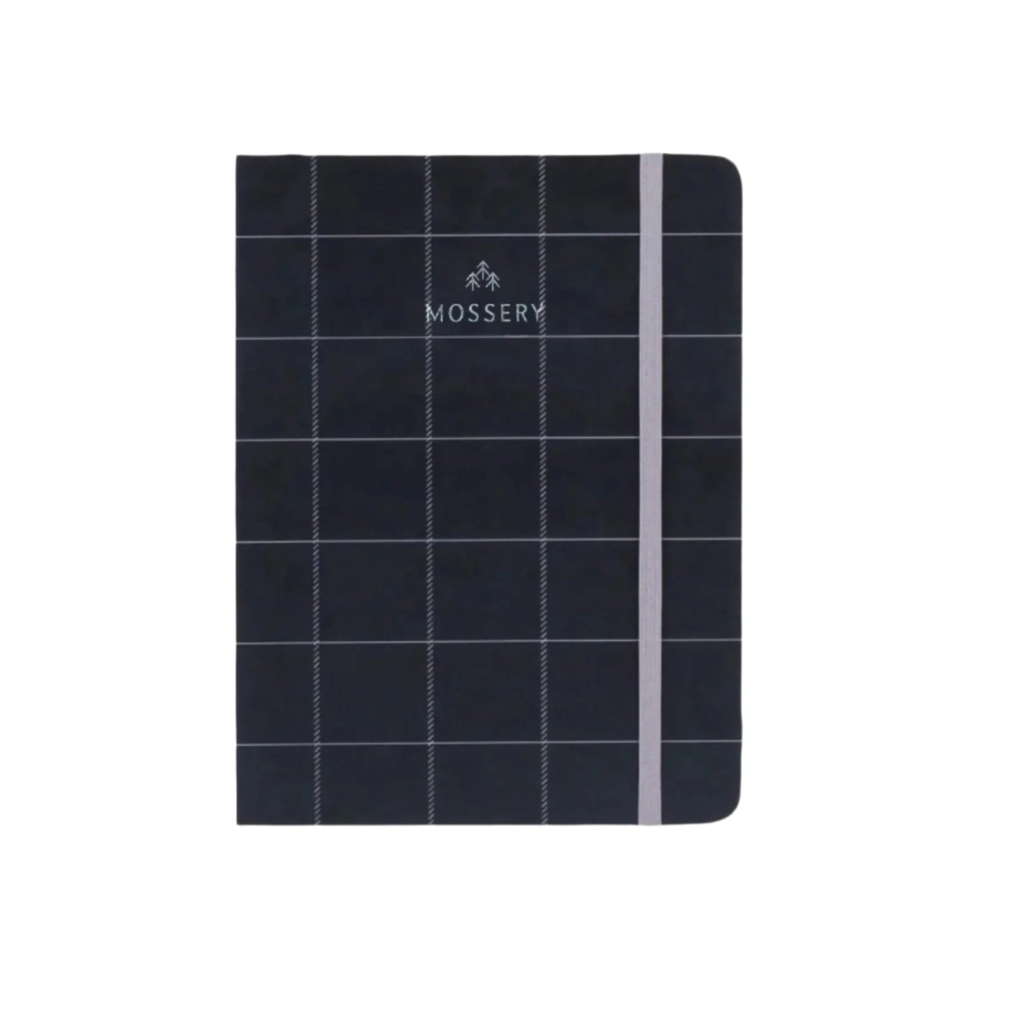 A refillable Mossery notebook with plain paper inside. This notebook has a hard cover in black plaid.