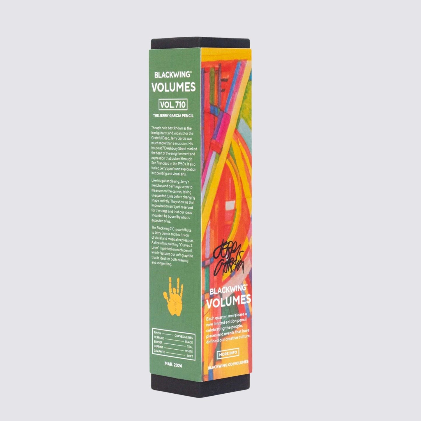 The Blackwing 710 is our tribute to Jerry Garcia and his fusion of visual and musical expression. A slice of his painting “Curves & Lines” is printed on each pencil, which features our soft graphite that is ideal for both drawing and songwriting.