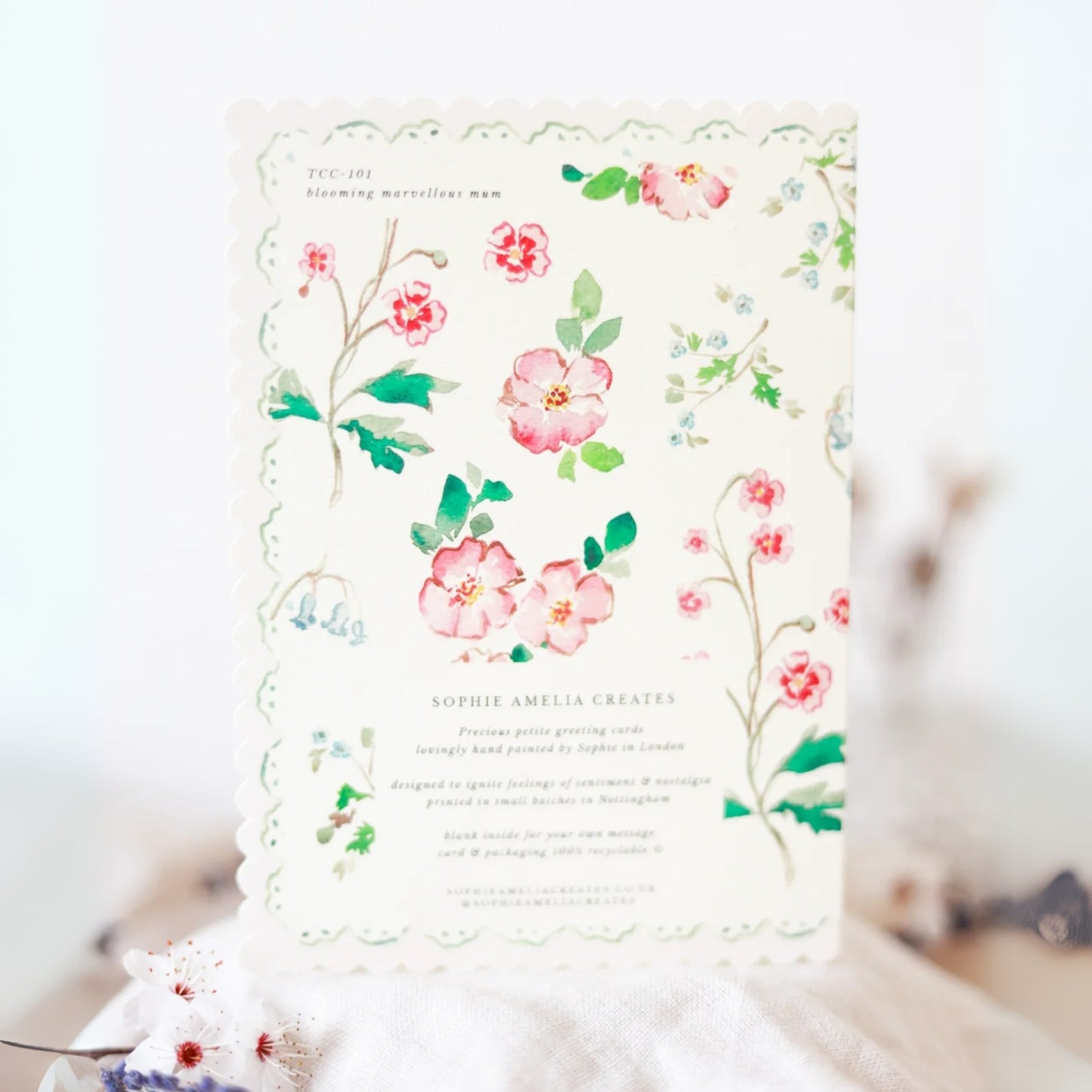 A lovingly hand-painted Mother's Day watercolour illustration. This scalloped card on beautiful textured paper is printed in small batches and has an accompanying envelope. The paper is fine, high quality 300gsm, with die-cut scalloped edge.