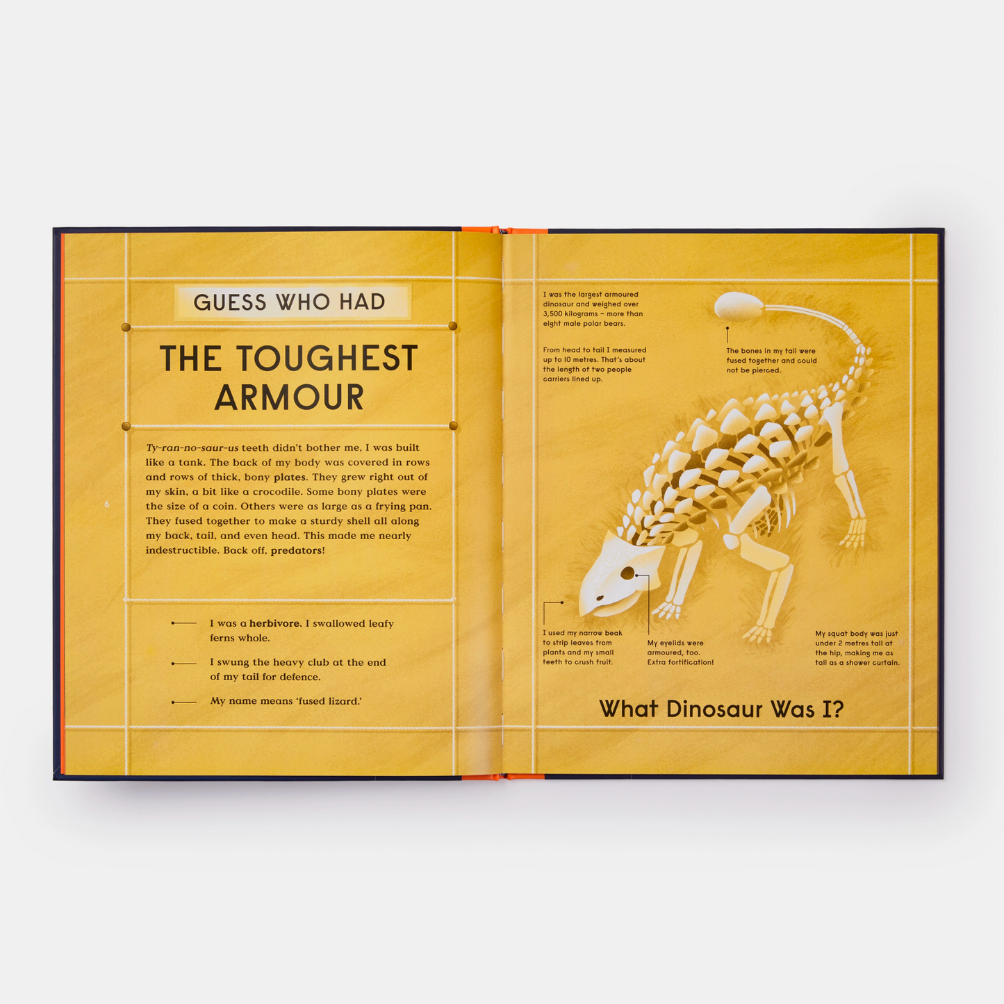 In this interactive book with touch-and-feel skeletons, ten record-breaking dinosaurs are introduced through a guessing game with clues. Readers examine the prehistoric skeletons and guess and read a series of boastful hints to guess the mystery dinosaur. The answers are uncovered in stunning page-turn reveals, featuring vibrant scenic habitats and a few reasons why each dinosaur is so special. The showstopping final pages make a clever connection between the 10 extinct dinosaurs and some of their contemporary counterparts.