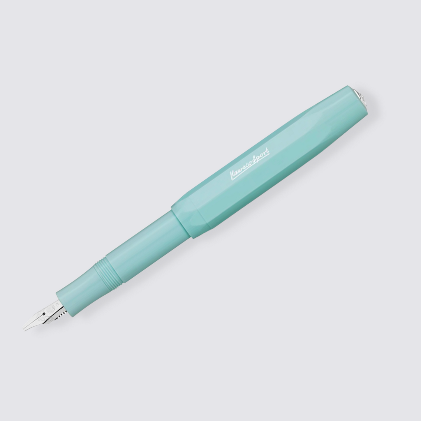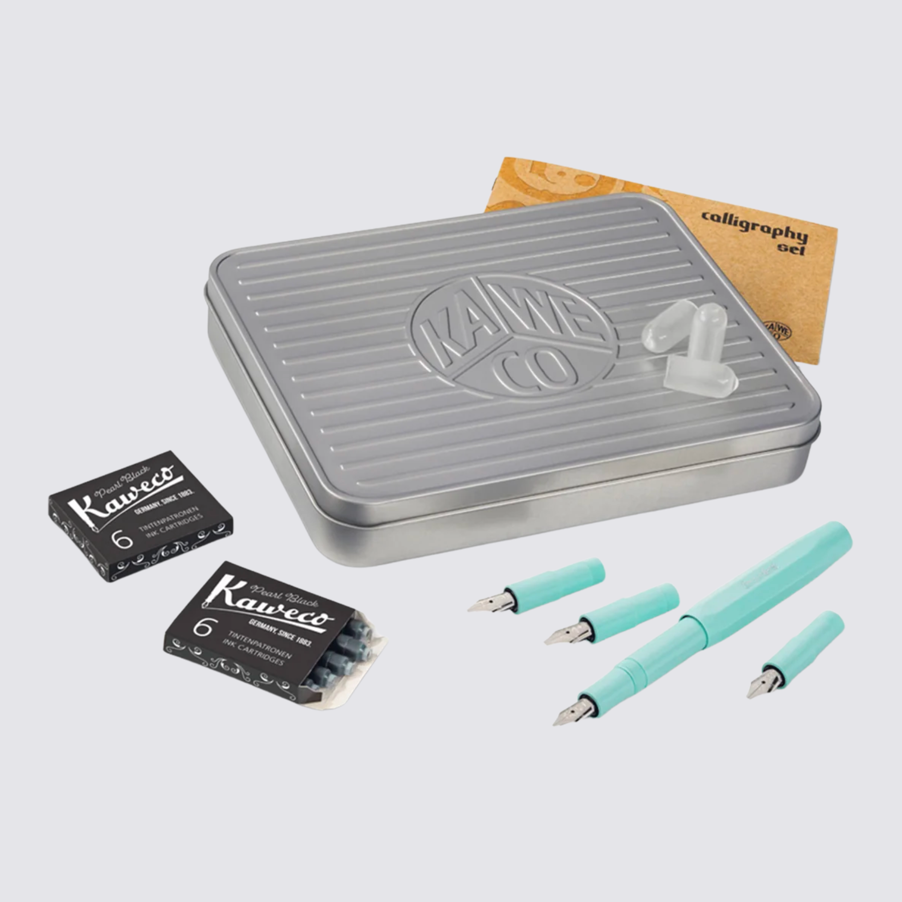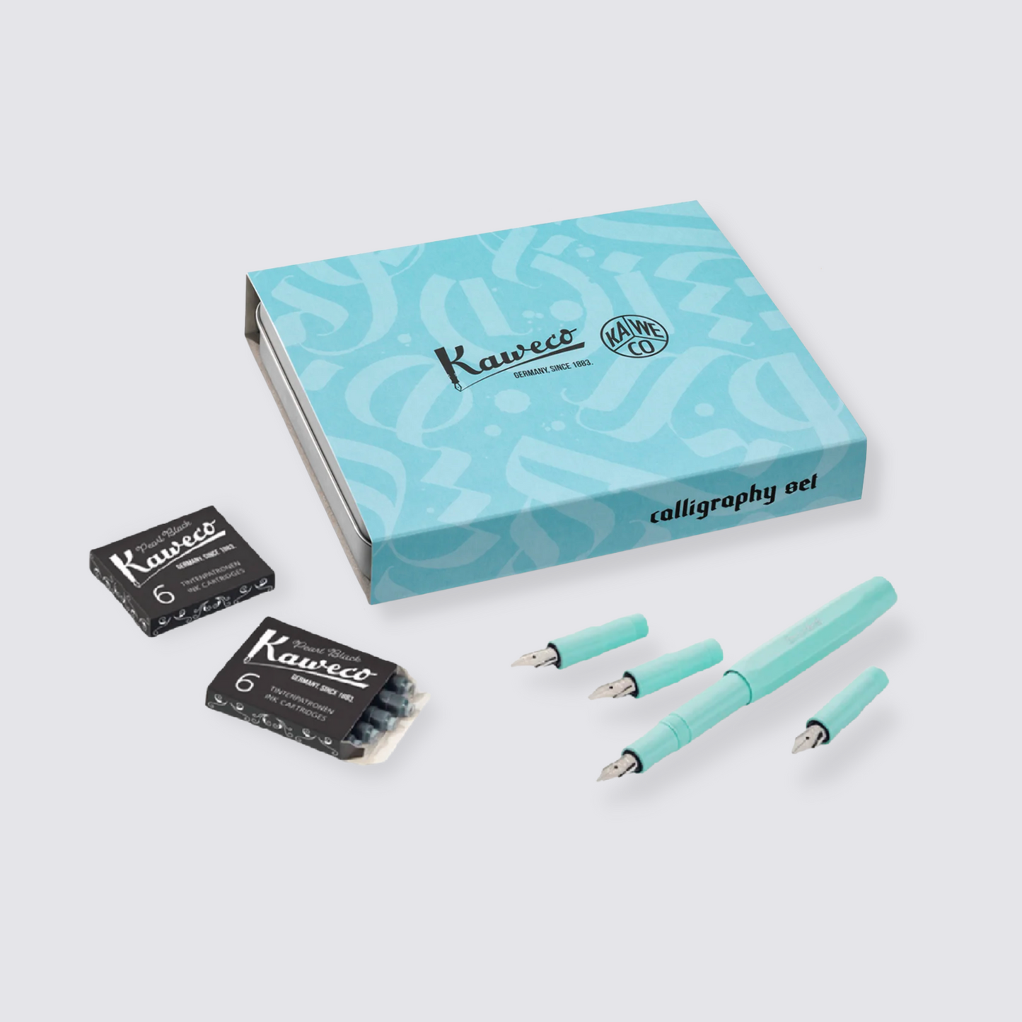 The Kaweco Sport Calligraphy Set contains a Kaweco Sport Fountain Pen with mint coloured casing and four sizes of steel calligraphy nib - 1mm, 1.5mm, 1.9mm and 2.3mm.