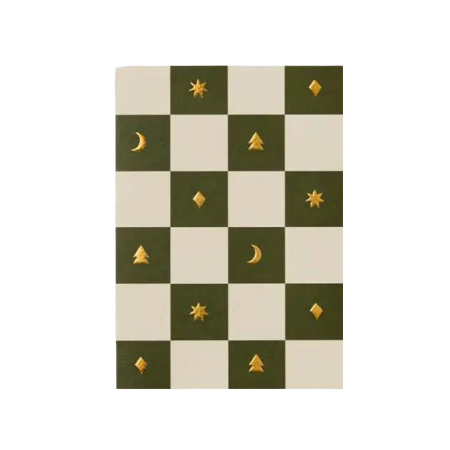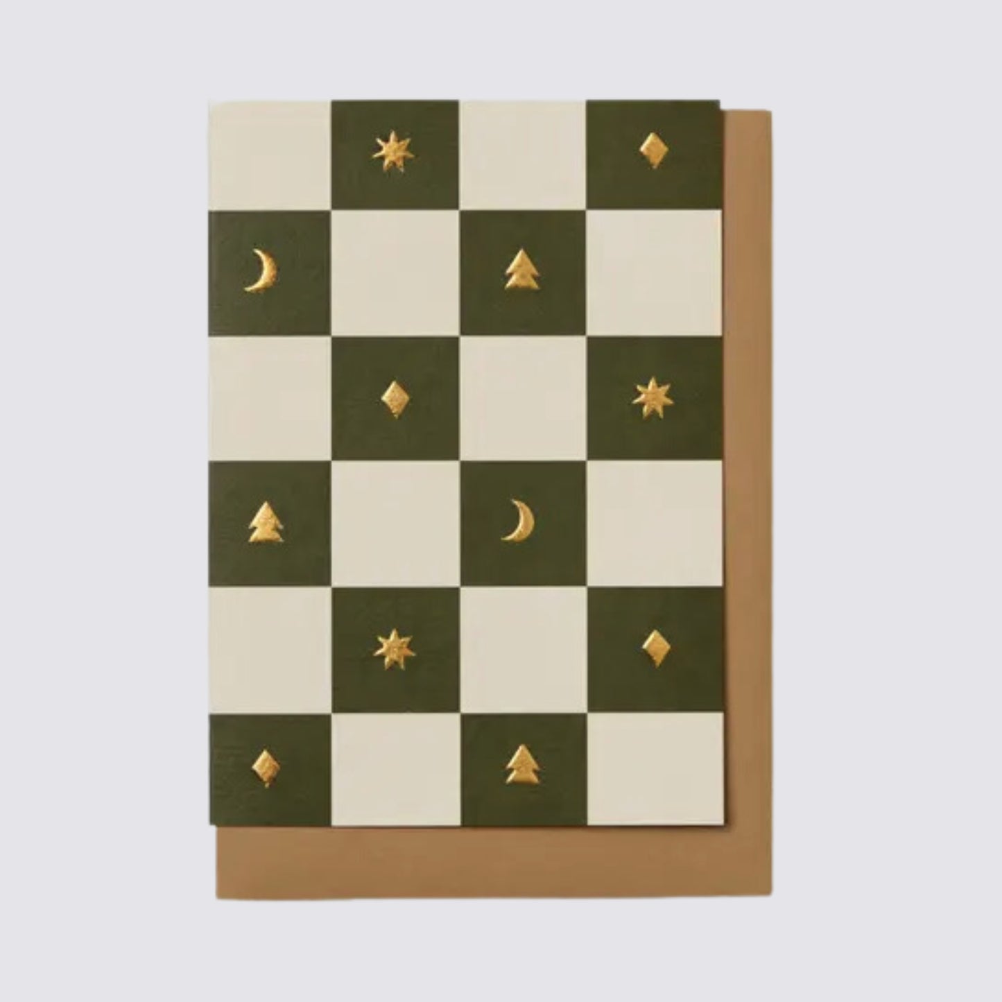 - Moss-green checkerboard and embossed, gold, seasonal icons, this is a very simple Christmas card.