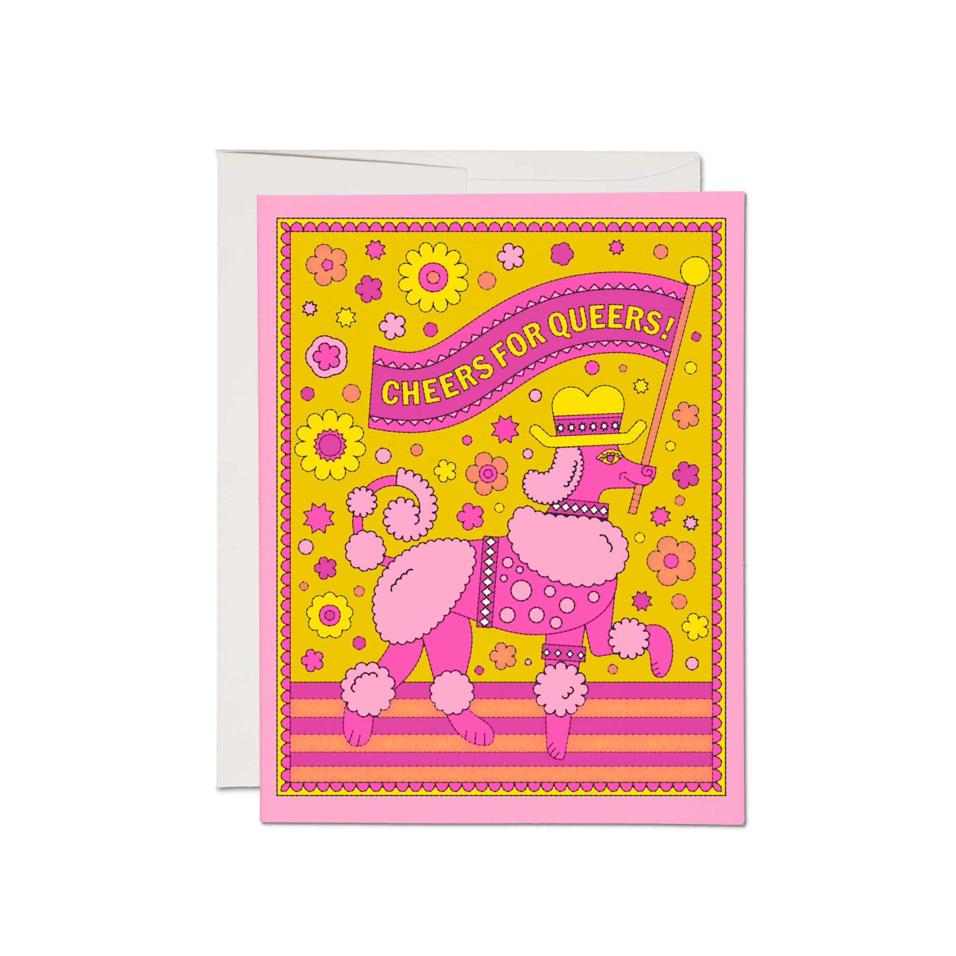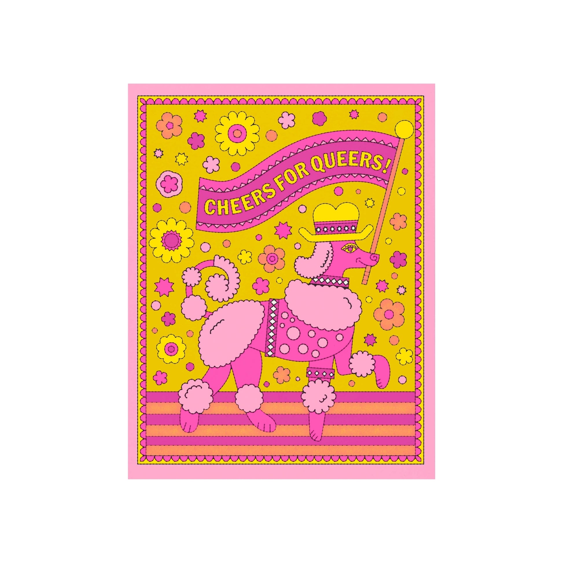 This fabulous card features a pink poodle holding the banner "Cheers for queers" We love to see it. Send this card to send love to your queer friends and family, whether it's pride, a coming out party or just any excuse to celebrate love.