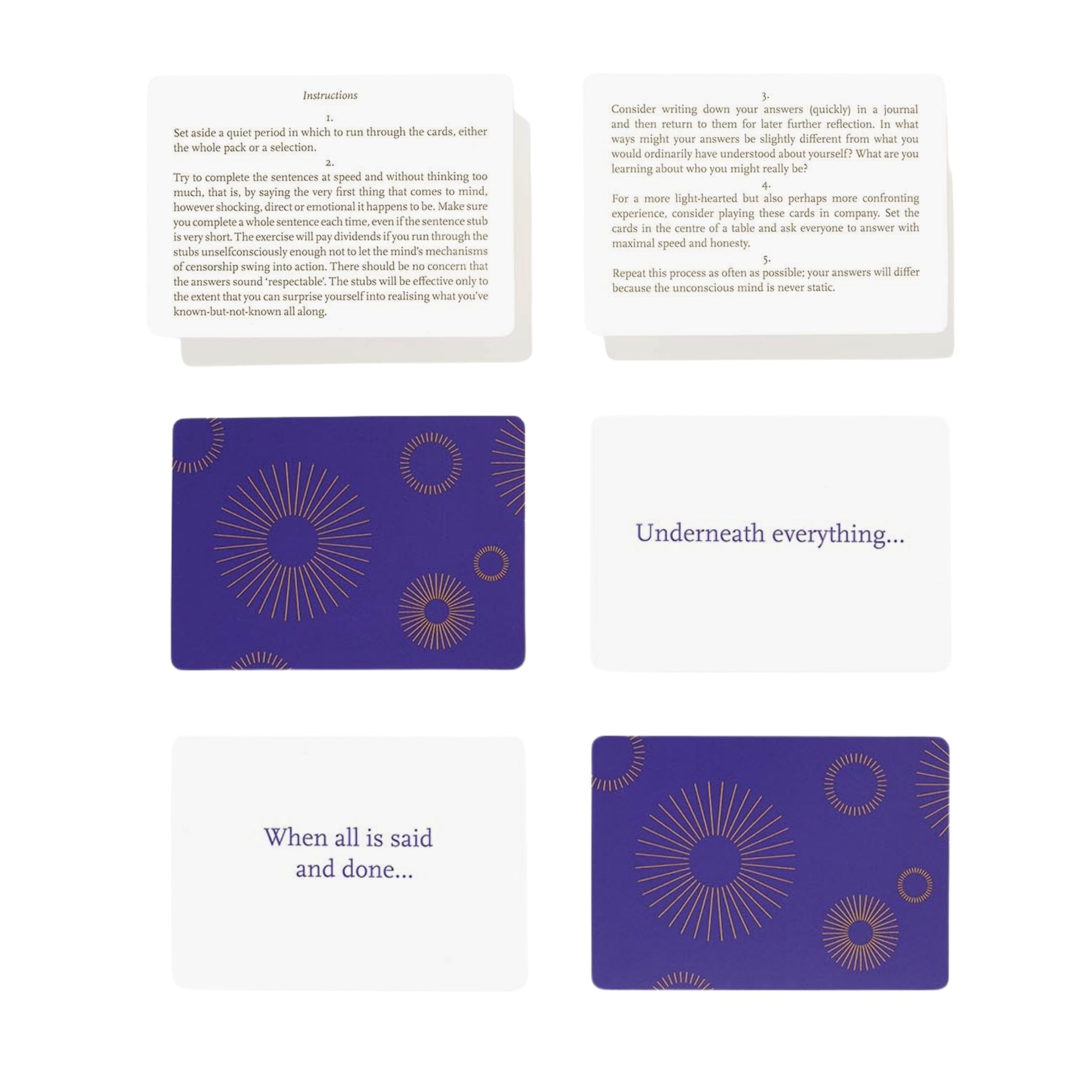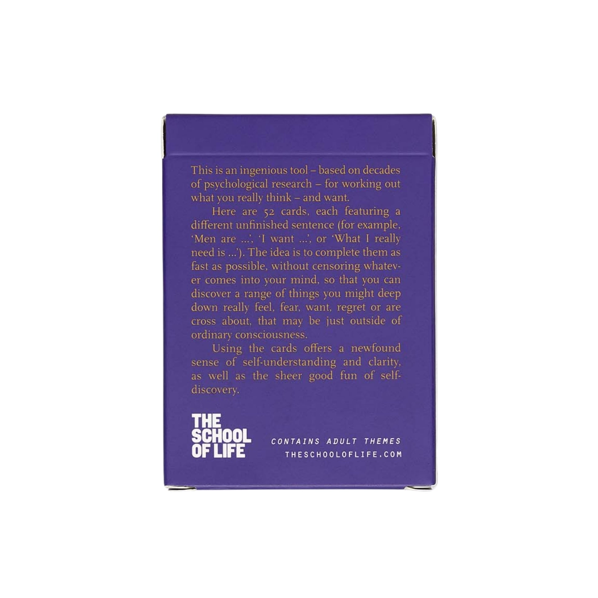 Here are 52 cards, each featuring a different unfinished sentence (for example, ‘Men are …’, ‘I want …’, or ‘What I really need is …’). The idea is to complete them as fast as possible, without censoring whatever comes into your mind, so that you can discover a range of things you might deep down really feel, fear, want, regret or are cross about, that may be just outside of ordinary consciousness. Using the cards offers a newfound sense of self-understanding and clarity, as well as the sheer good fun of self-discovery.