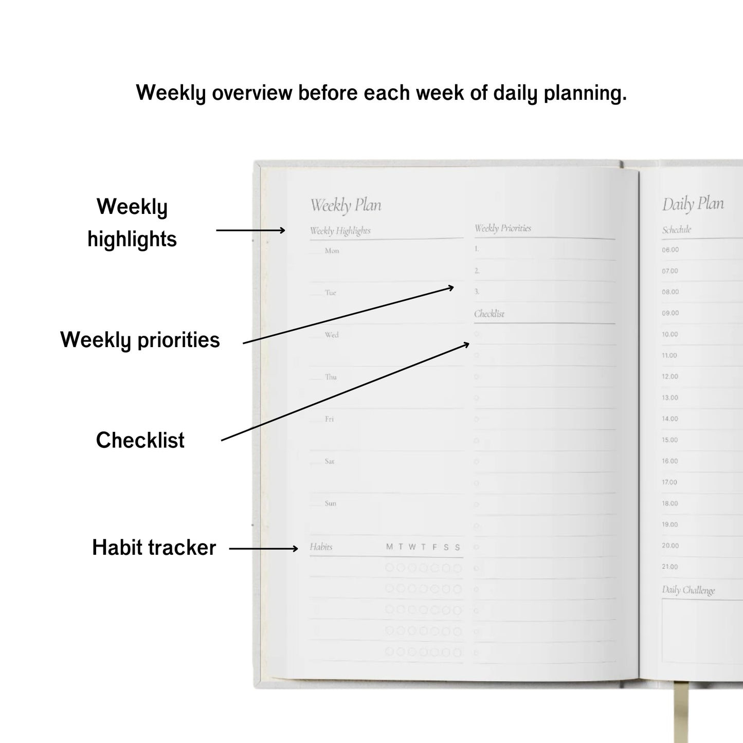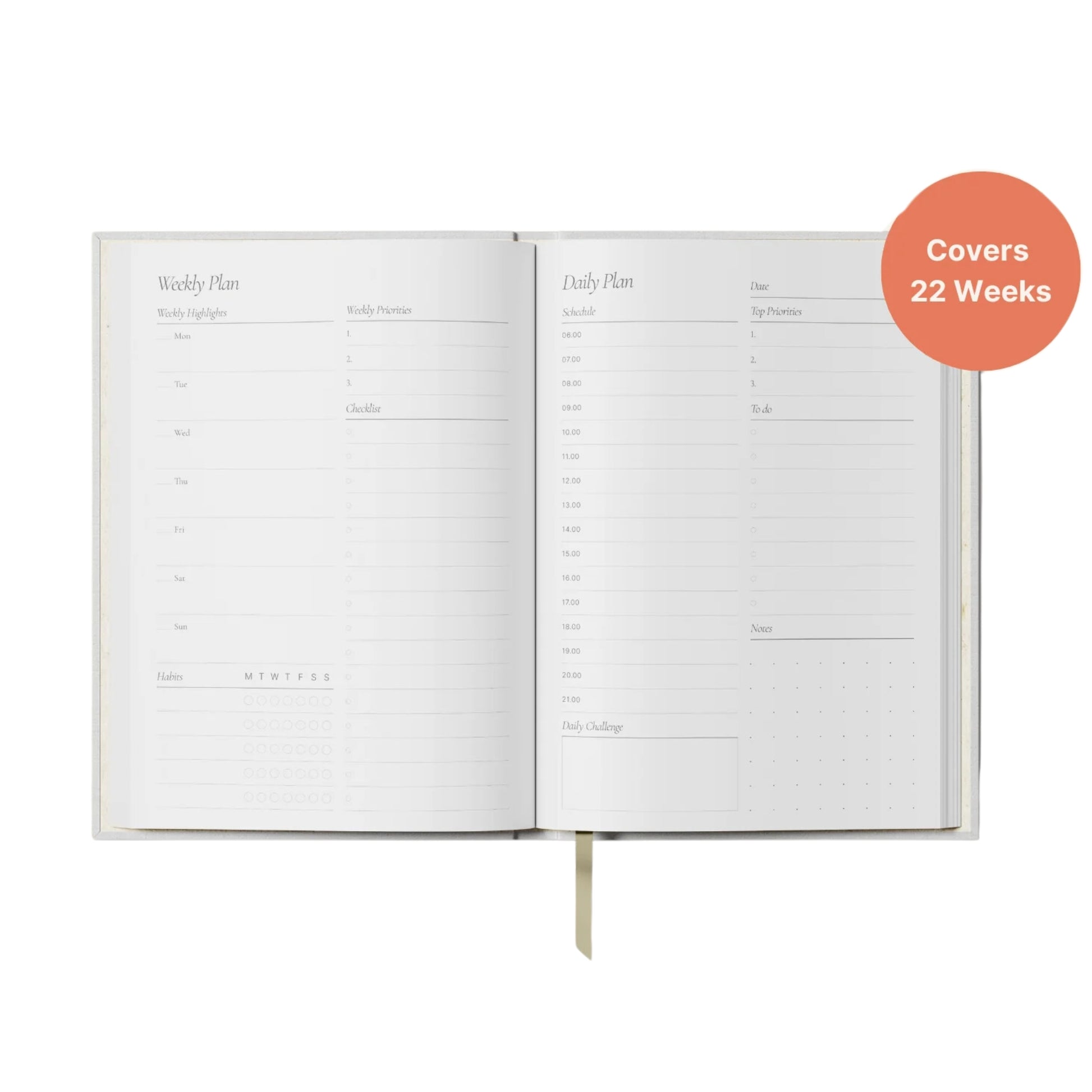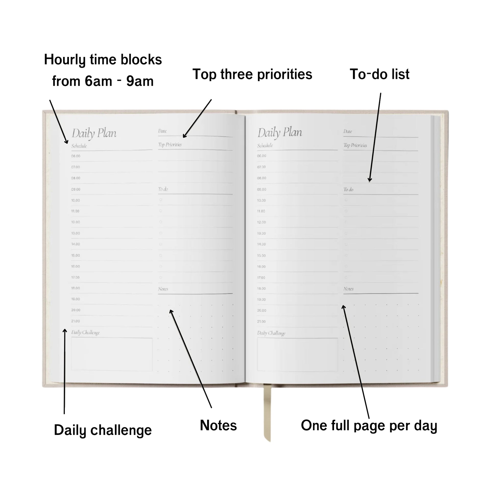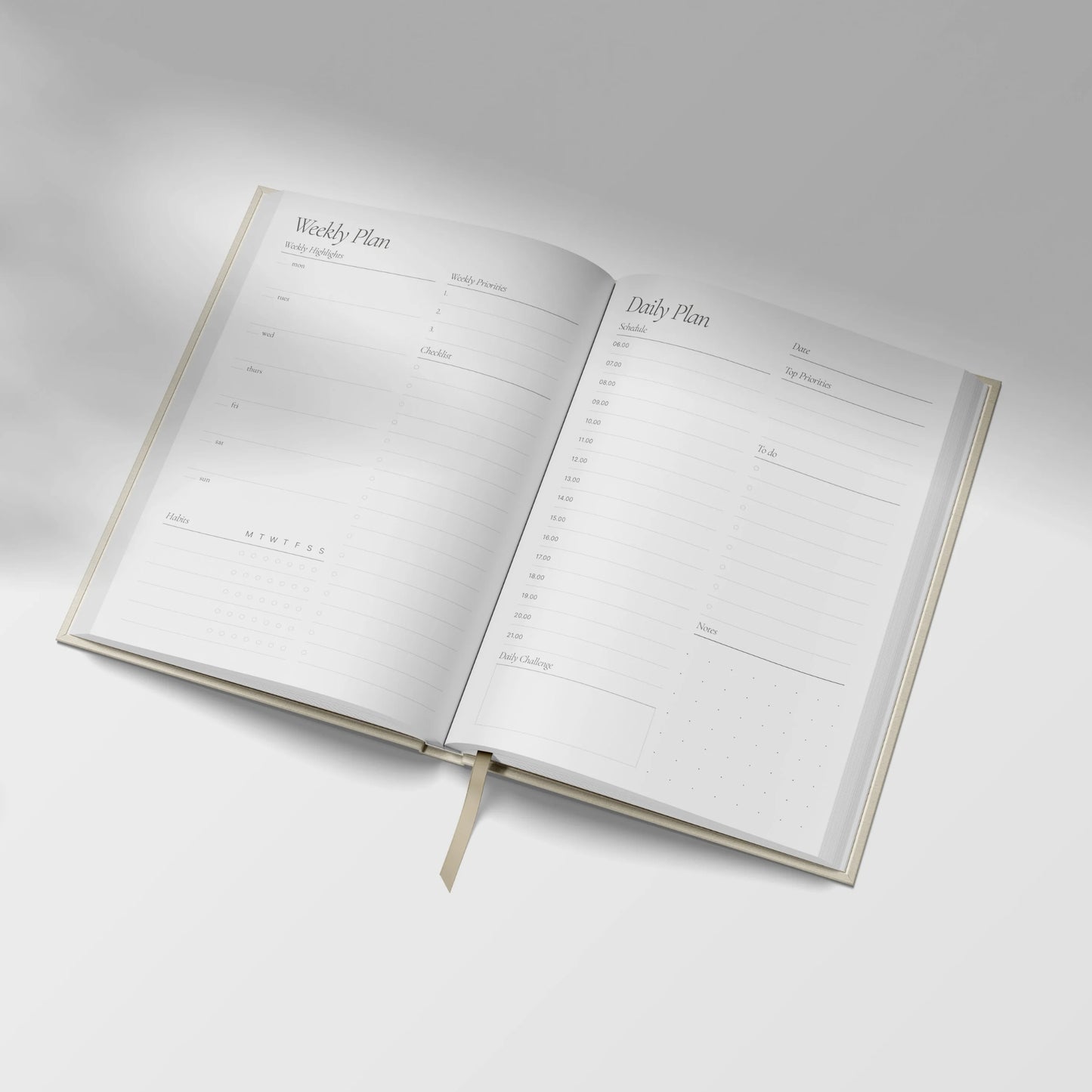 This beautifully designed planner is perfect for managing your daily schedule, prioritising your tasks, and keeping track of your to-do list. With dedicated spaces for notes, daily challenges, and reflections, it's the ideal tool to boost productivity and maintain a balanced lifestyle without the pressure of adding dates.