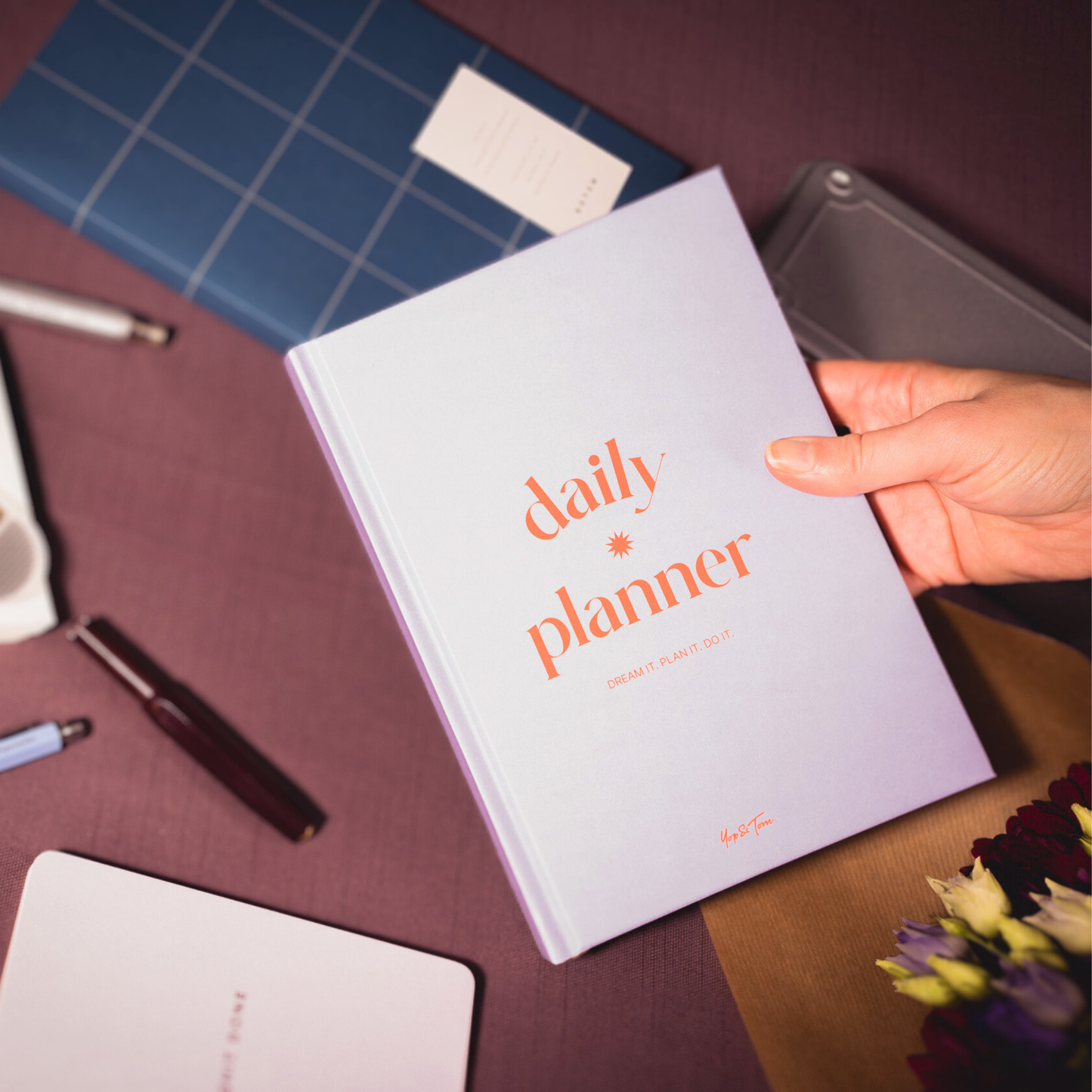 Stay organised and achieve more of your daily goals with this A5 undated daily planner with a purple and orange hardcover design.