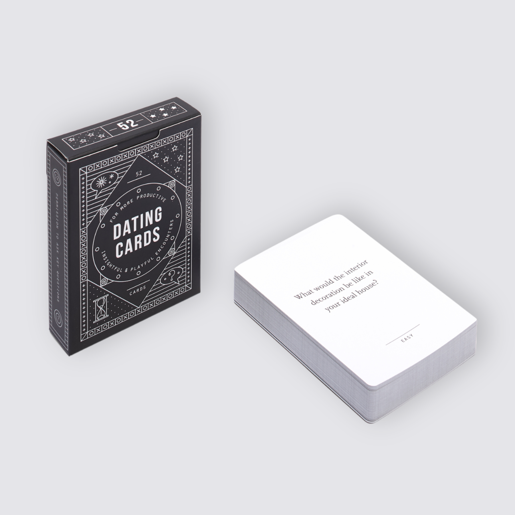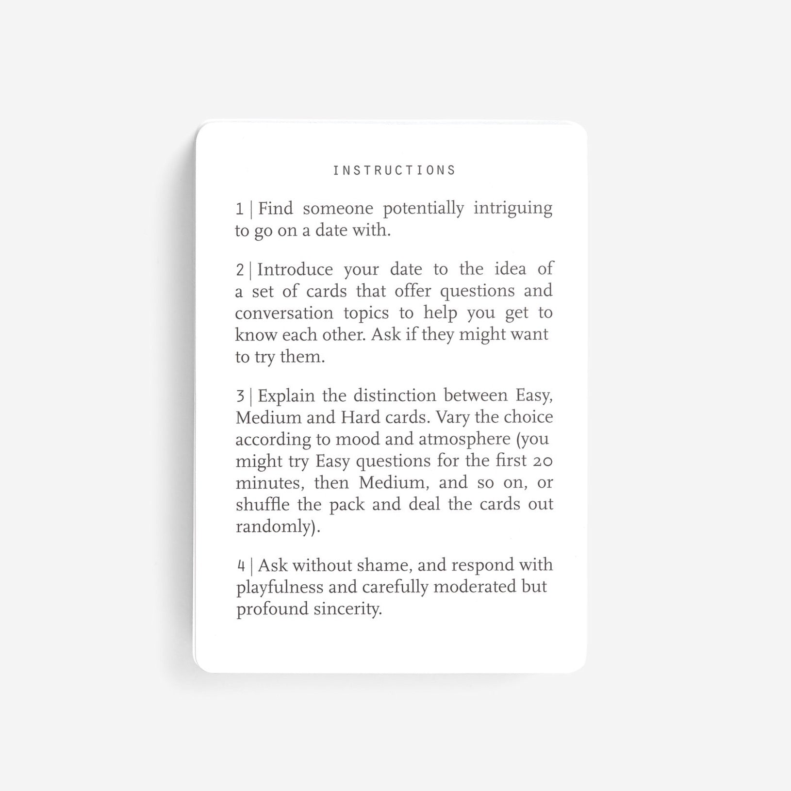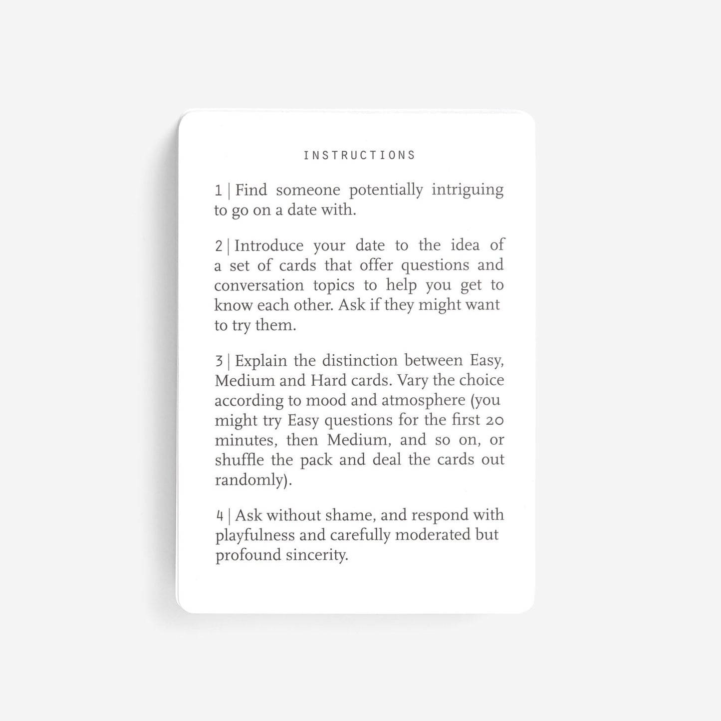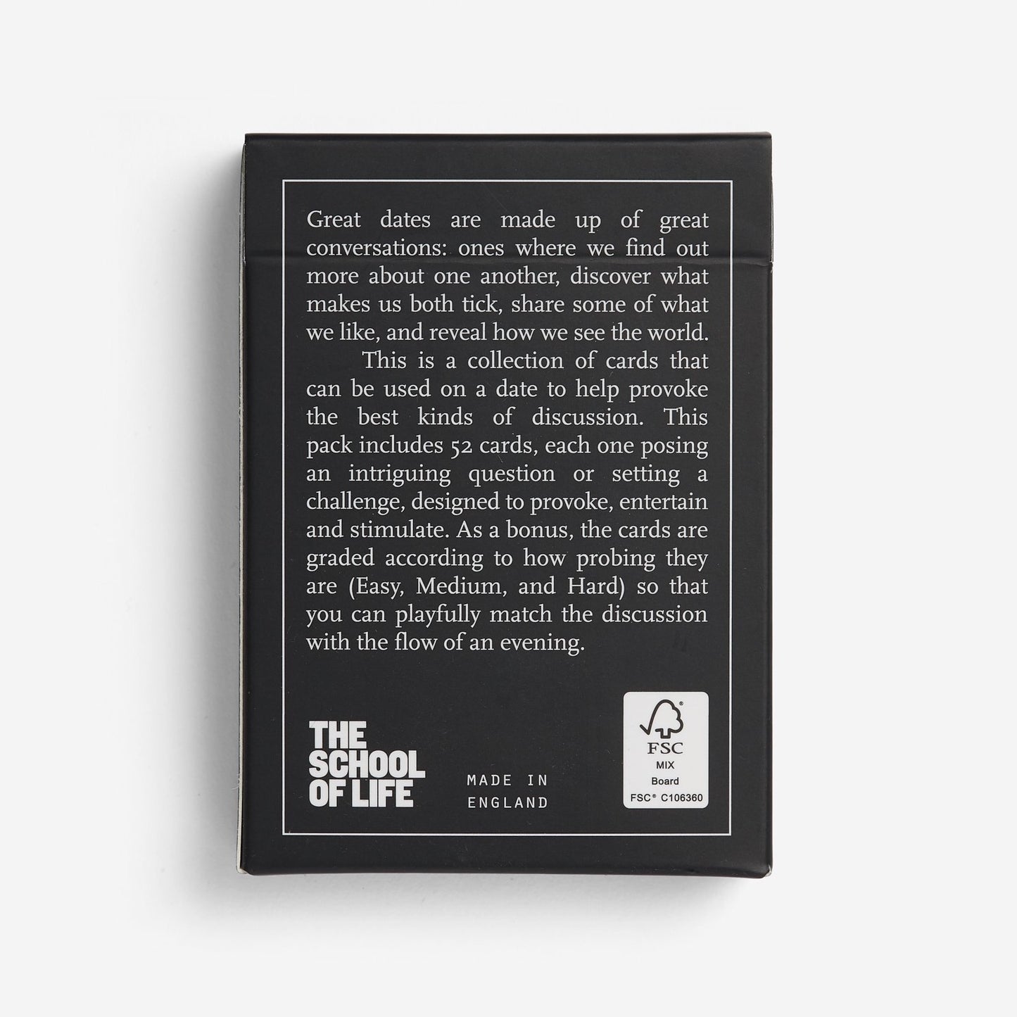 Great dates are made up of great conversations: ones where we find out more about one another, discover what makes us both tick, share some of what we like and reveal how we see the world. This is a collection of cards that can be used on a date to help provoke the best kinds of discussion.