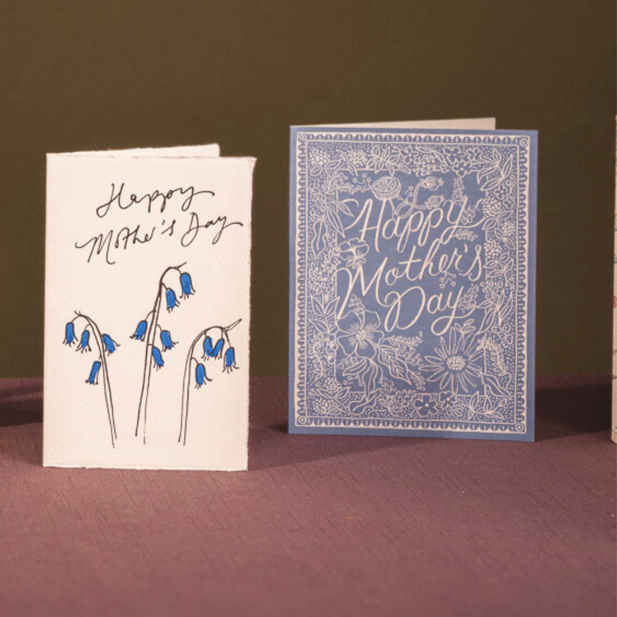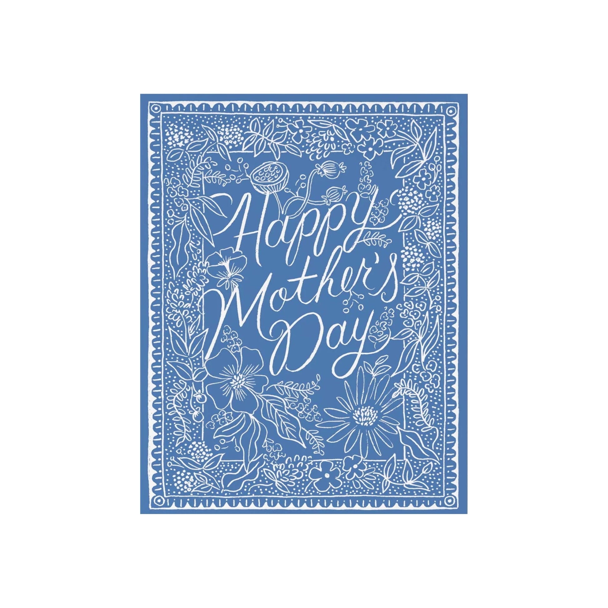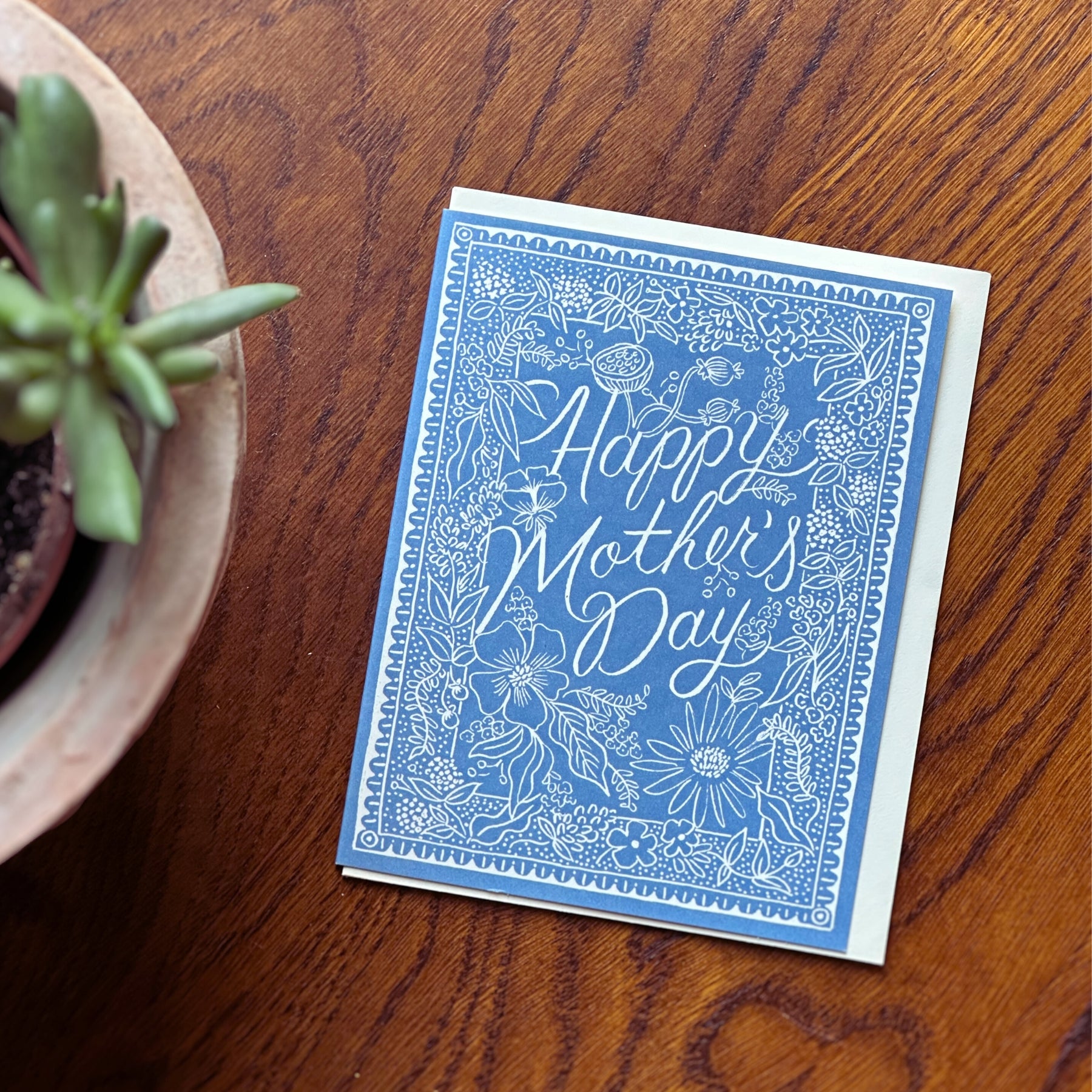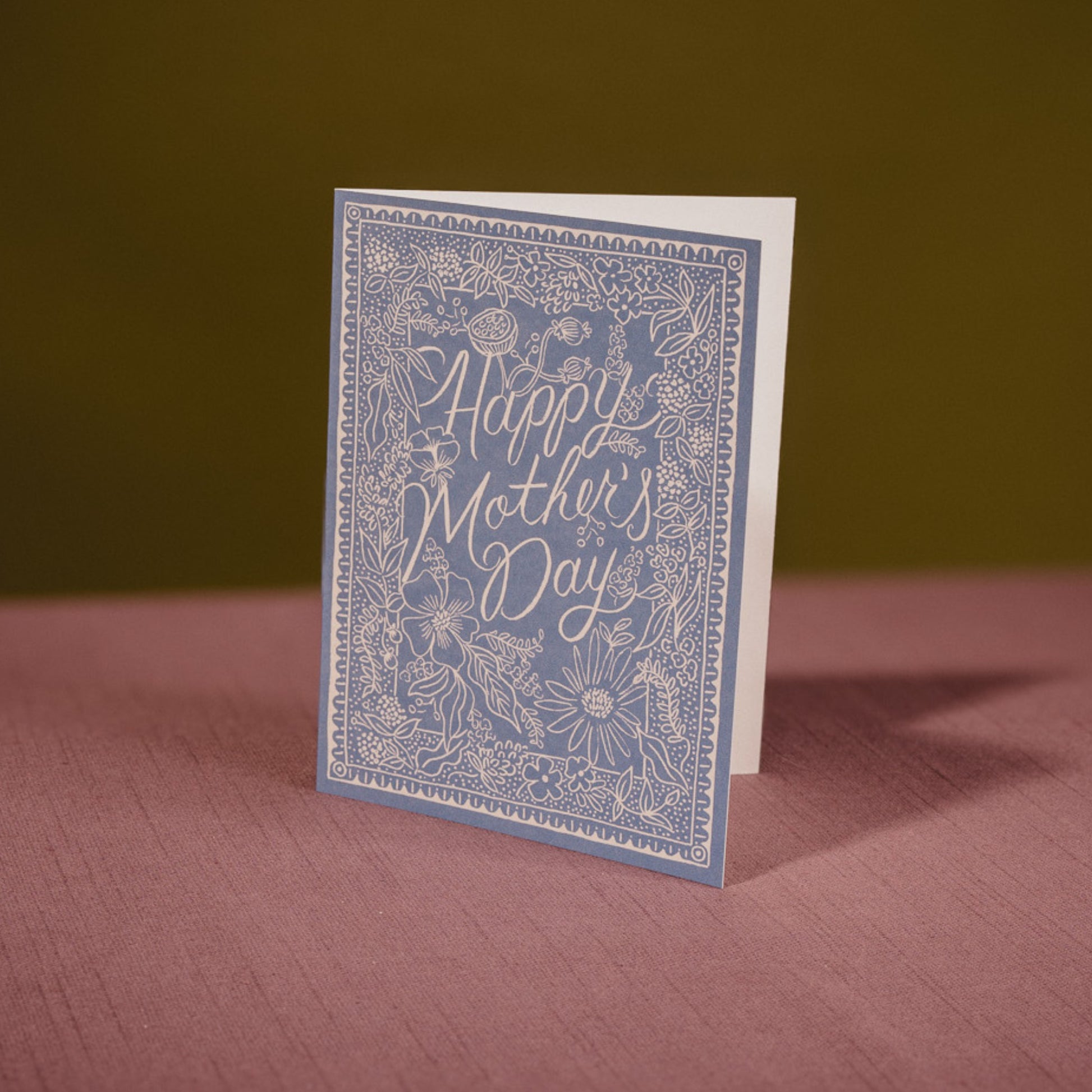 An illustrated blue Mother's Day card with a whimsical floral illustration on with the script text "Happy Mother's Day" on the front.