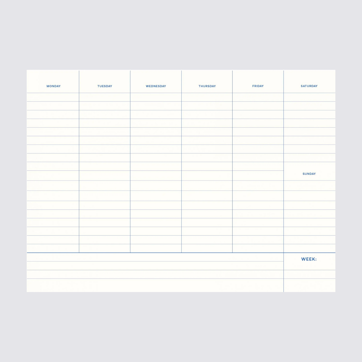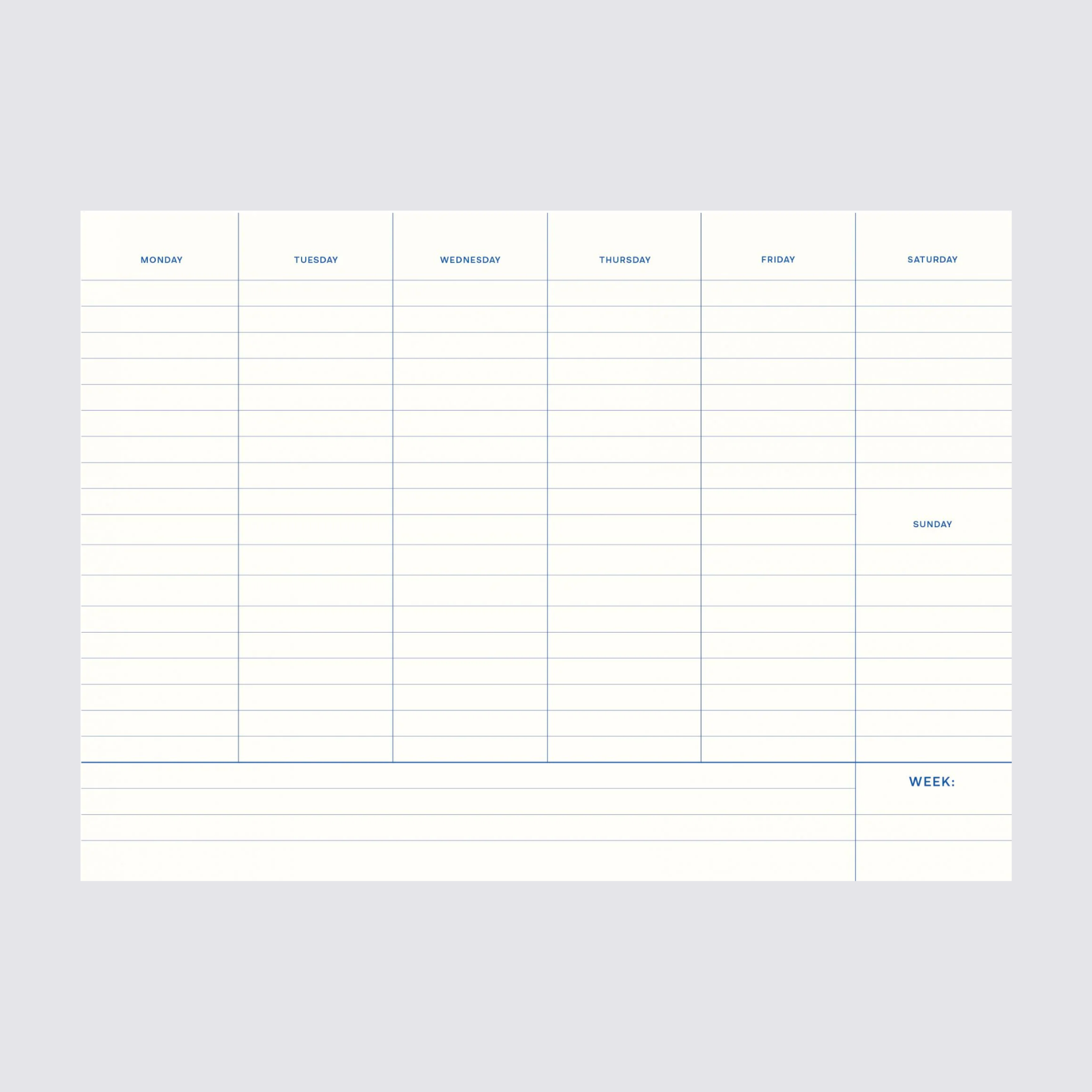 A handy weekly planner that really helps you getting organised. The interior consists of a sleek and minimalist design and easily tear-off sheets. This way you start every week with a clean slate and you have your entire weekly planning on paper at a glance.