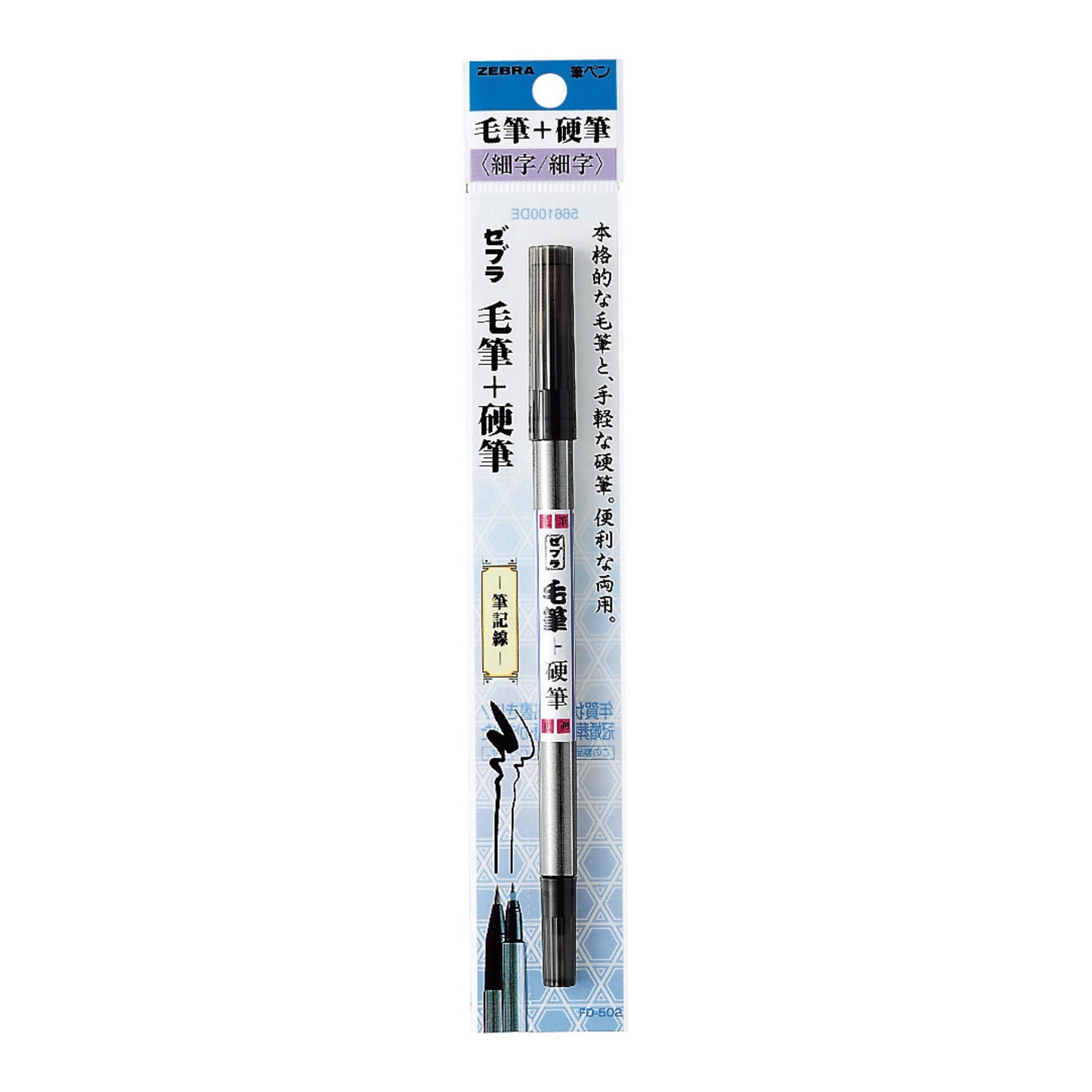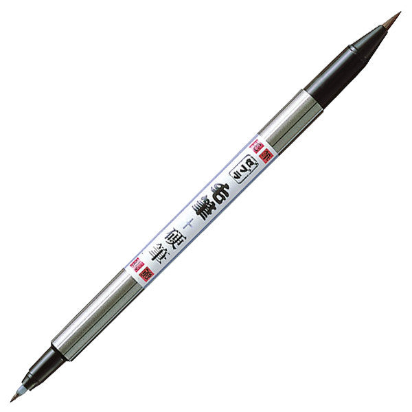 A black ink, dual brush pen with a medium brush tip of soft bristles made of synthetic fibre hairs on one end. The other has a finer, felt brush tip, which is suitable for more precise work.