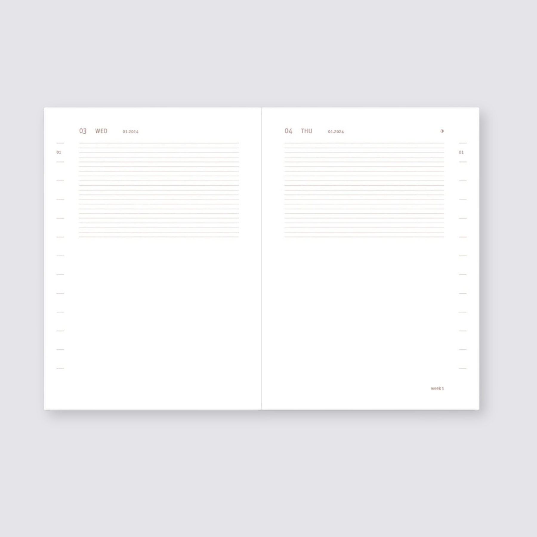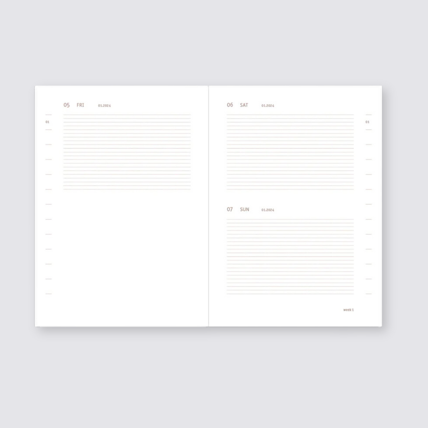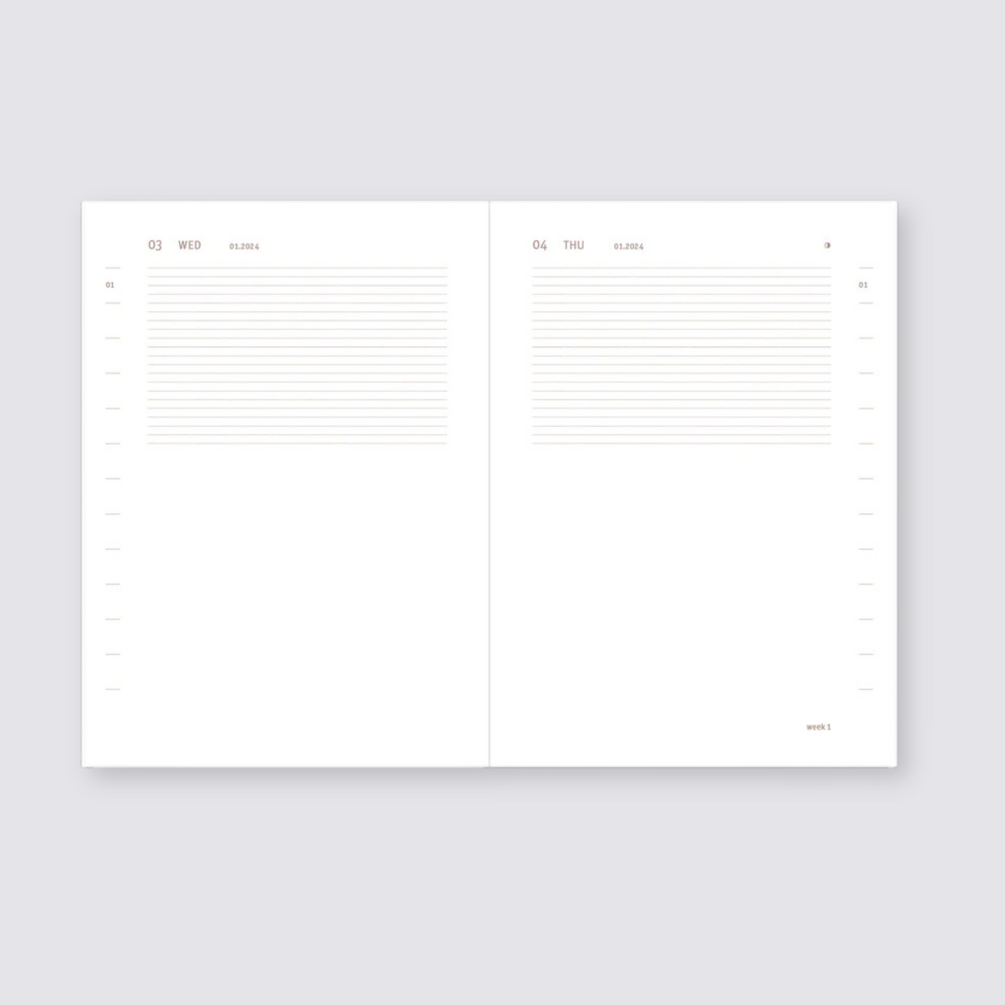 The top half of the daily double-page spread is ruled while the bottom half is plain. This smart design allows you to arrange your tasks into sections: one for household duties and the other for school or work tasks, or completely crazy ideas. The planner has a flexible cover made of pleasant-to-the-touch plastic material. It is stain resistant and can be easily cleaned with a damp cloth. This 2024 diary contains pleasantly smooth natural warm white inner pages.