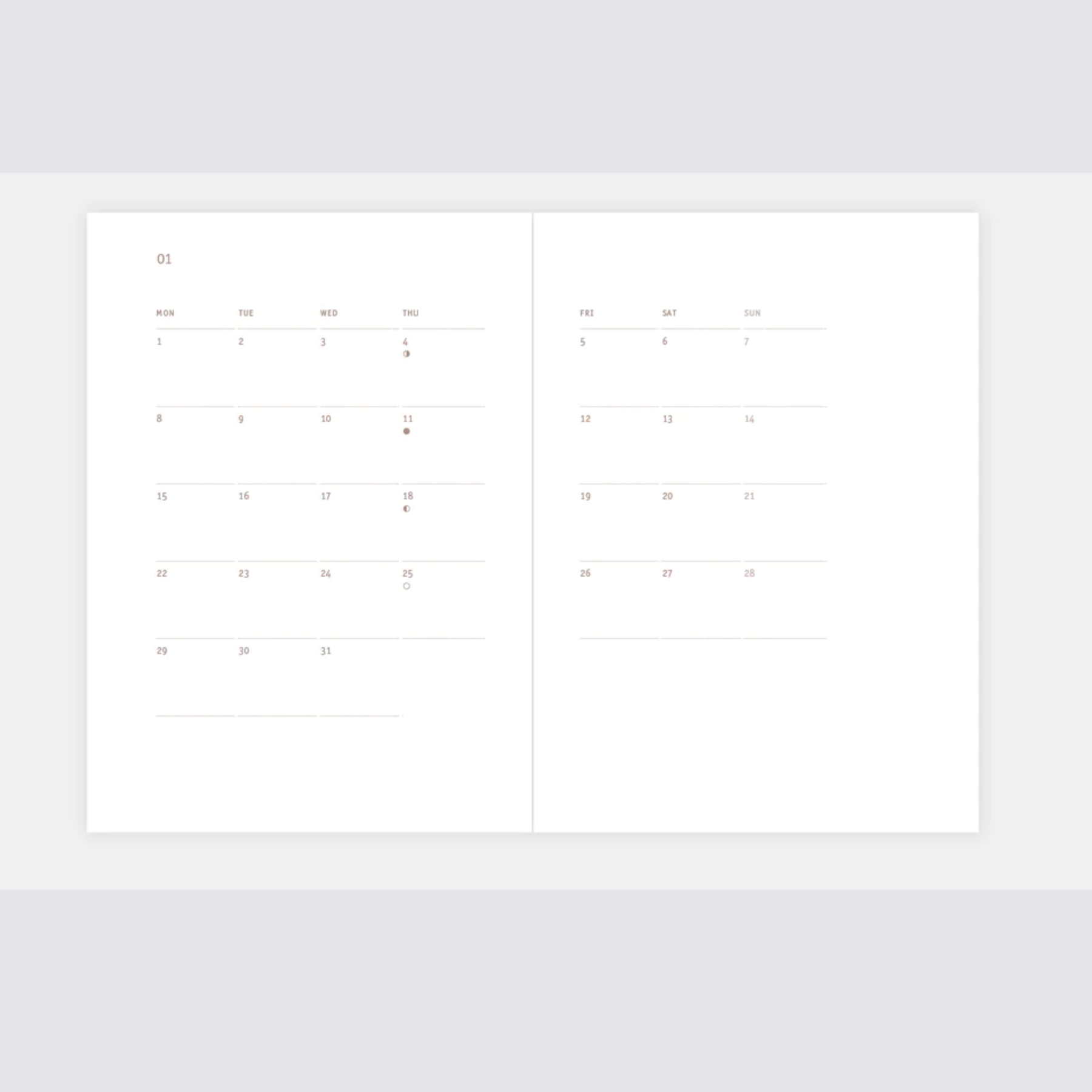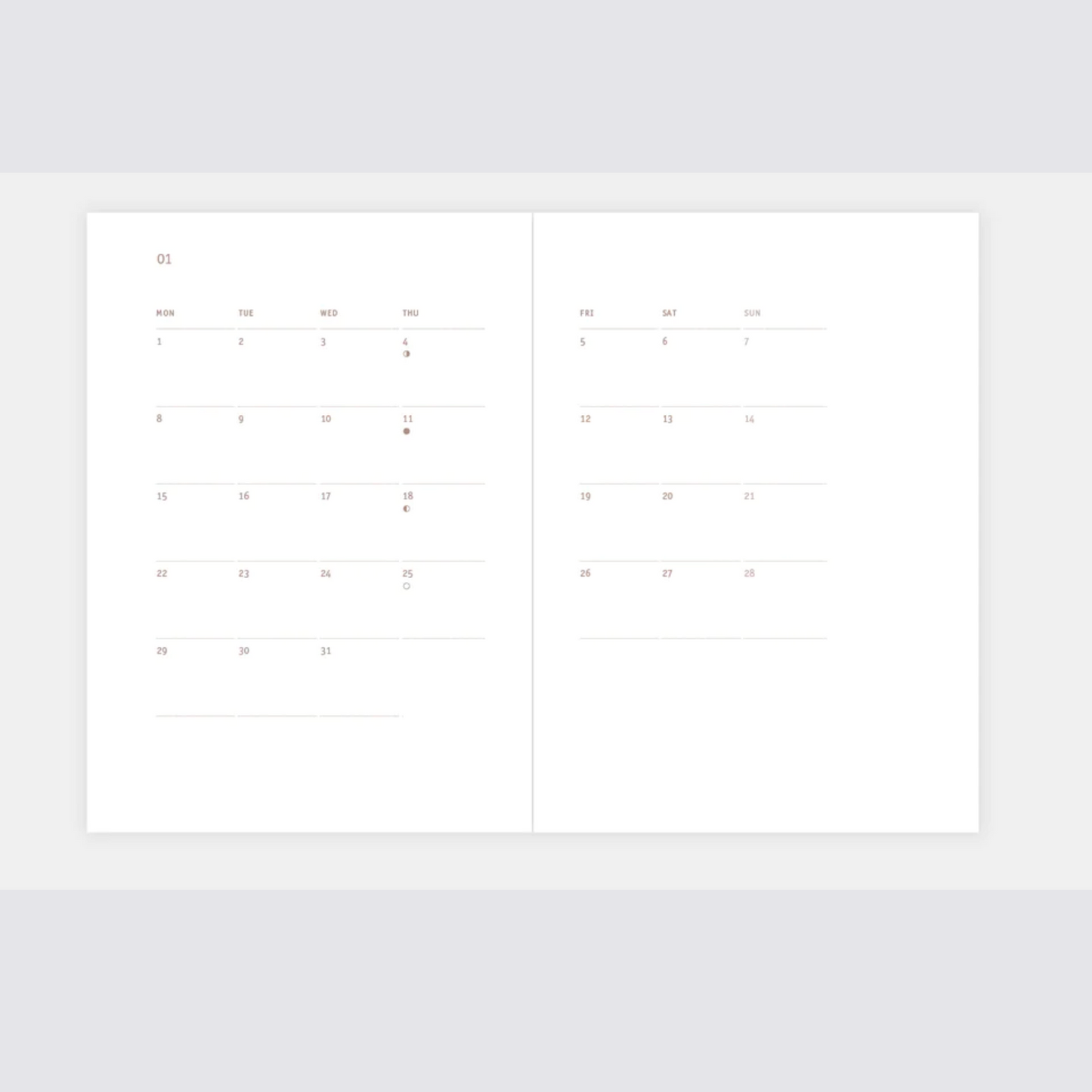 - Interior: Yearly, monthly, and weekly double-page spreads, ruled pages for notes, a few words about handwriting