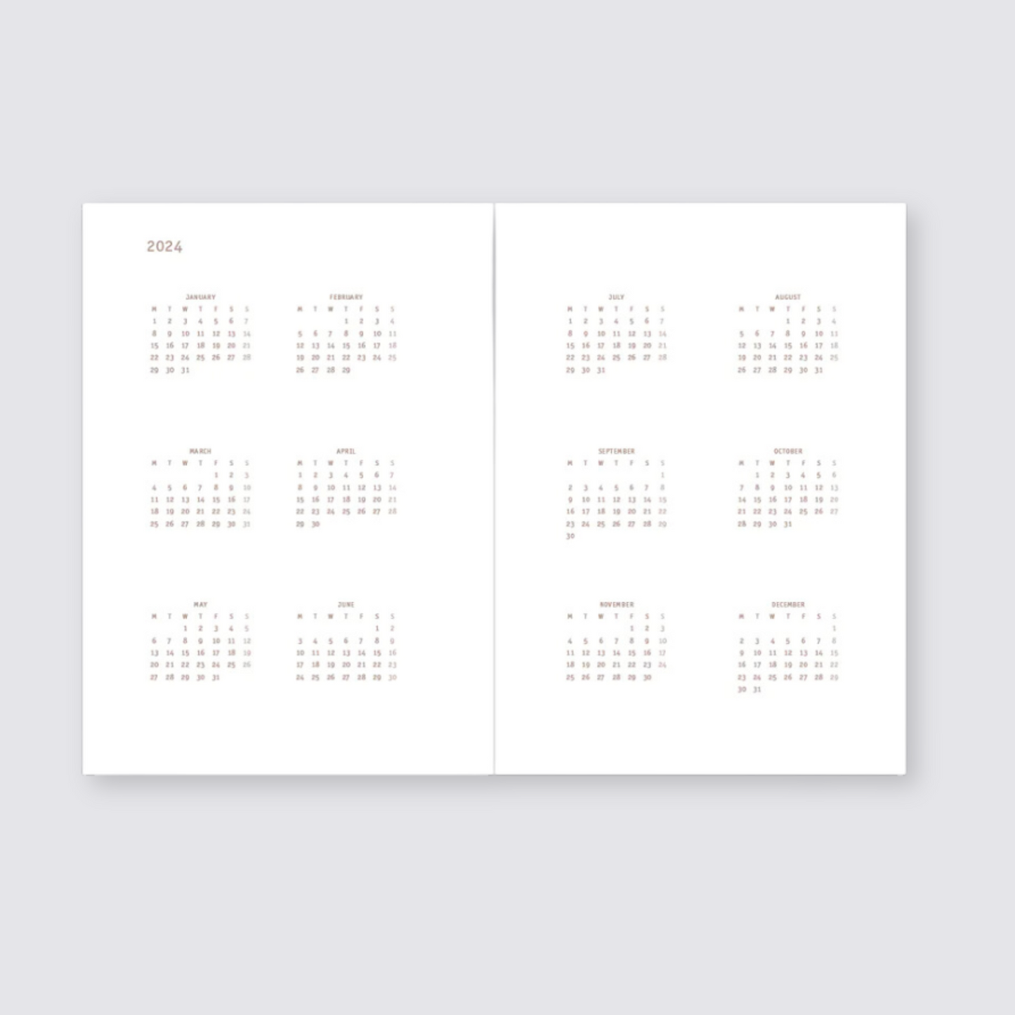 Inside you'll find: a full 2024 calendar, monthly double-page spreads, a daily planner, and a couple of pages for jotting down your free thoughts.