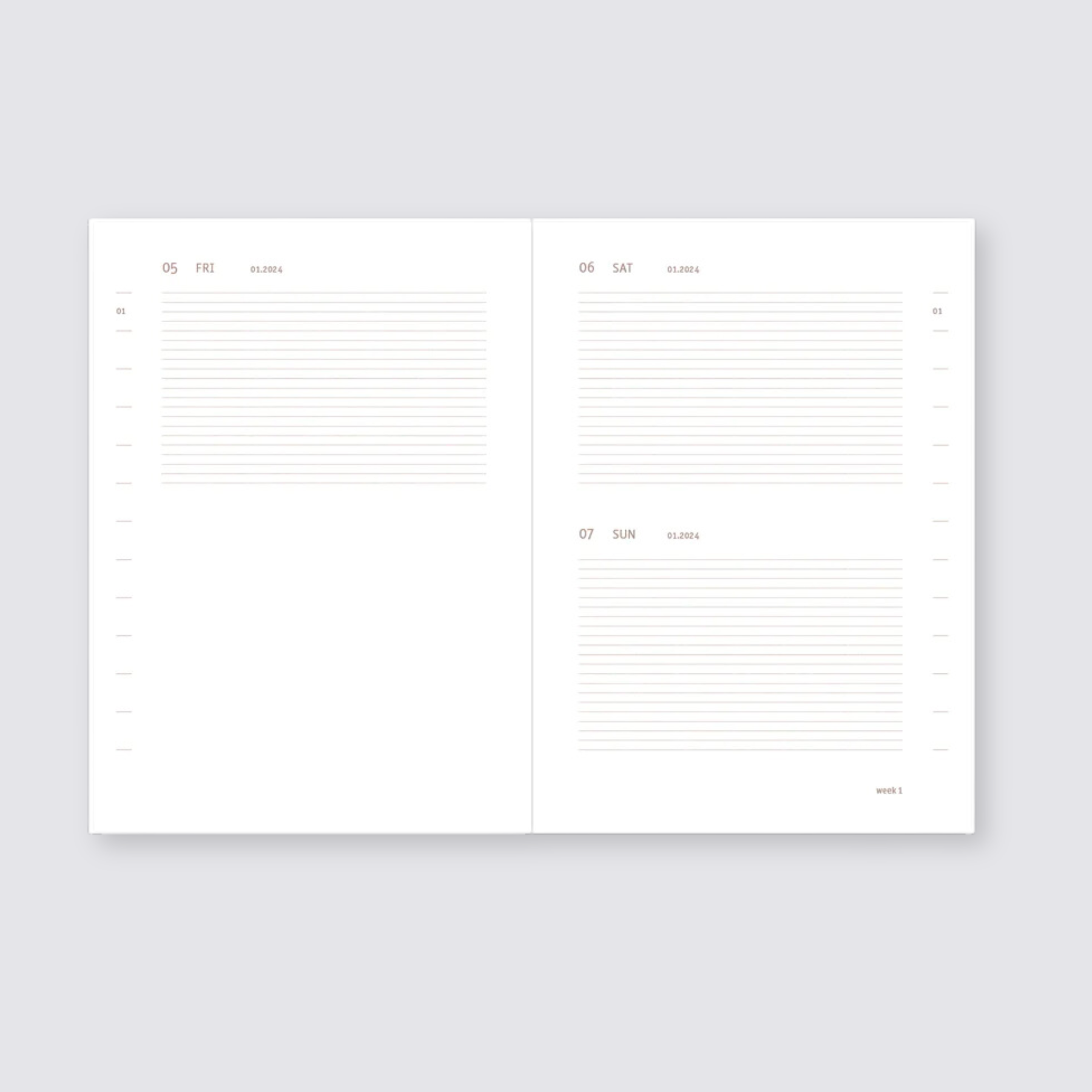 The top half of the daily double-page spread is ruled while the bottom half is plain. This smart design allows you to arrange your tasks into sections: one for household duties and the other for school or work tasks, or completely crazy ideas. The planner has a flexible cover made of pleasant-to-the-touch plastic material. It is stain resistant and can be easily cleaned with a damp cloth. This 2024 diary contains pleasantly smooth natural warm white inner pages.