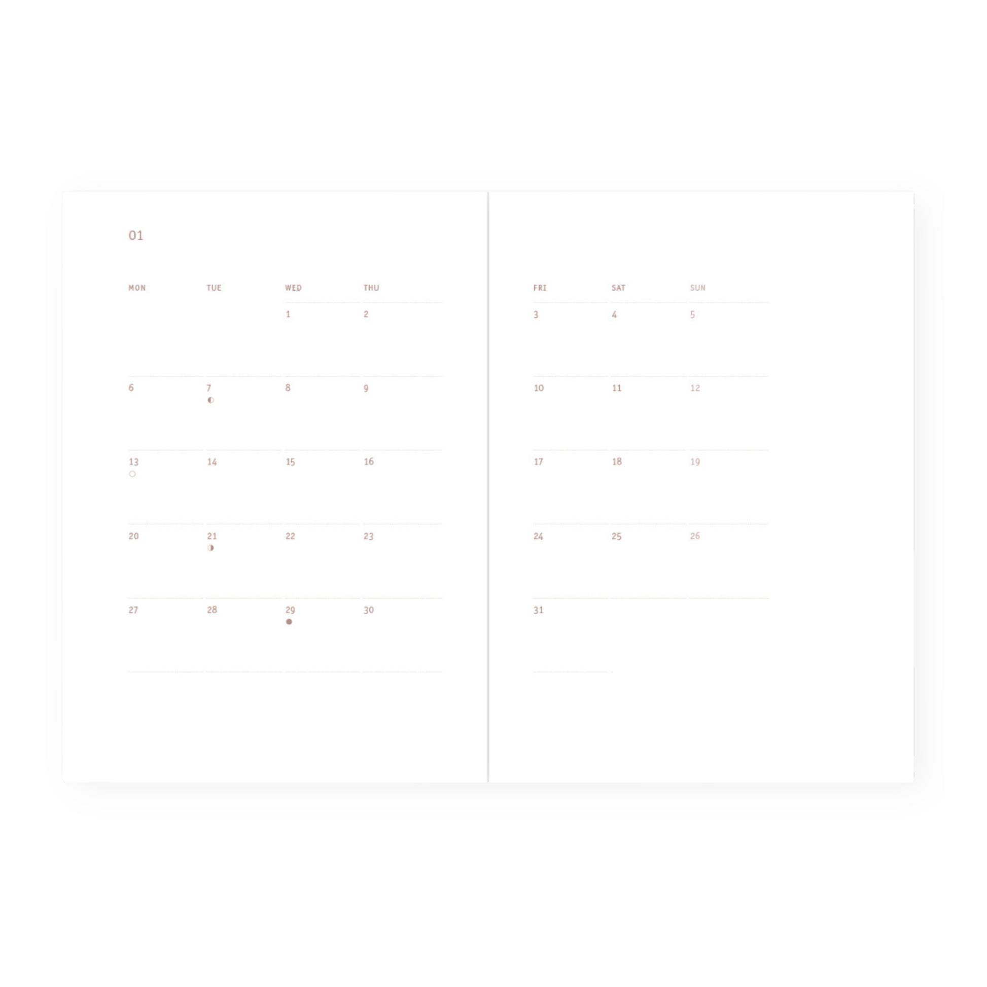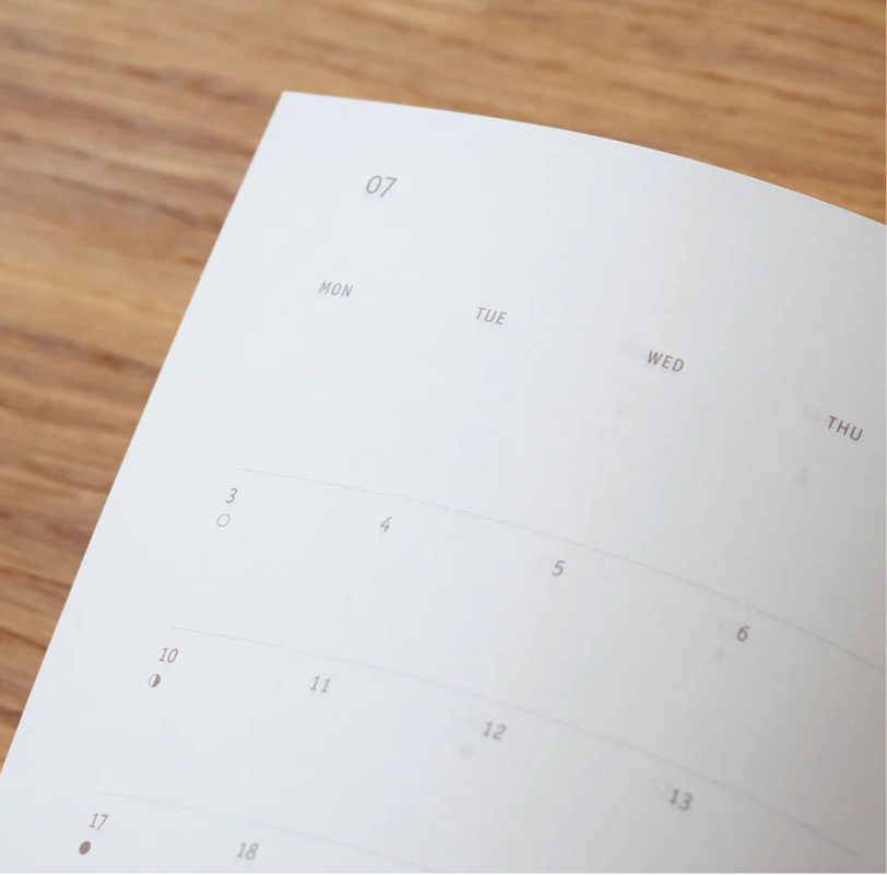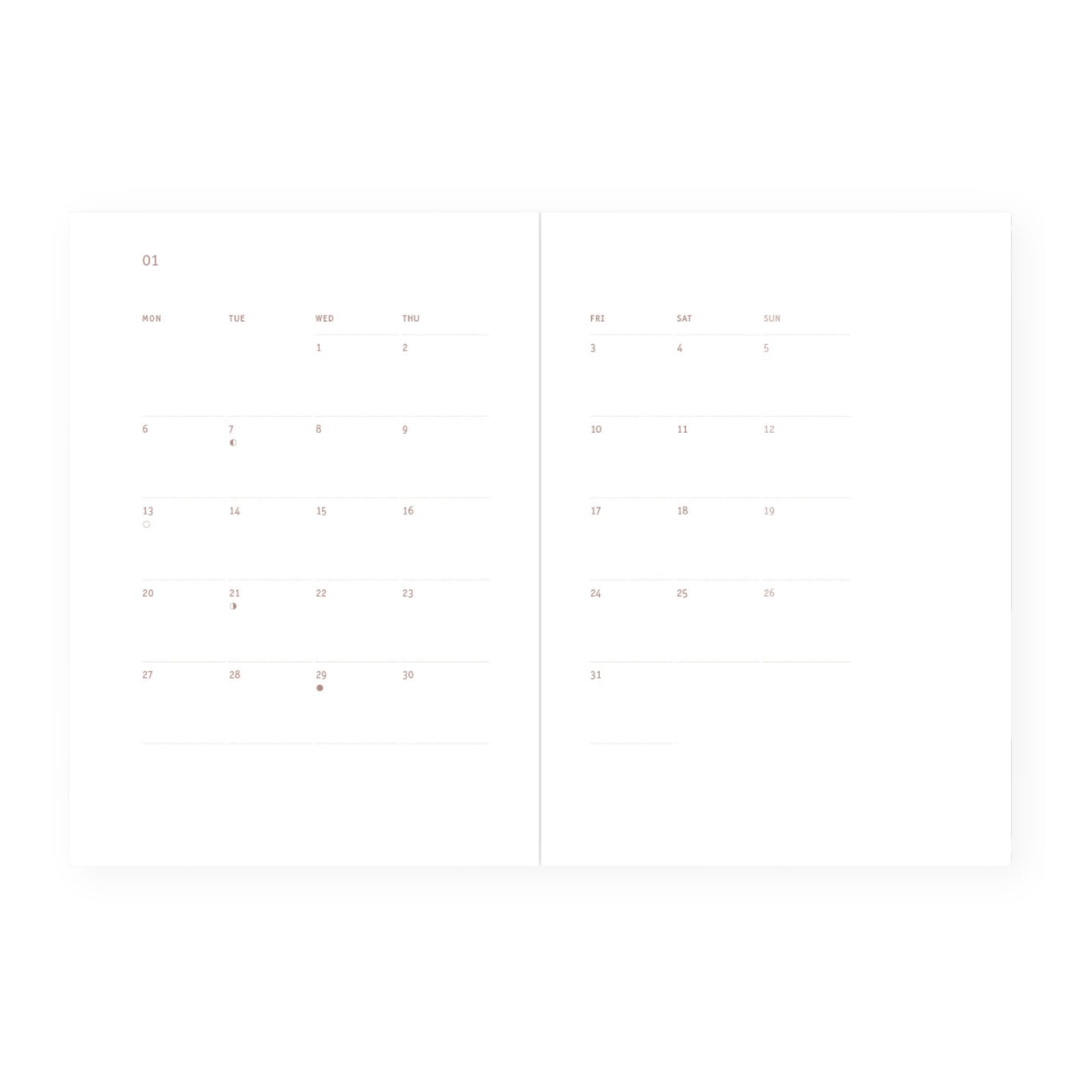 • Interior: Yearly, monthly, and weekly double-page spreads, ruled pages for notes, a few words about handwriting