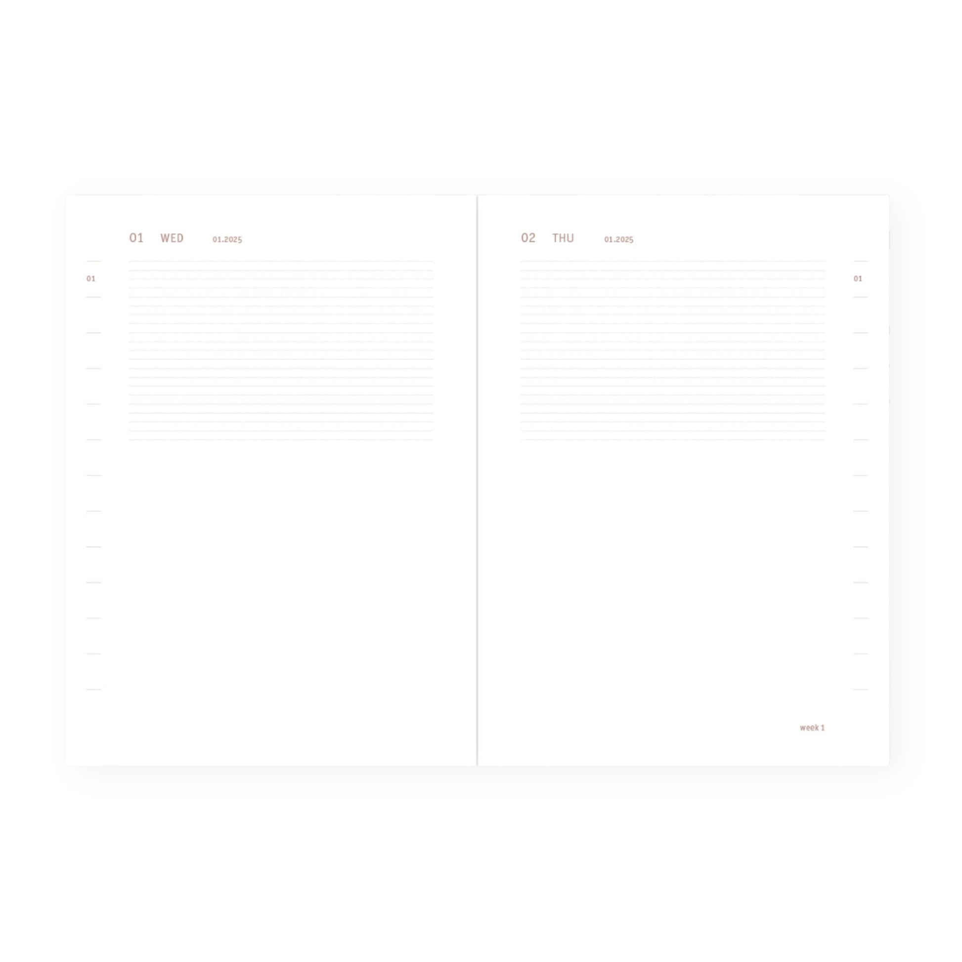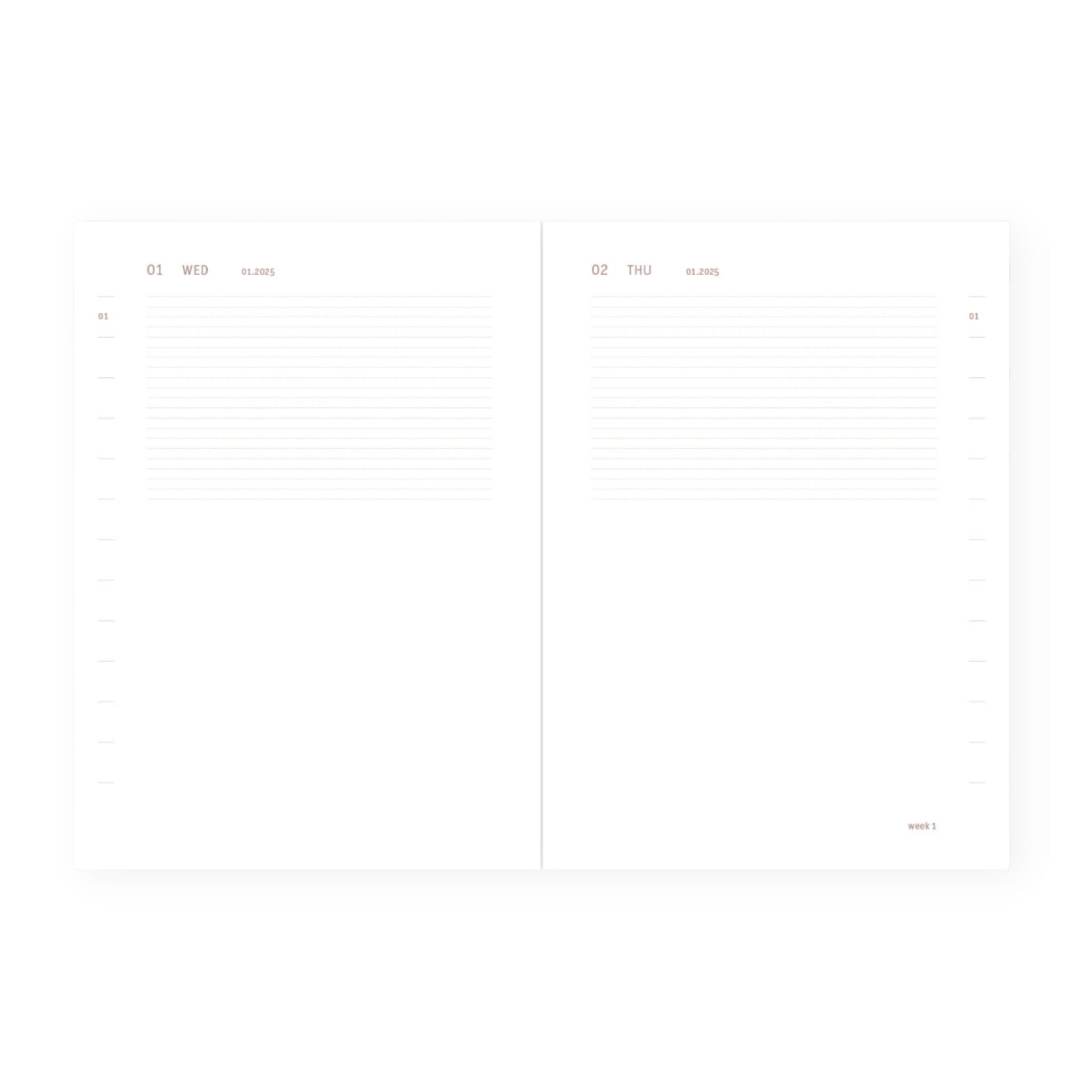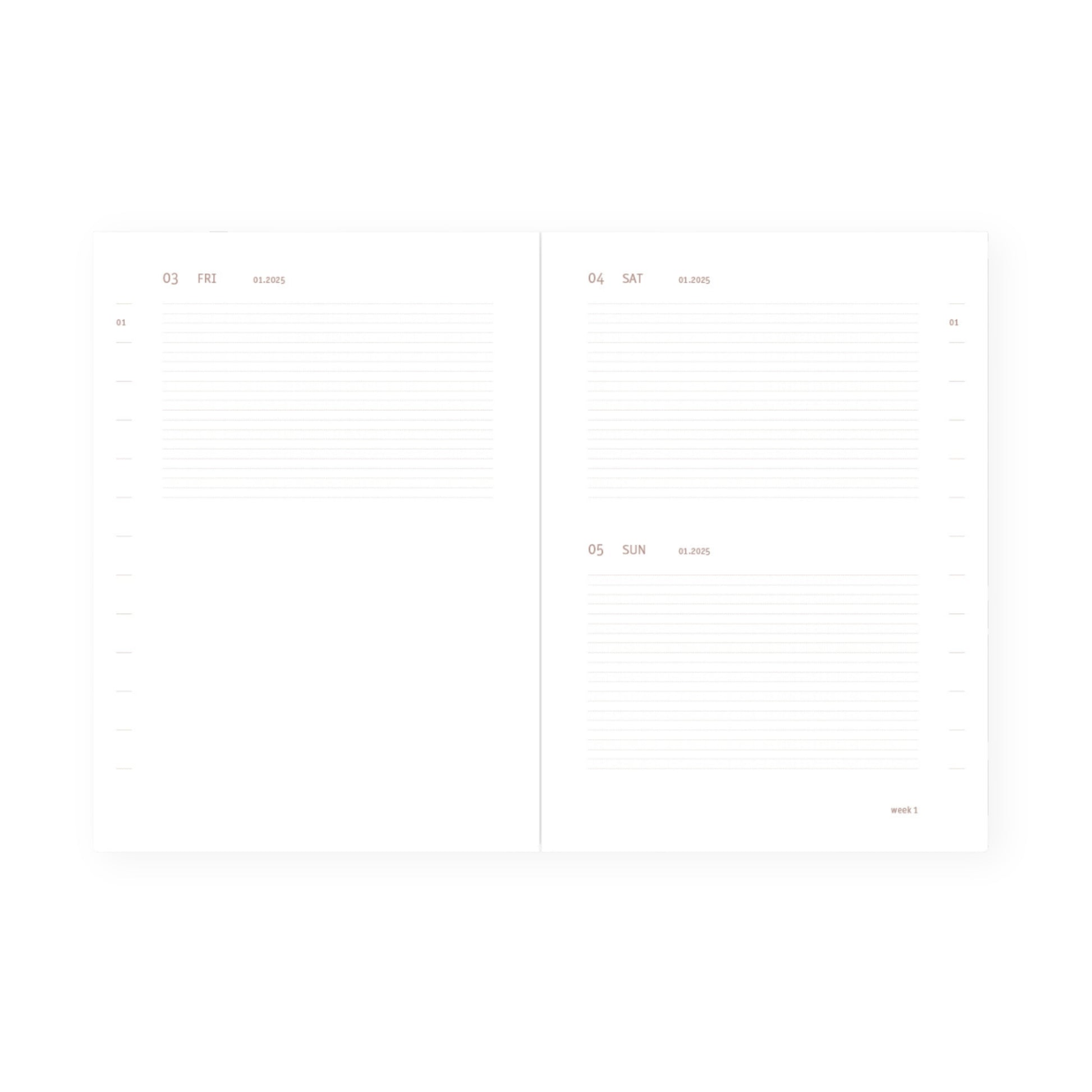 The top half of the daily double-page spread is ruled while the bottom half is plain. This smart design allows you to arrange your tasks into sections: one for household duties and the other for school or work tasks, or completely crazy ideas. The planner has a flexible cover made of pleasant-to-the-touch plastic material. It is stain resistant and can be easily cleaned with a damp cloth. This 2025 diary contains pleasantly smooth natural warm white inner pages.