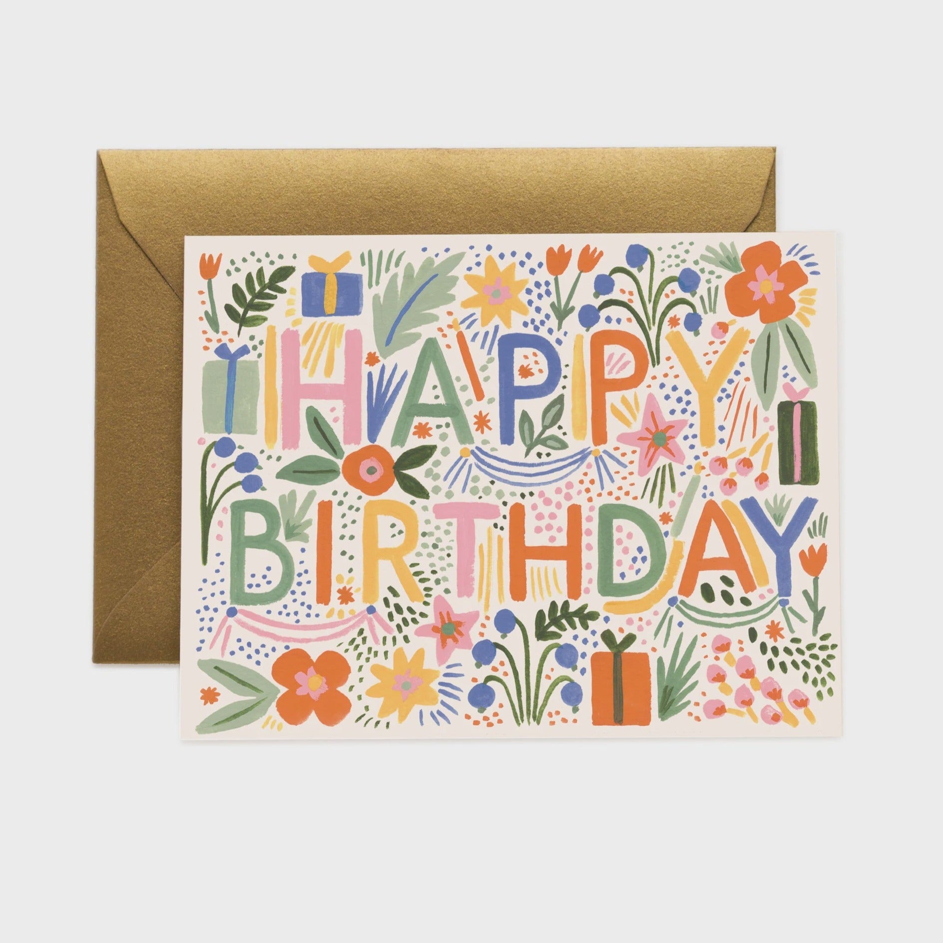 Greetings card printed on natural white cover paper with gold foil lettering.