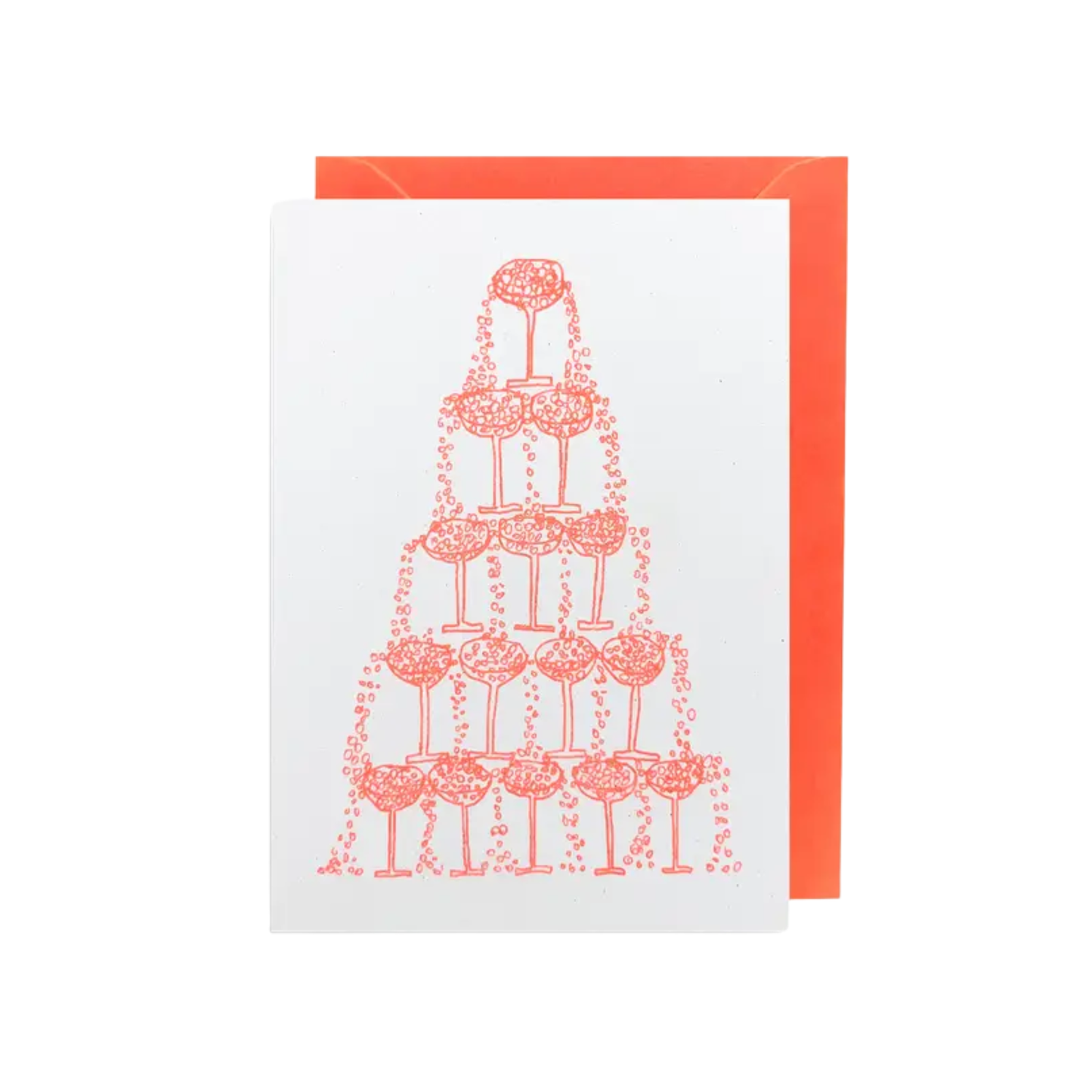 Nothing says congratulations like champagne! This champagne tower is printed using fluorescent orange ink. Risograph printed in our Glasgow studio on recycled paper using vibrant rice-bran based inks. The printing process means each card will vary slightly, which is part of the magic of riso-printing. Please note: this card is much more vibrant in real life! This A6 card comes with a fluorescent orange envelope with a biodegradable cello. Blank inside. Illustrated by Rachel Cannings.