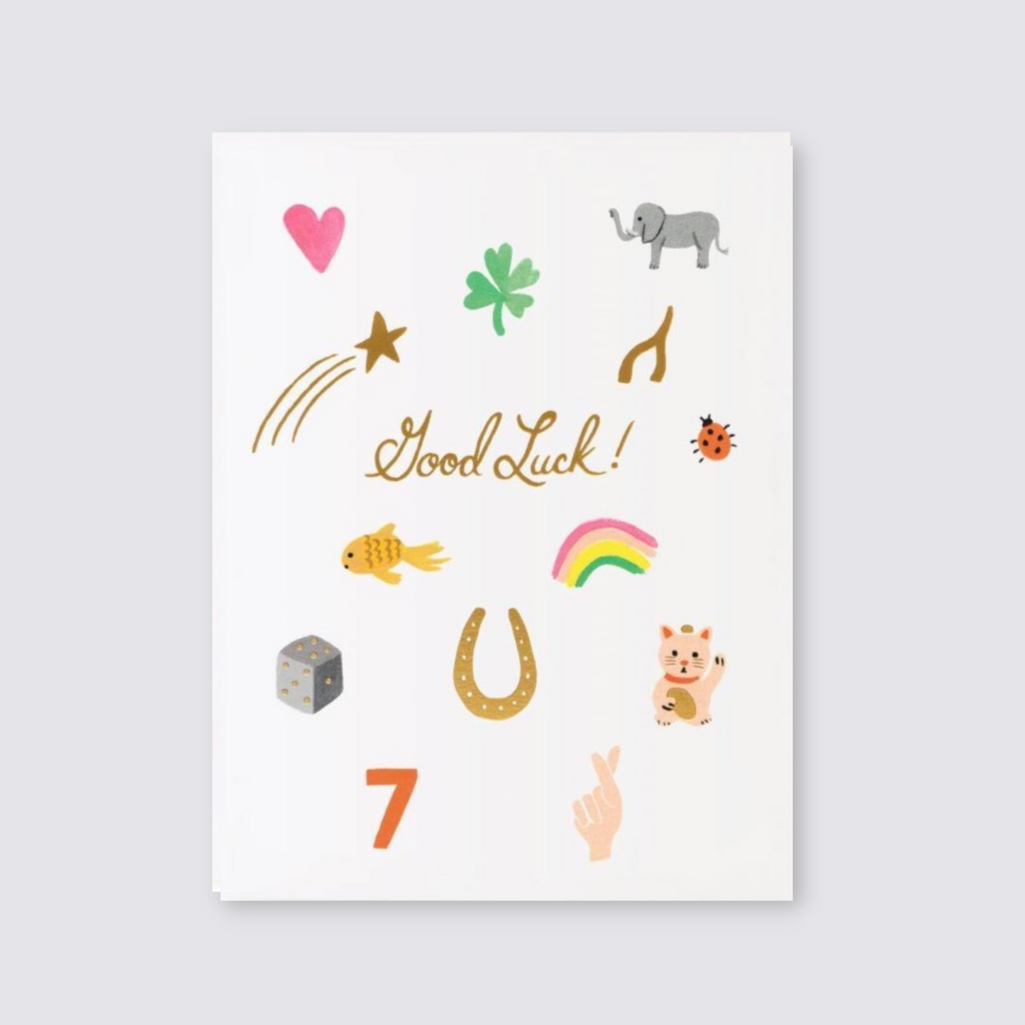 Greetings card printed on natural white cover paper with gold foil lettering.