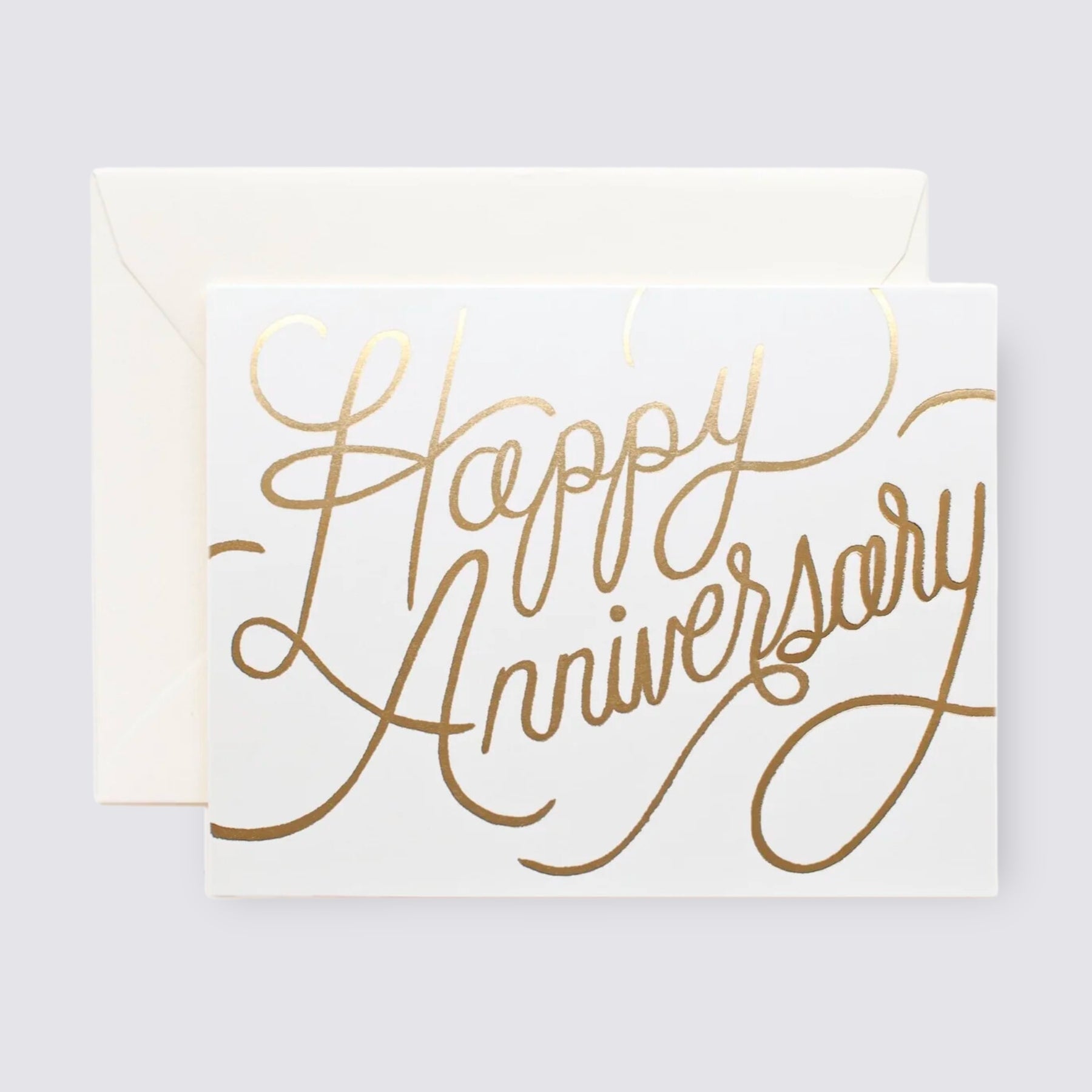 Greetings card printed on natural white cover paper with gold foil lettering.