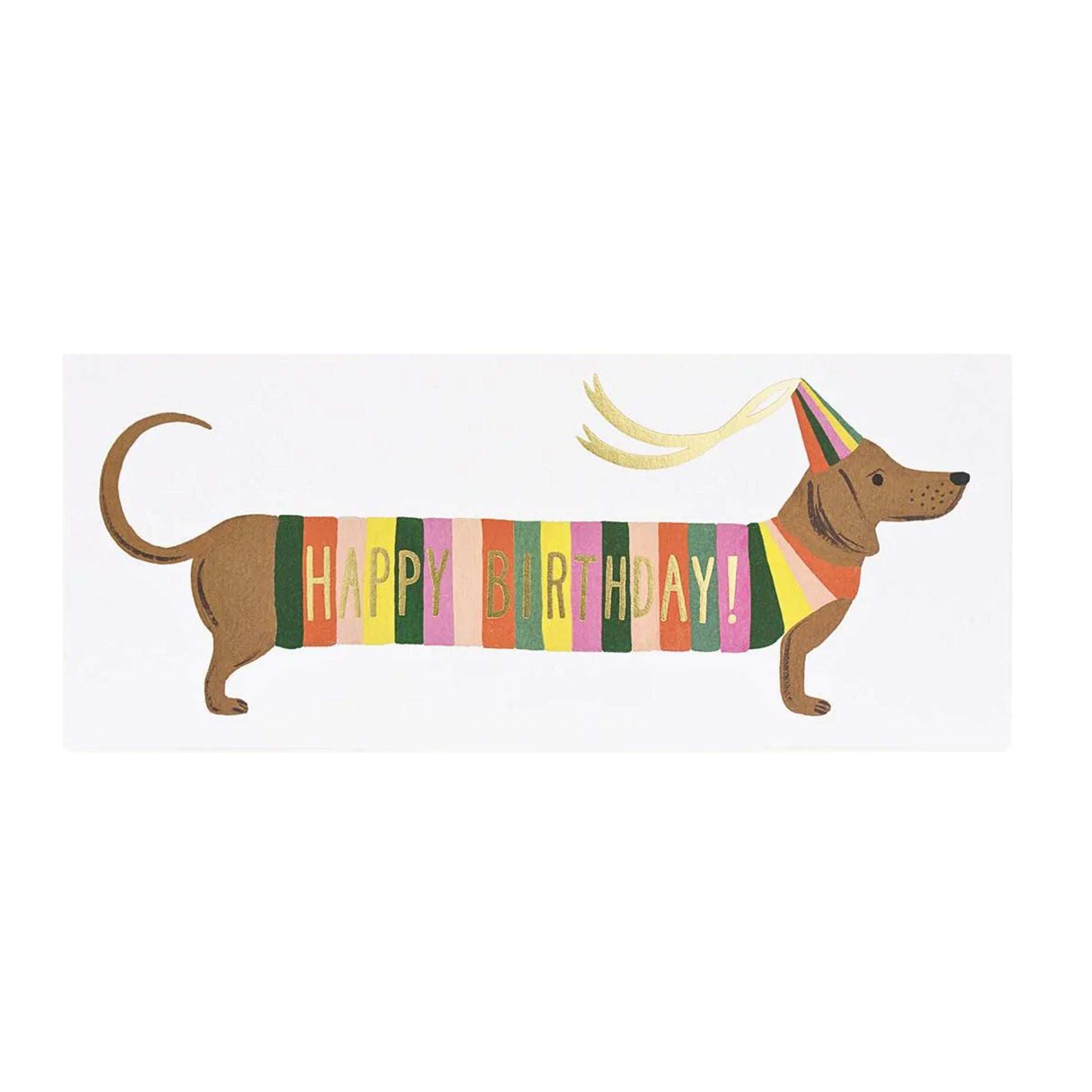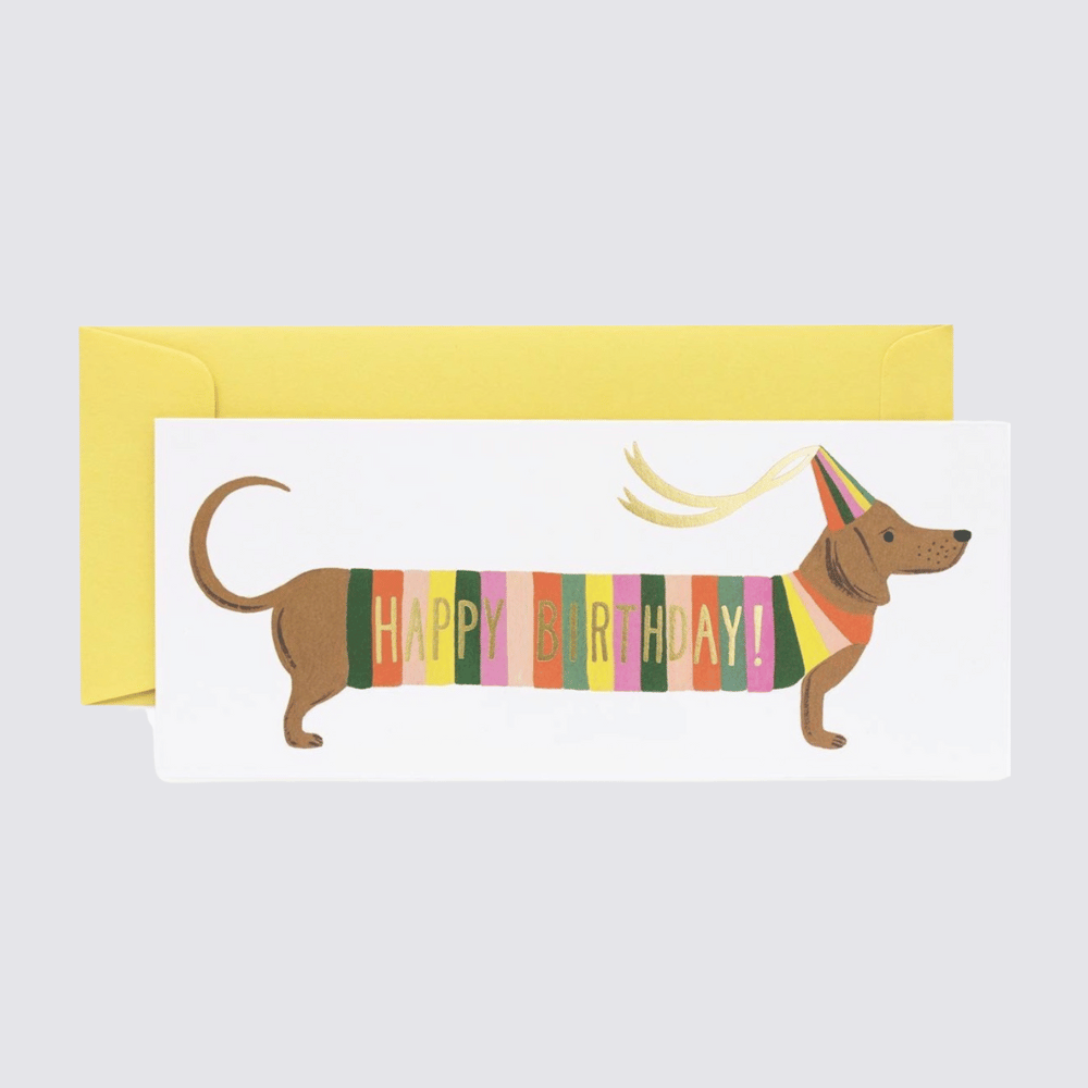 Say Happy Birthday with a card that is sure to stand out. Featuring a cute illustrated sausage dog wearing a party hat (of course!) this charming card adds a fun touch to any birthday celebration. The gold foil details add an extra special shine, and the blank interior provides plenty of room for a thoughtful personal greeting.