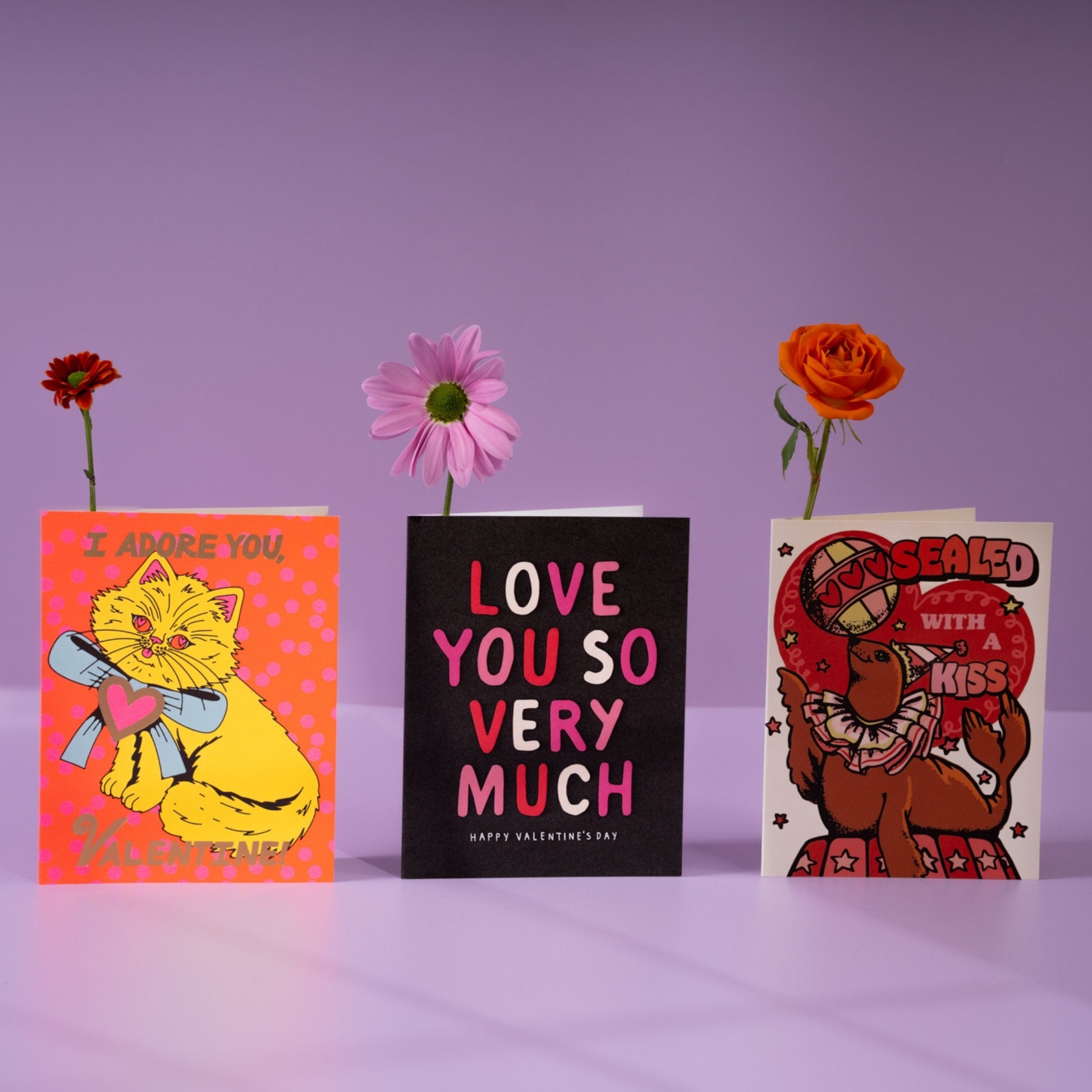 A retro kitty greetings card to say "I Adore You" this Valentine's Day with this bright and colourful card illustrated by Krista Perry.